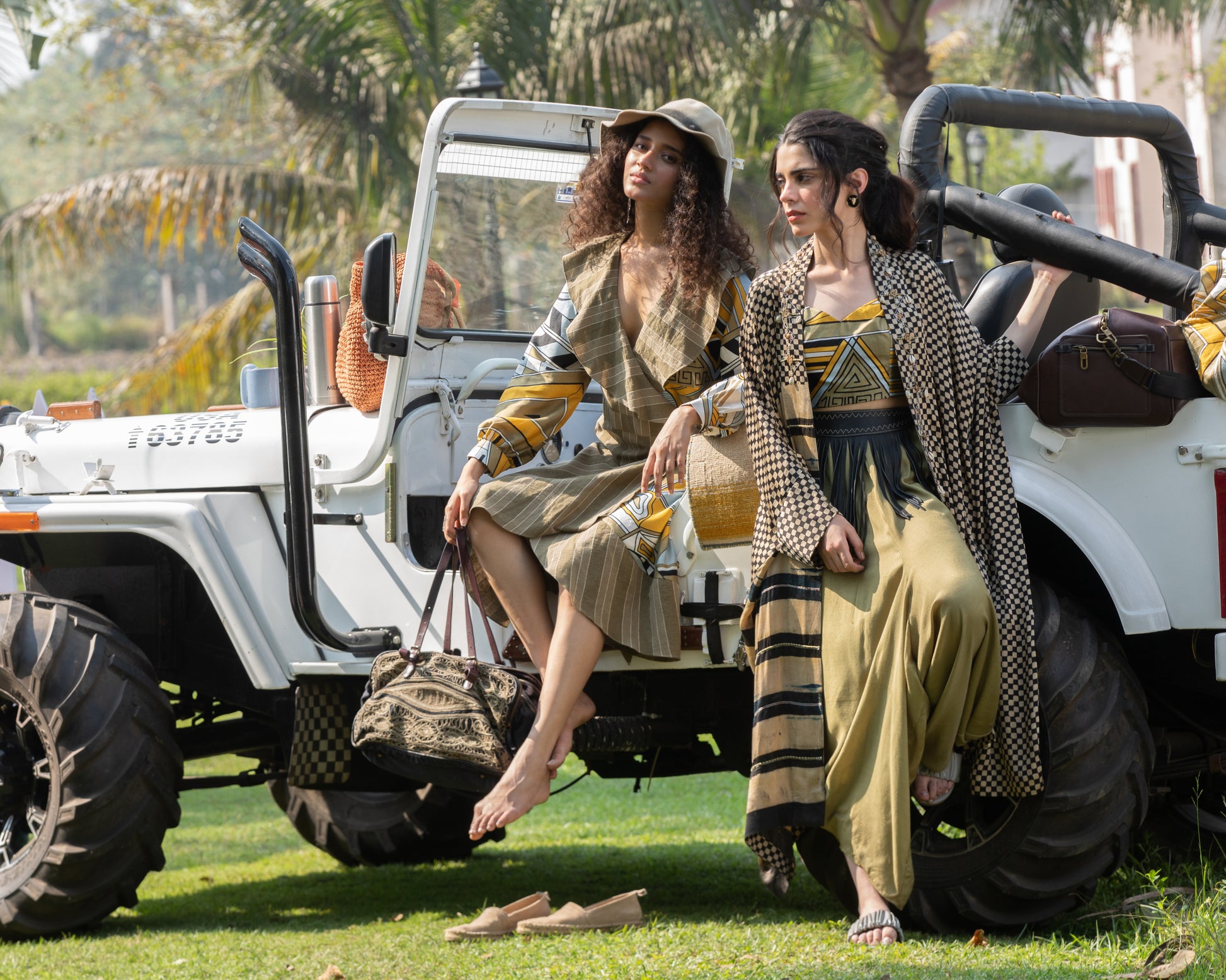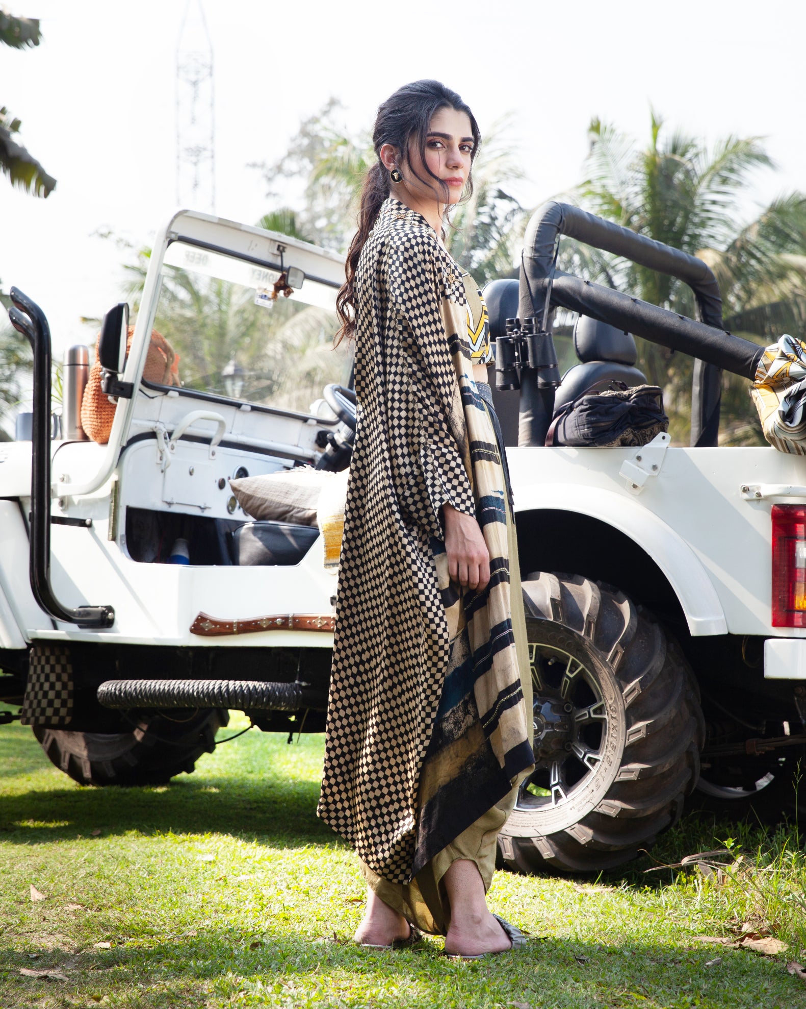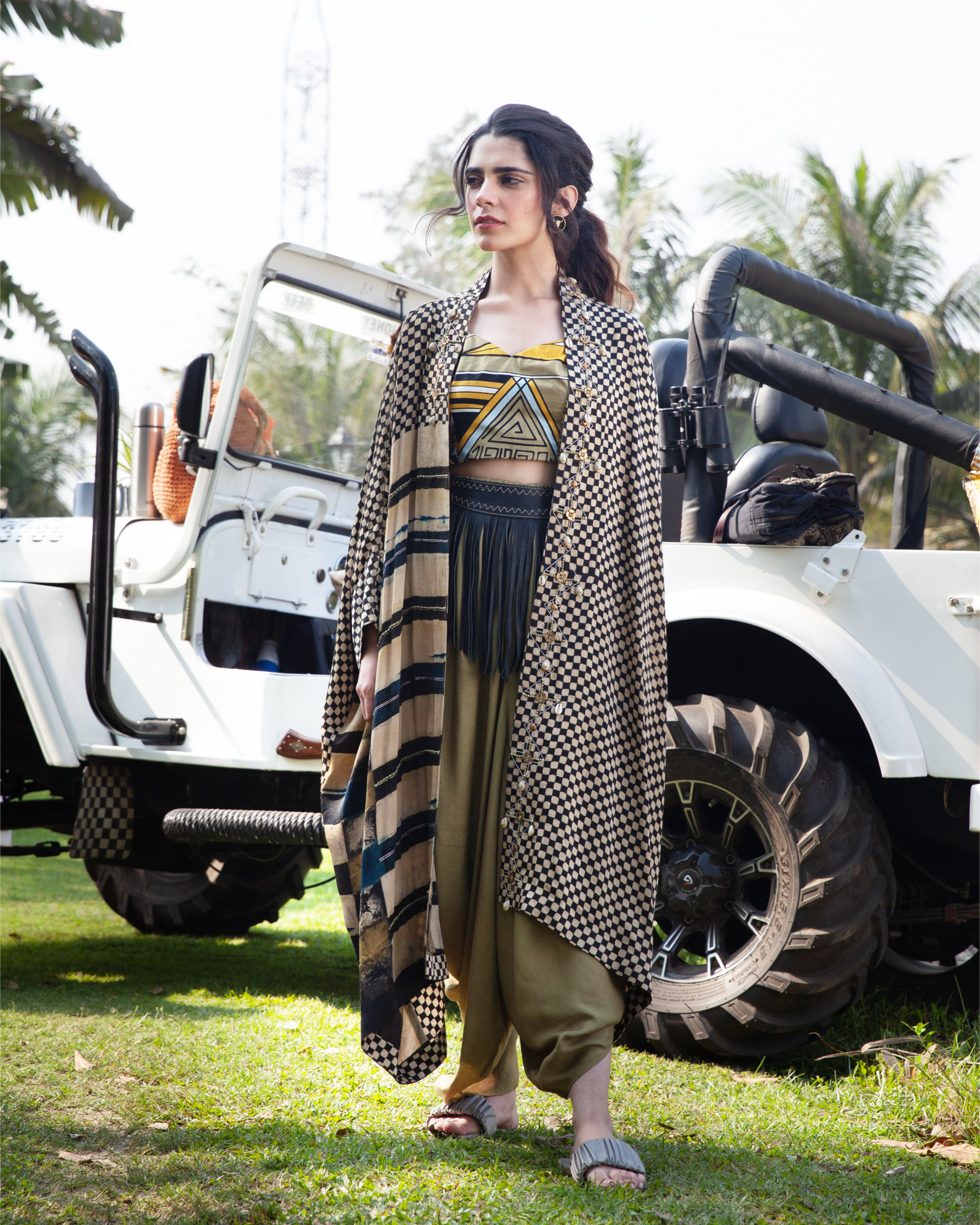 Embroidered check cape from the S/S’22 Collection has a relaxed fit with an open front. The checks are carefully block printed by the artisans of Gujarat using natural dyes which is then hand embroidered using cowrie shells and antique materials, inspired by African tribal masks. The bustier is hand-screen printed and paired with drape pants for a complete look.