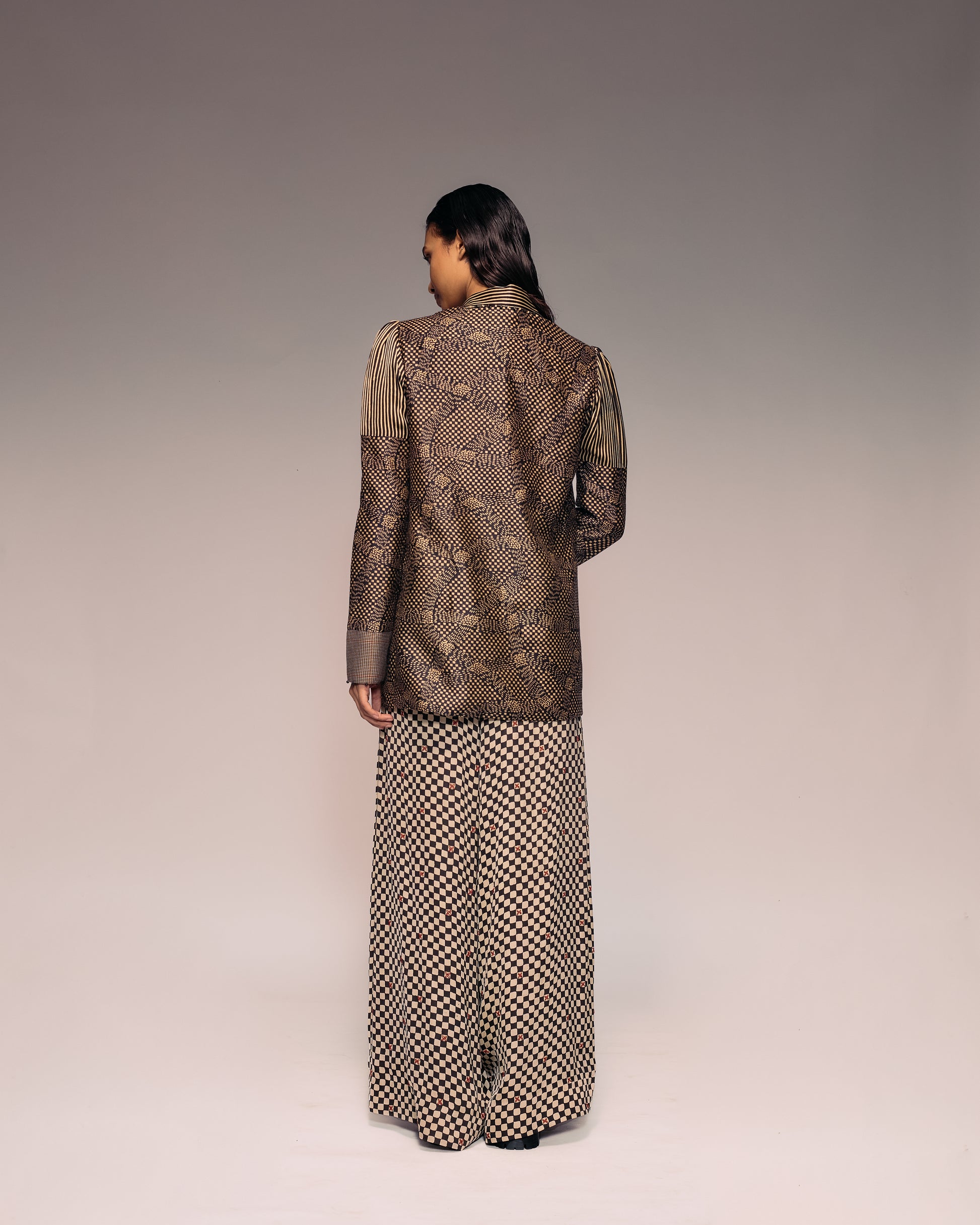 Crafted in luxurious silk satin, these Ajrakh Check Wide Trousers feature minimal embroidery and a fluid drape that moves gracefully. The check pattern blends traditional artistry with modern tailoring, offering an elegant relaxed silhouette. High-quality stitching ensures impeccable fall and durability. Pair them with a neutral top, crochet bralette, or crisp shirt for
