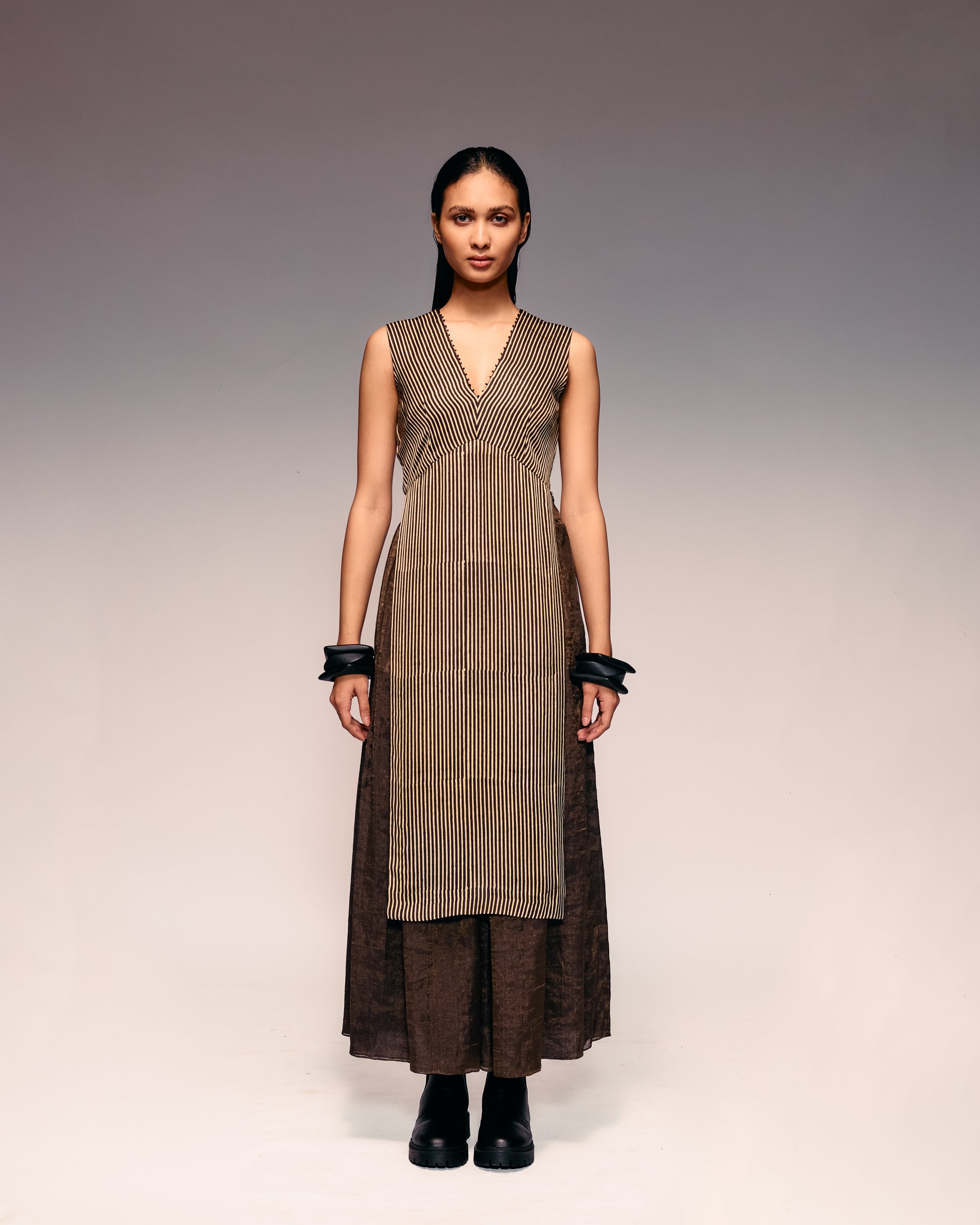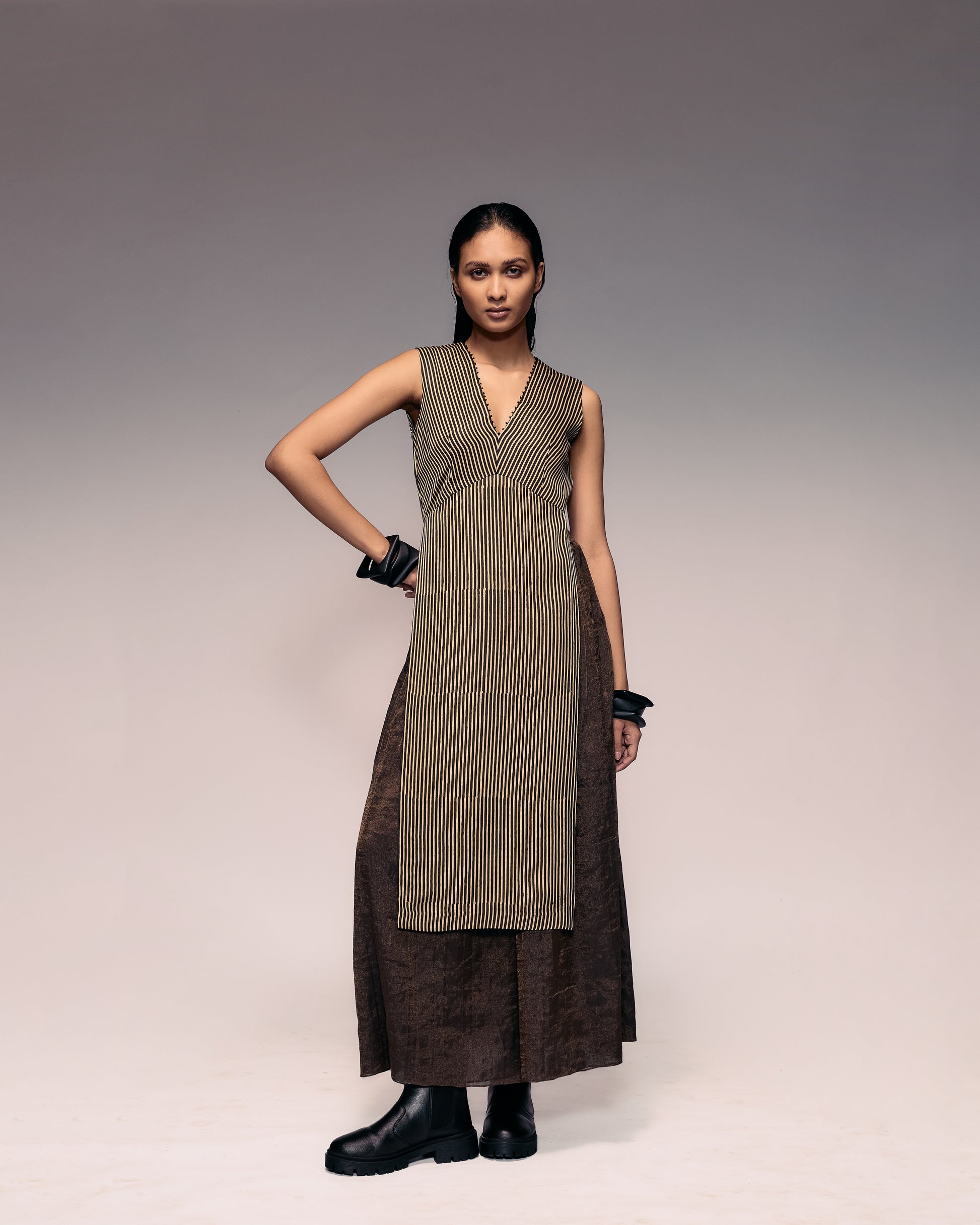 The stripe top brings heritage craft into a contemporary form with its hand-printed Ajrakh stripes on soft silk-cotton fabric. The side zipper ensures a clean fit, while precise stitching highlights its tailored appeal. Its timeless pattern make it both statement and staple. Pair it with handloom skirts, patch trousers, or solid midis for refined styling. Perfect for contemporary attire or chic look in transitional seasons.