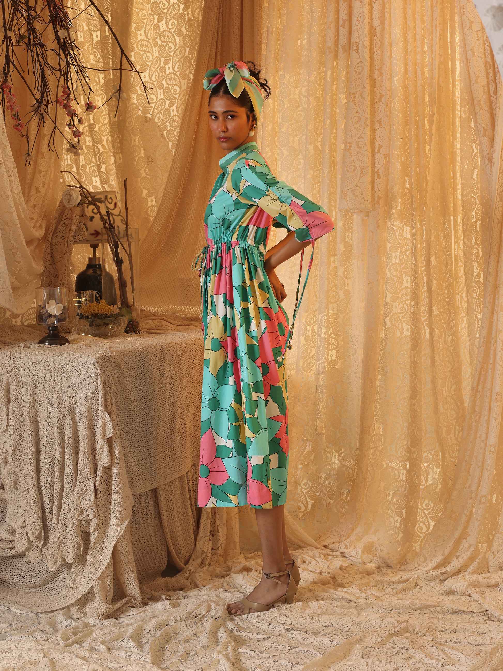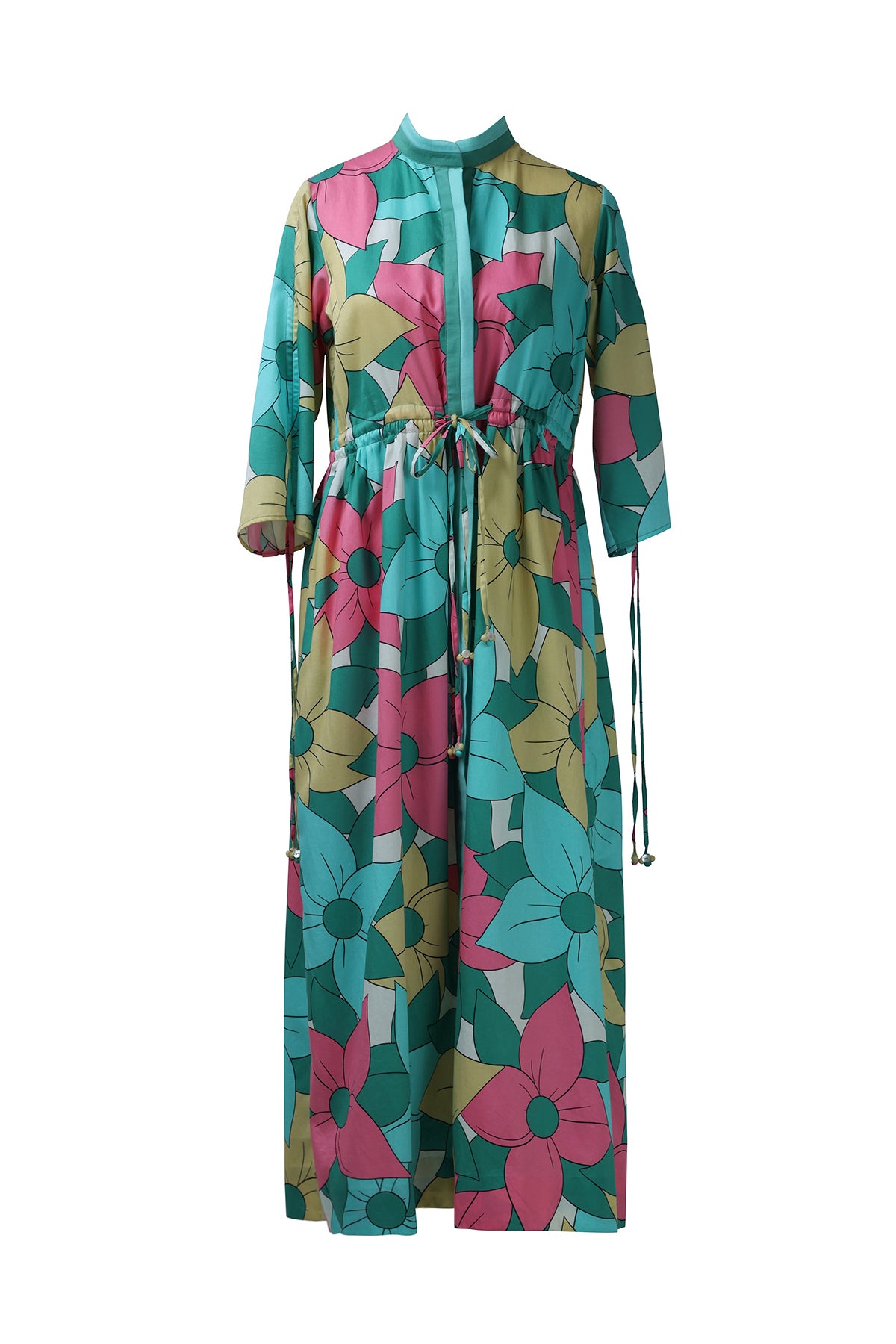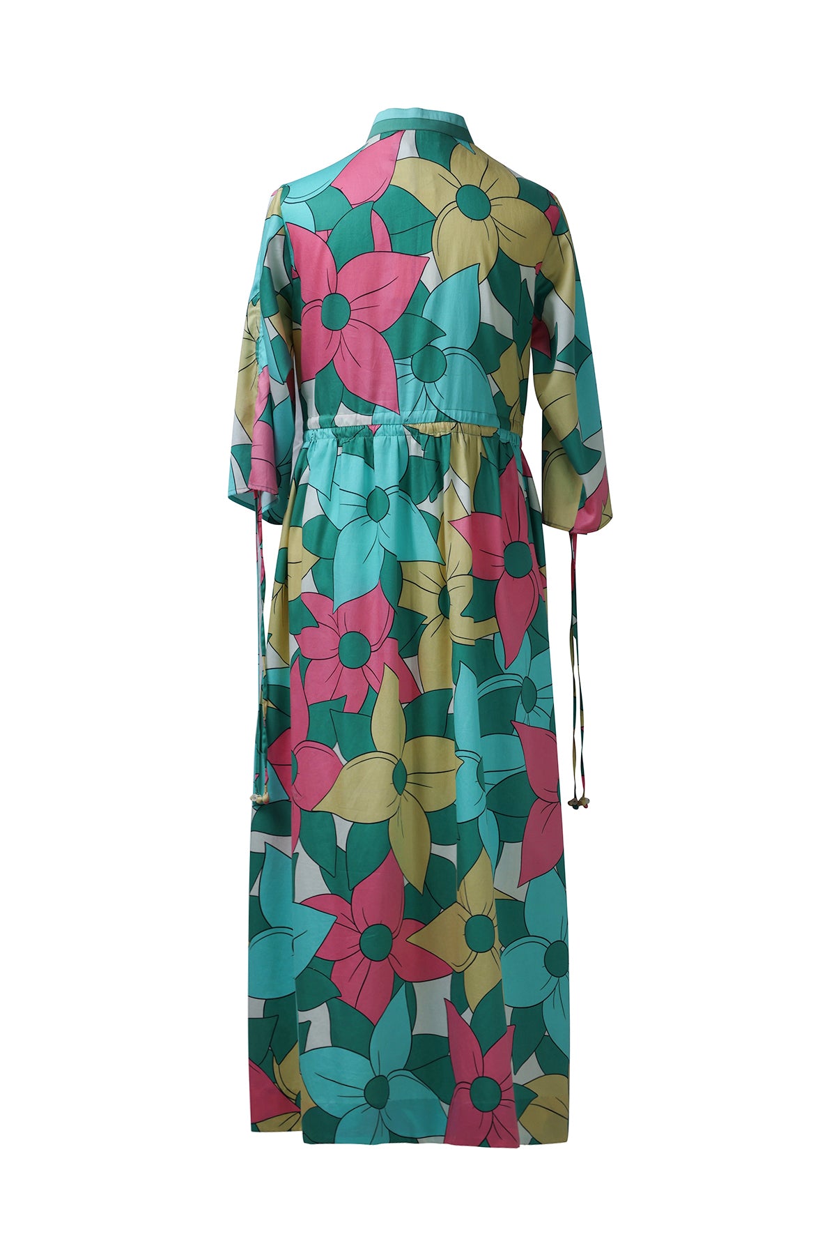 Make a vibrant entrance in this statement dress featuring oversized multicolor florals on soft cotton. With a front button placket and drawstring waist, it offers both adjustability and flair. This piece balances boldness with ease, making it your go-to for tropical escapes or festive