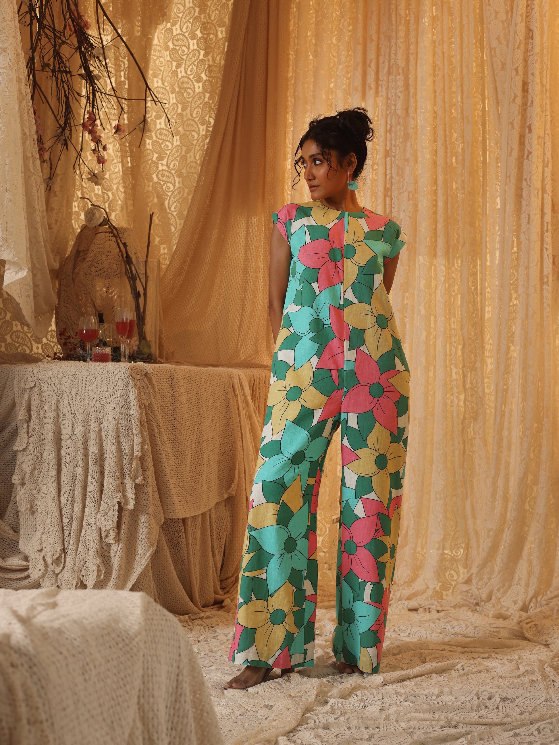 Step into effortless elegance with this striking one-piece wonder. Crafted in breathable linen, the jumpsuit features oversized multicolor floral prints that command attention without overwhelming. Designed with a relaxed yet tailored silhouette, it offers comfort and bold style in equal measure. Ideal for beach dinners, garden parties, or fashion-forward getaways, it’s your all-in-one outfit for instant impact.