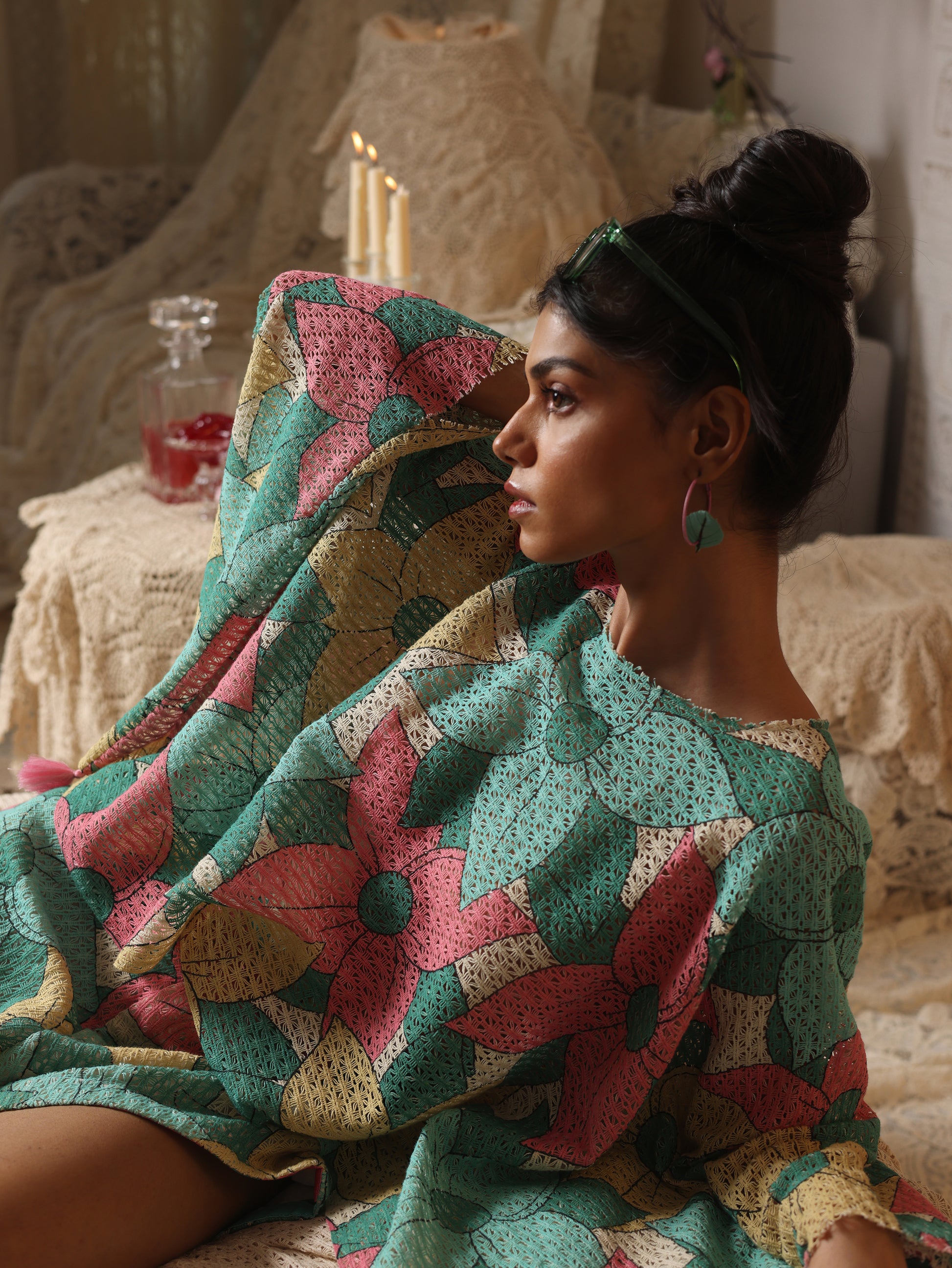 Easy, airy, and endlessly stylish—this kaftan top in oversized floral print is a vacation dream. Crafted in breathable cotton net, the kaftan features loose, flowy sleeves and a relaxed silhouette. A go-to for pool parties, resort lounging, or beachside breakfast.
