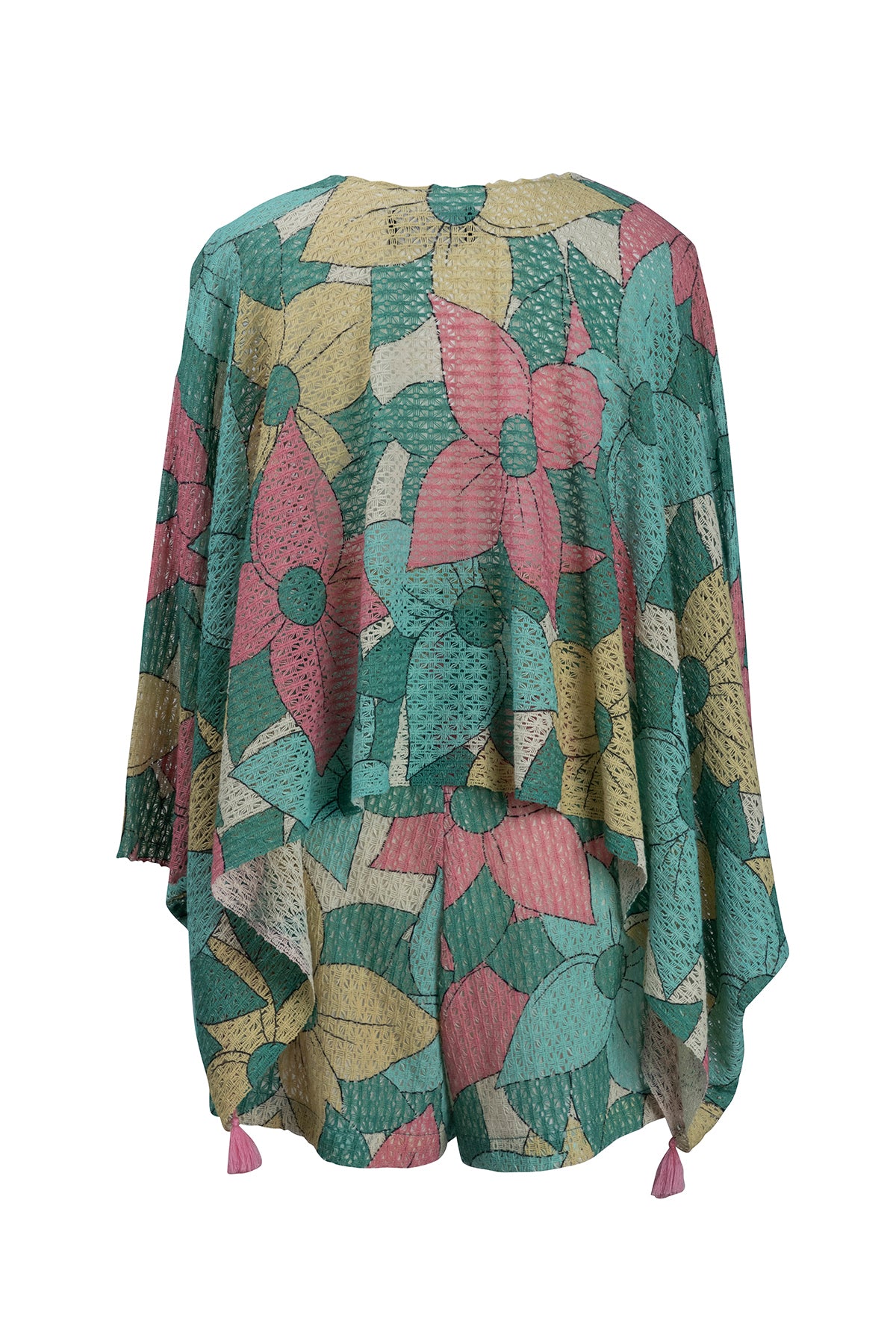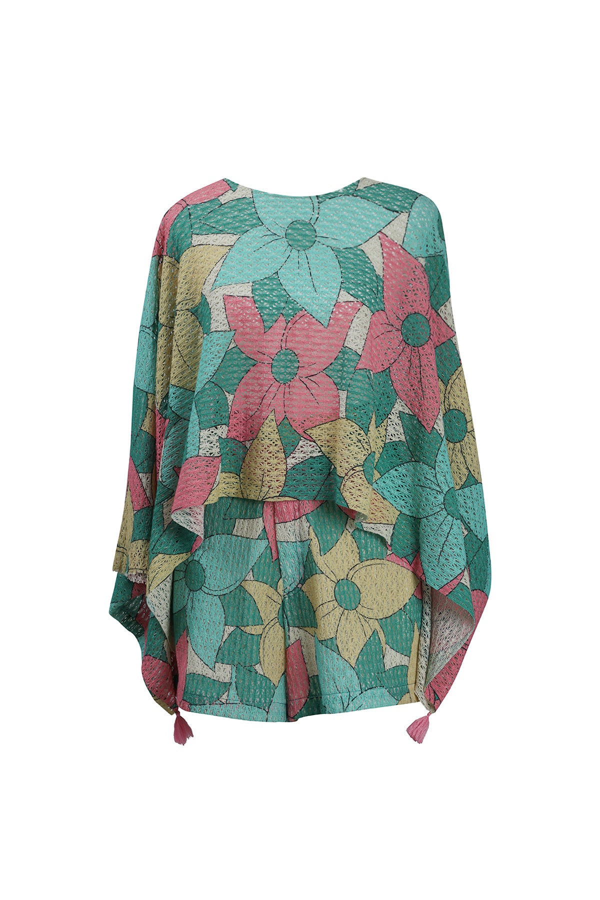Easy, airy, and endlessly stylish—this kaftan top and short set in oversized floral print is a vacation dream. Crafted in breathable cotton net, the kaftan features loose, flowy sleeves and a relaxed silhouette, while the matching shorts add playfulness and comfort. A go-to set for pool parties, resort lounging, or beachside breakfast.