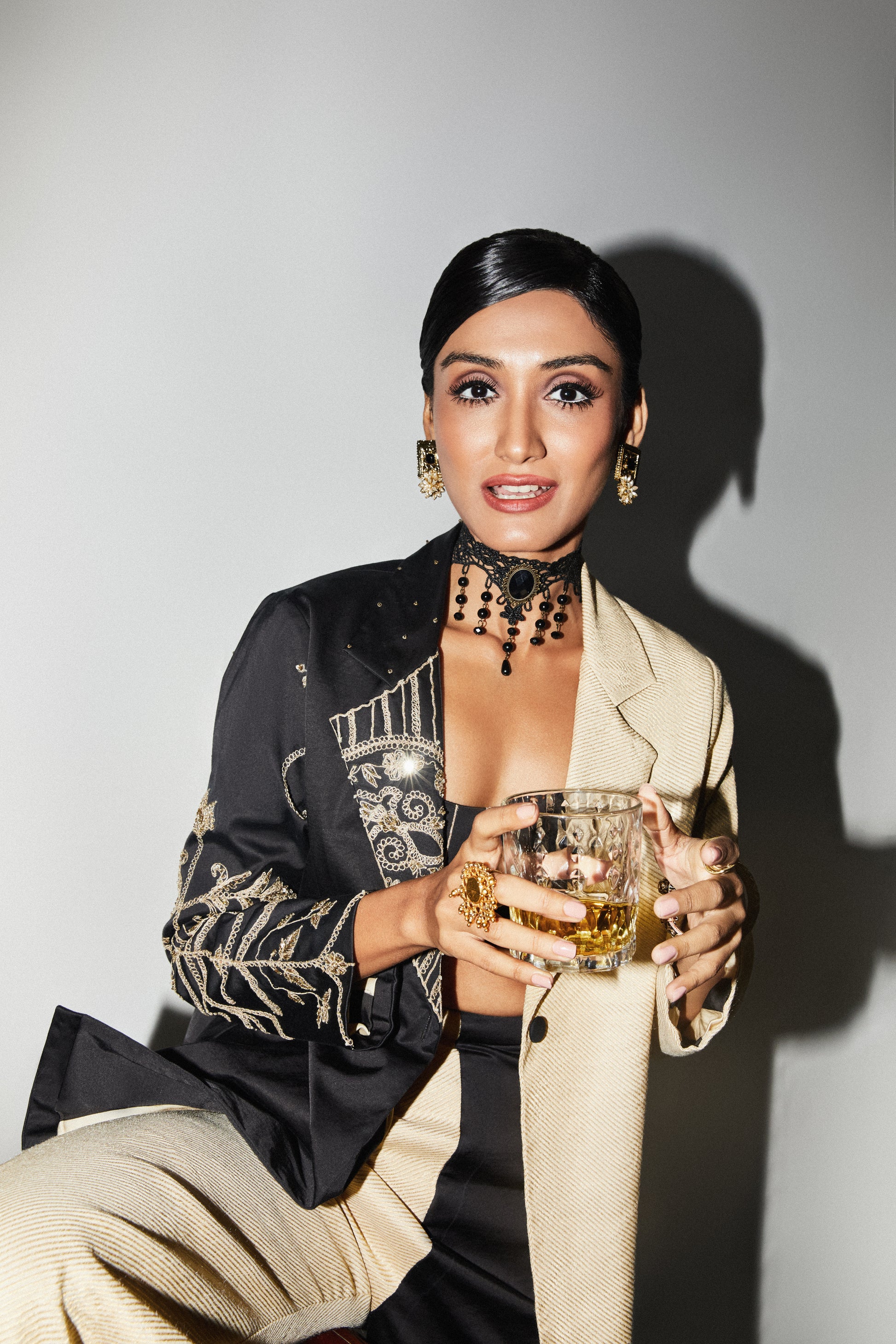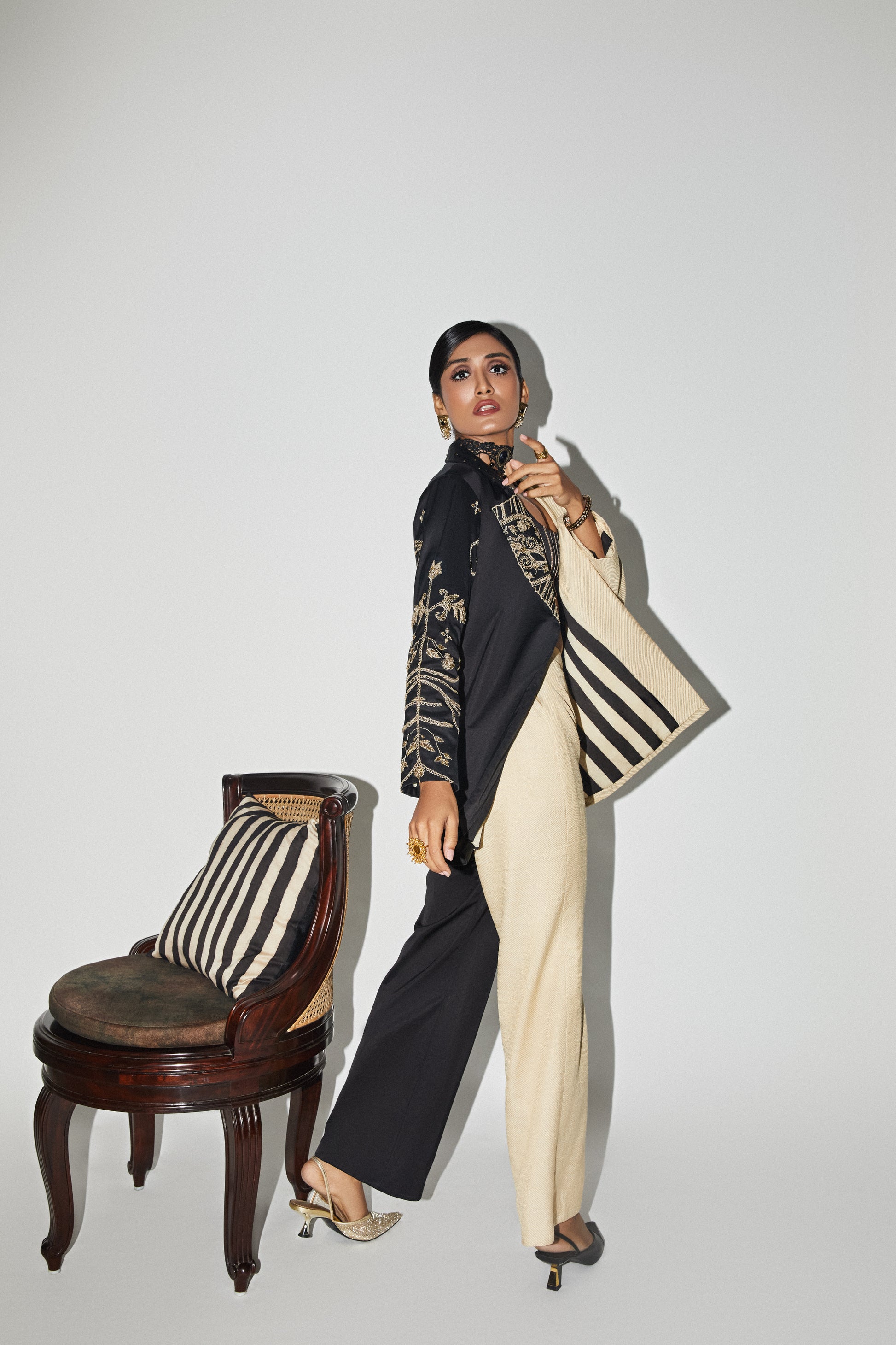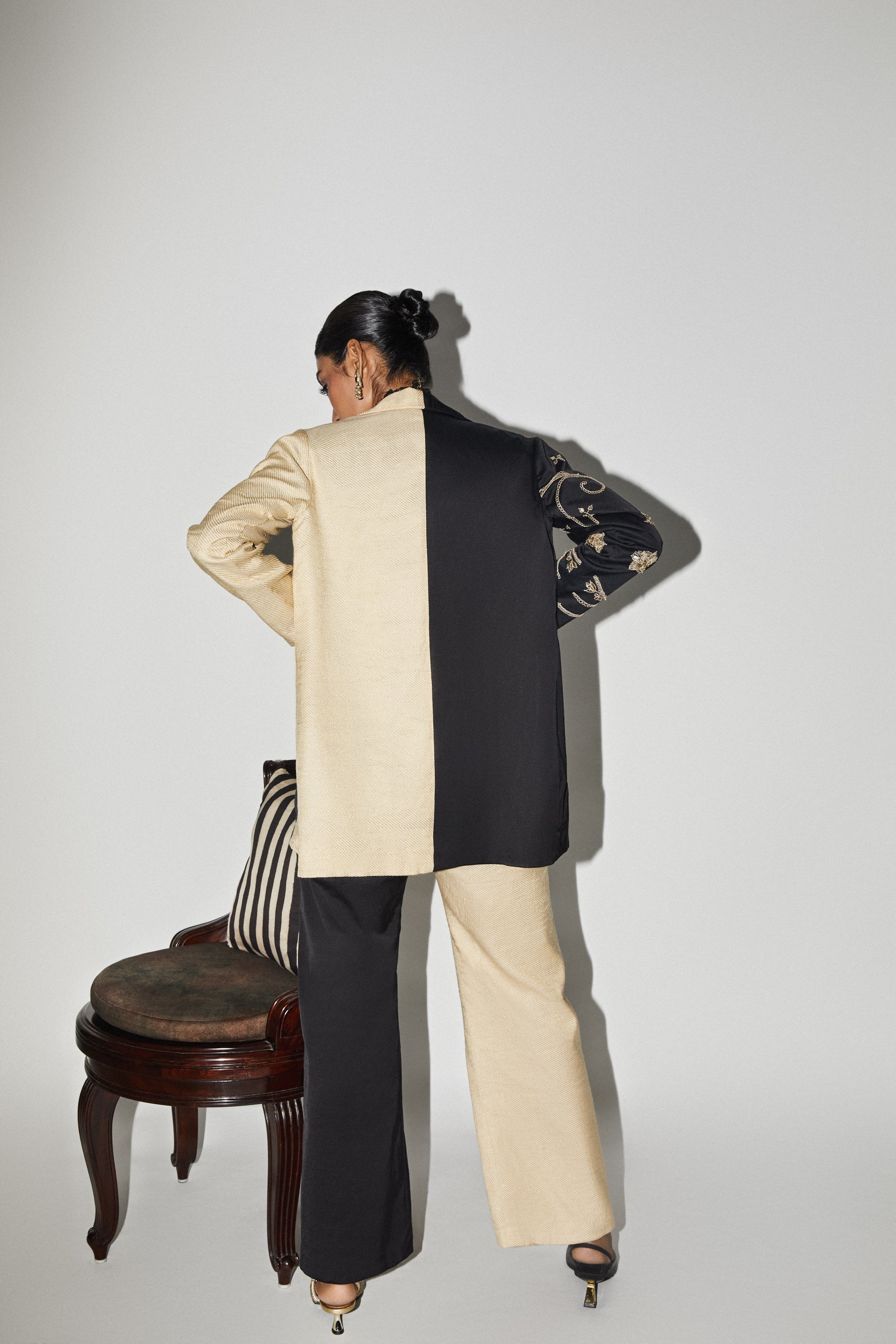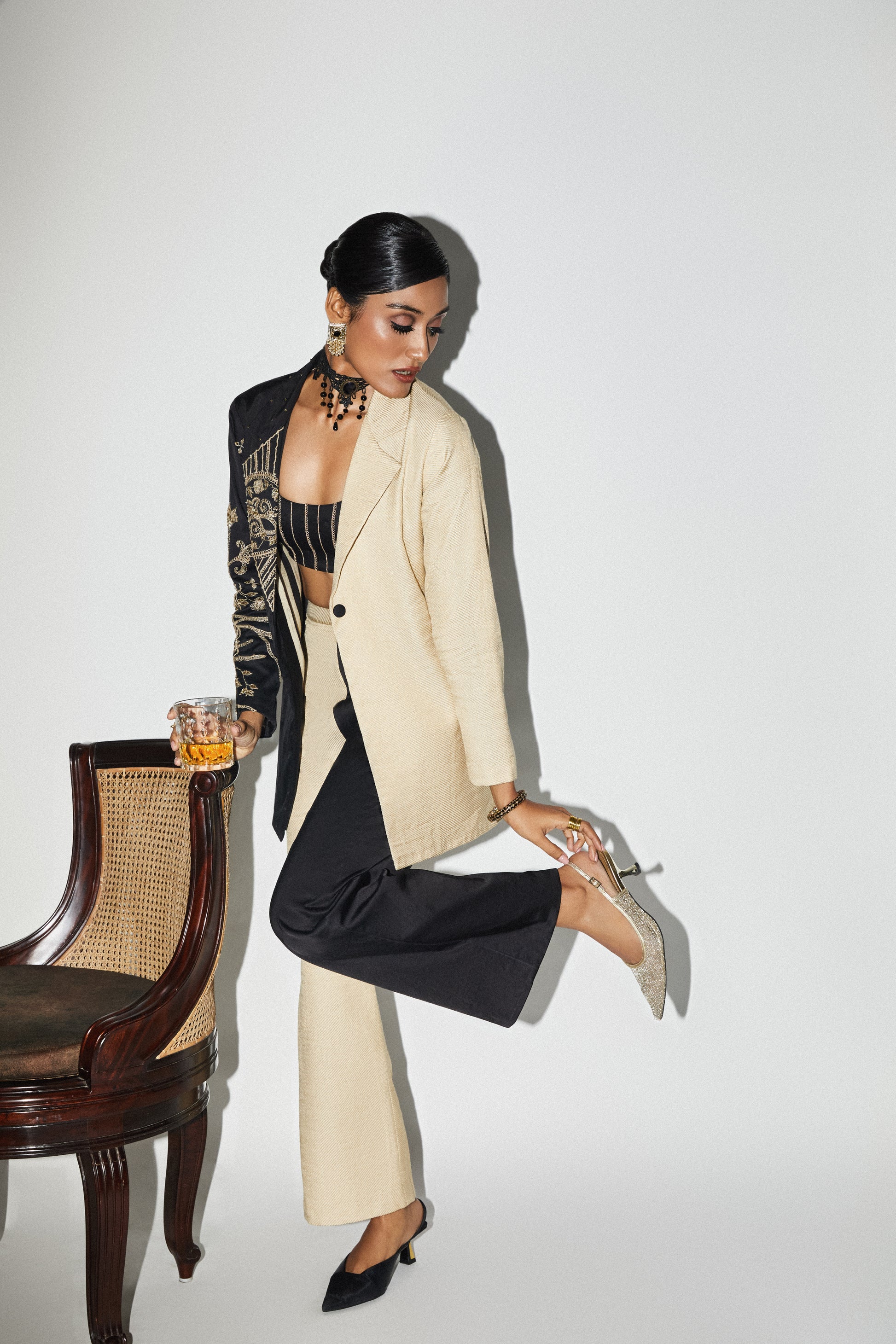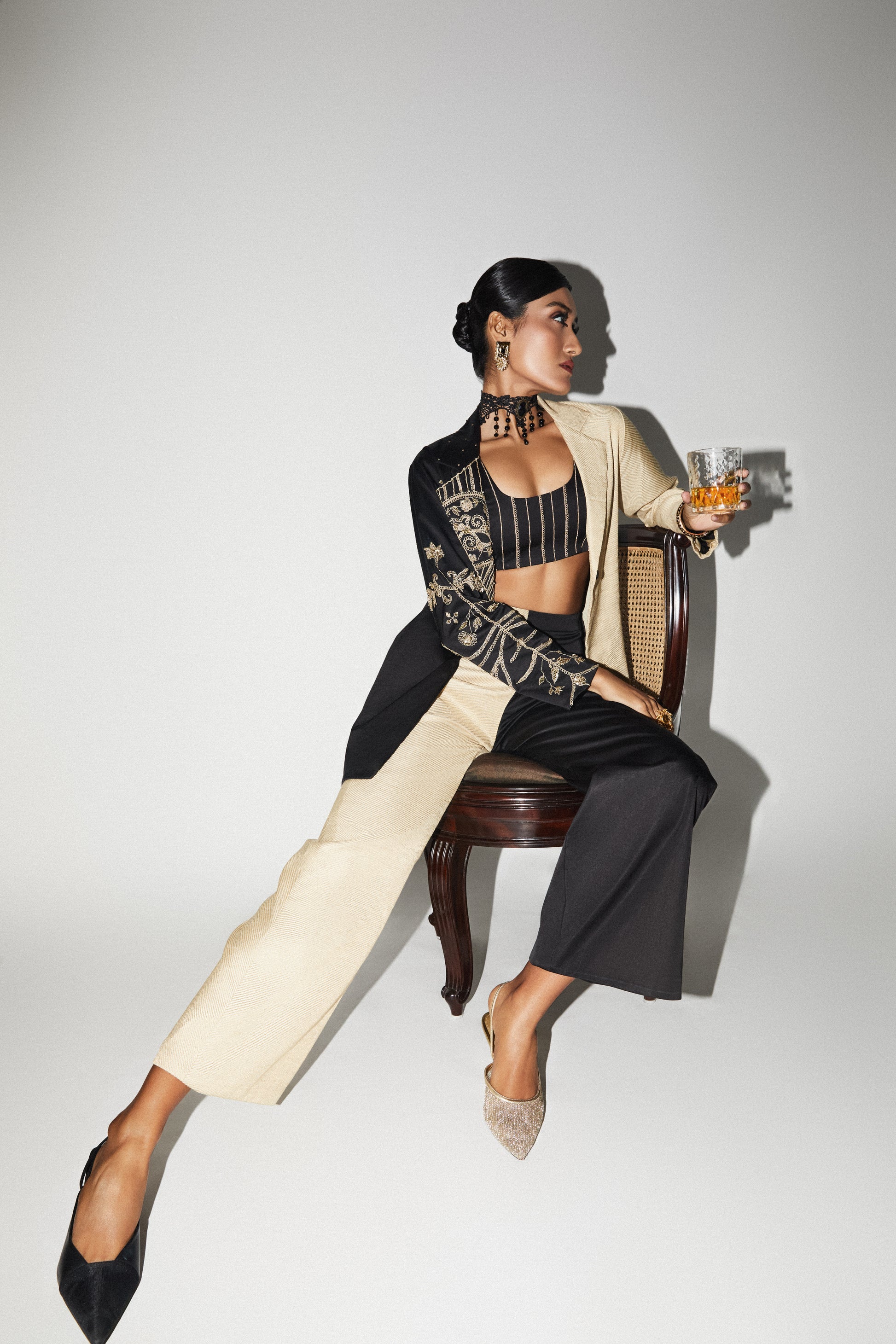 Made of two different fabrics, this blazer has a classic tailored silhouette embellished with thread and sequins embroidery. Pair yours with the same style pants and stripe embroidered blouse featuring round neck and thin strap to accent its details.