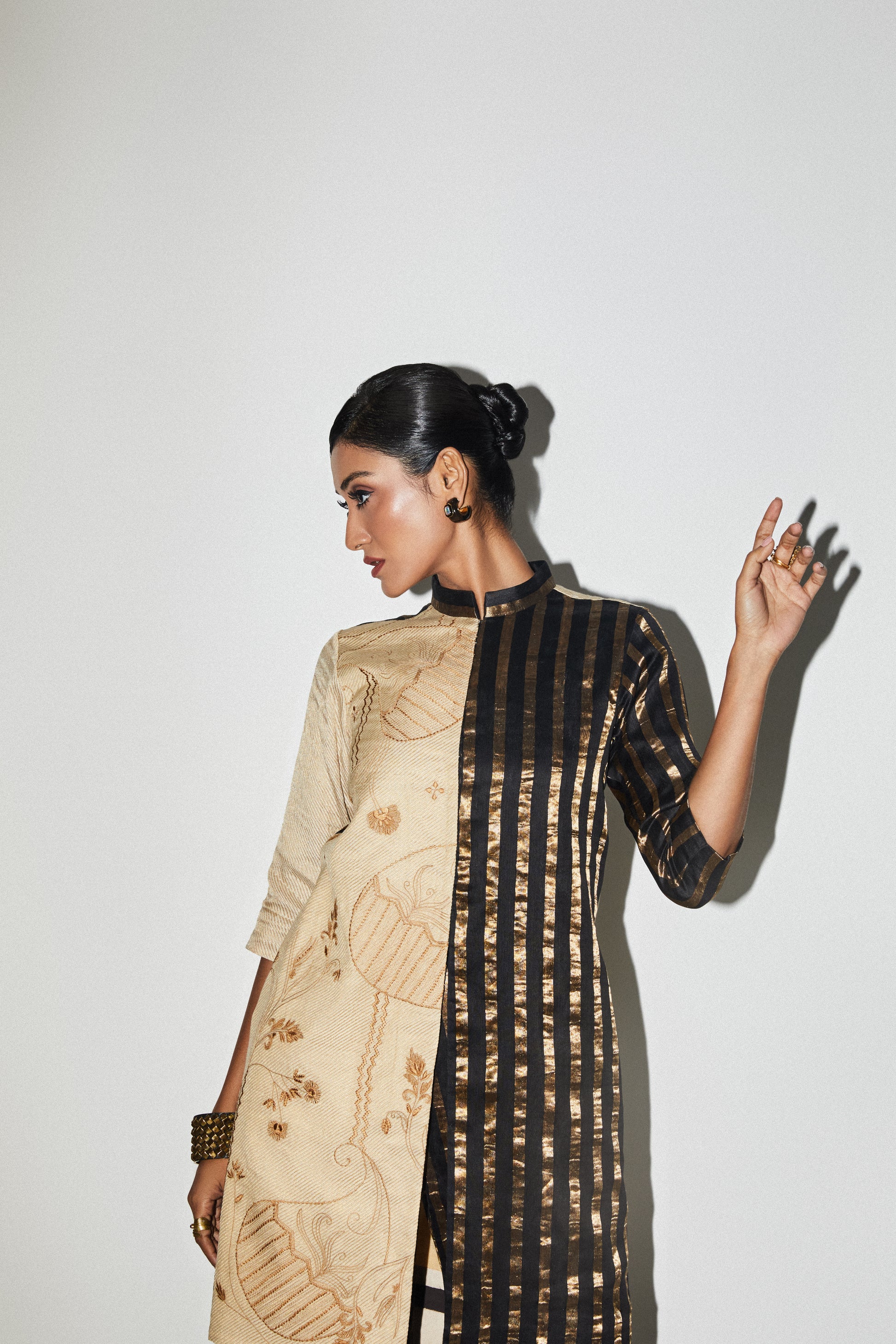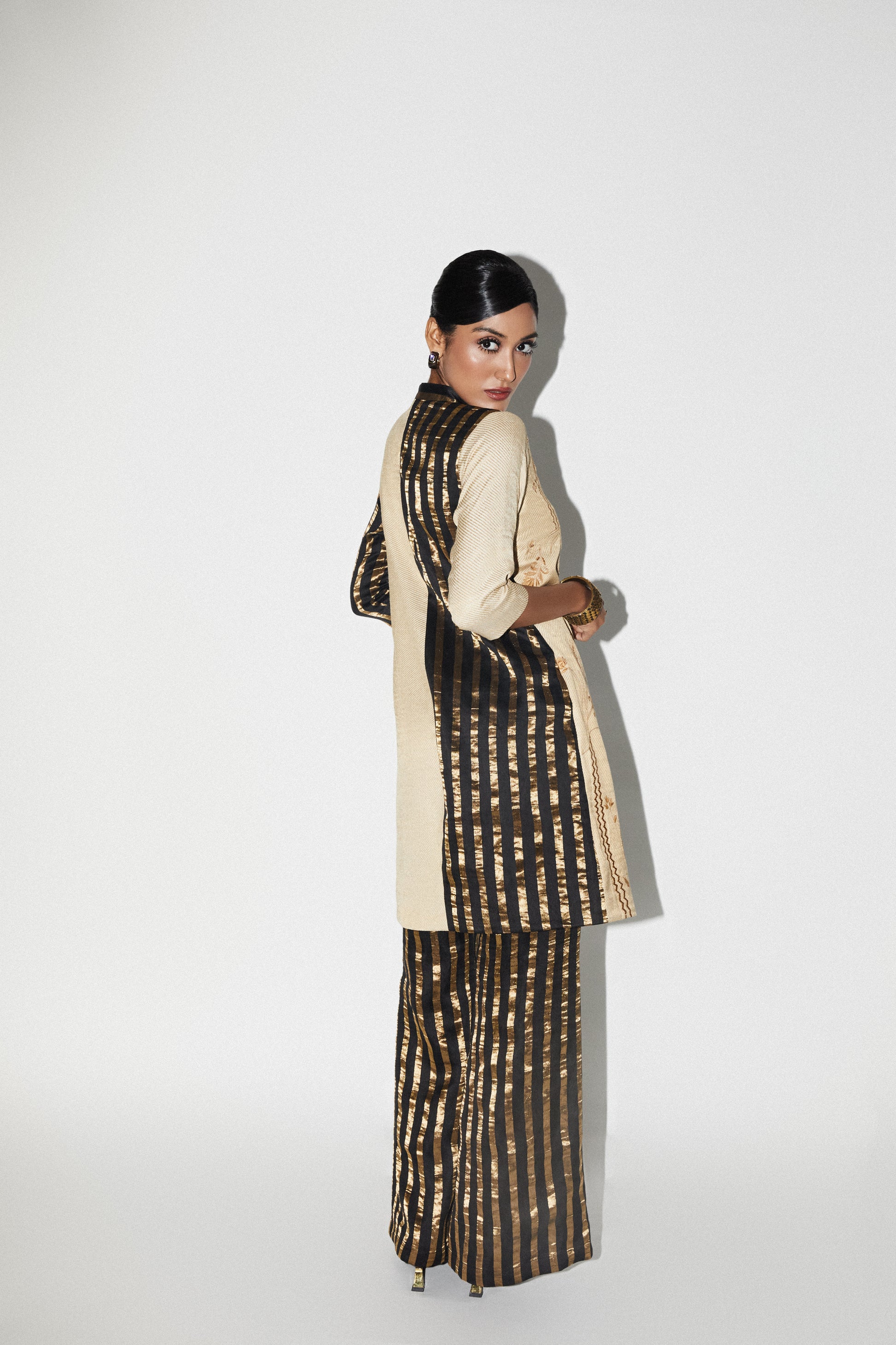 Black & Gold Embroidered Silk Long Jacket Pant Set