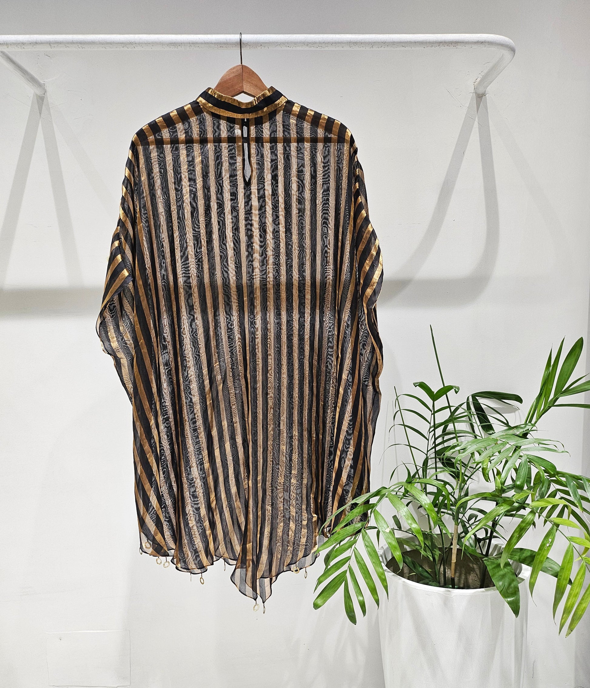 Black Gold Stripe organza silk in a batwing silhouette.