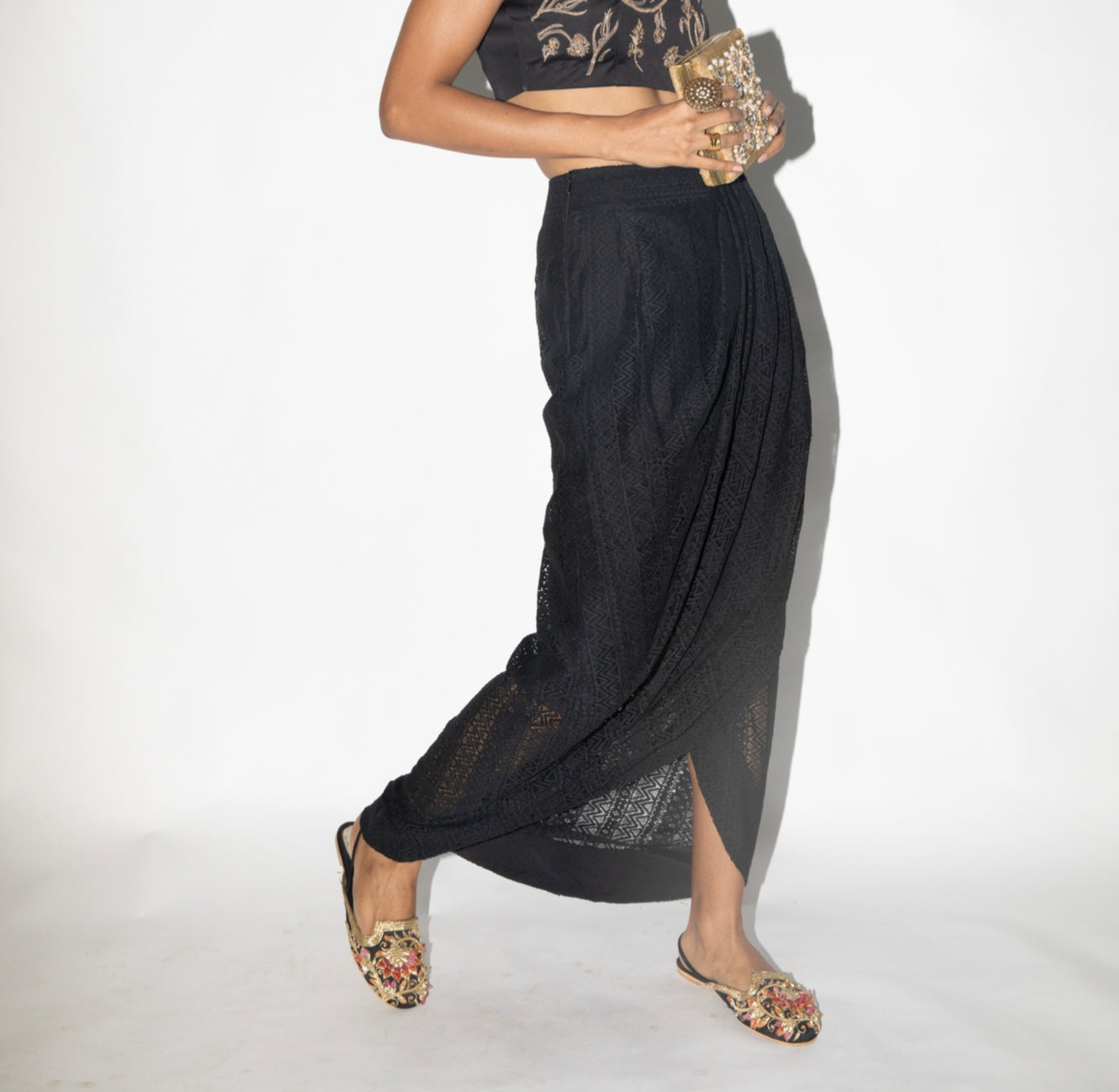 The skirt has a body-skimming, draped silhouette constructed with lace fabric. Team it up with tunics and tops for an elegant event look.