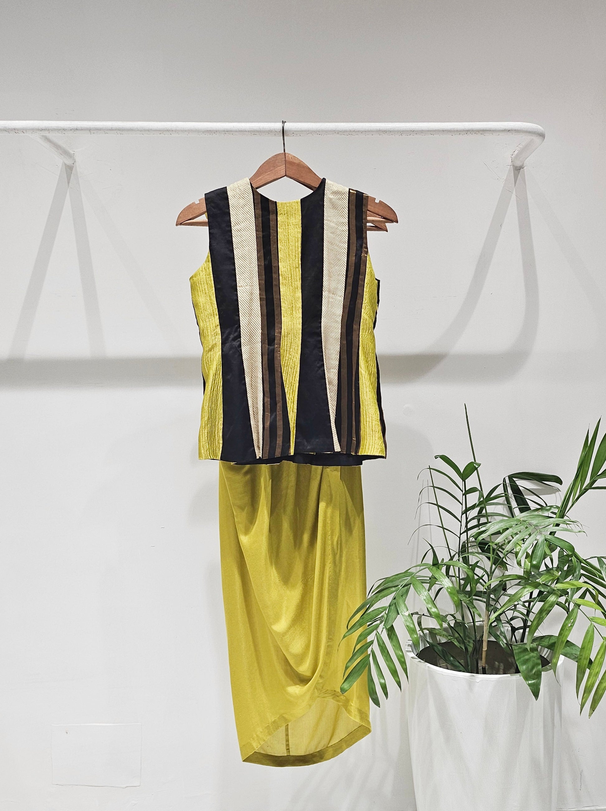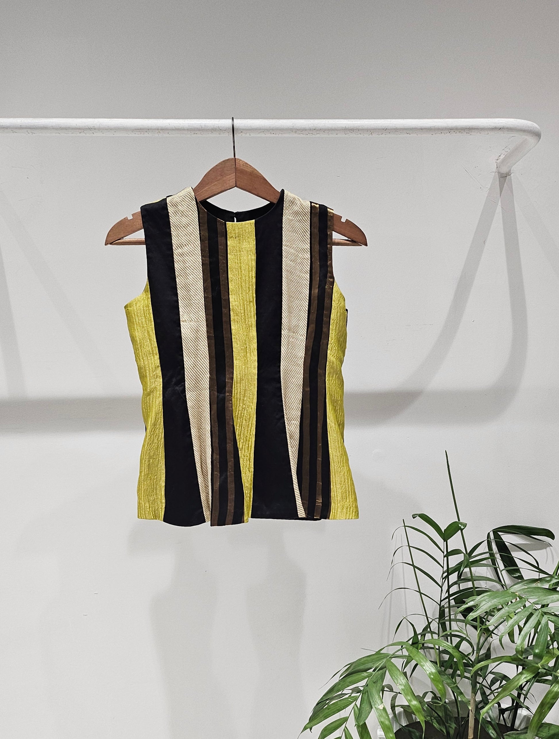 Made from an amalgamation of fabrics, this sleeveless top is a colour-blocked collage of panel inserts of various hues. Style yours with our black gold organza stripe pants or lime drape skirt.