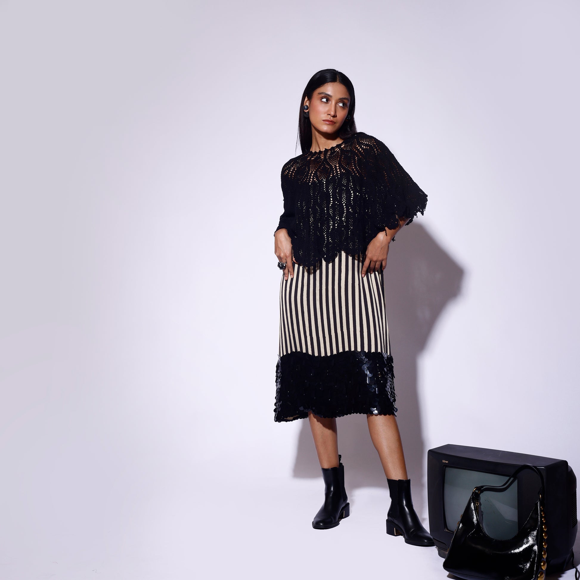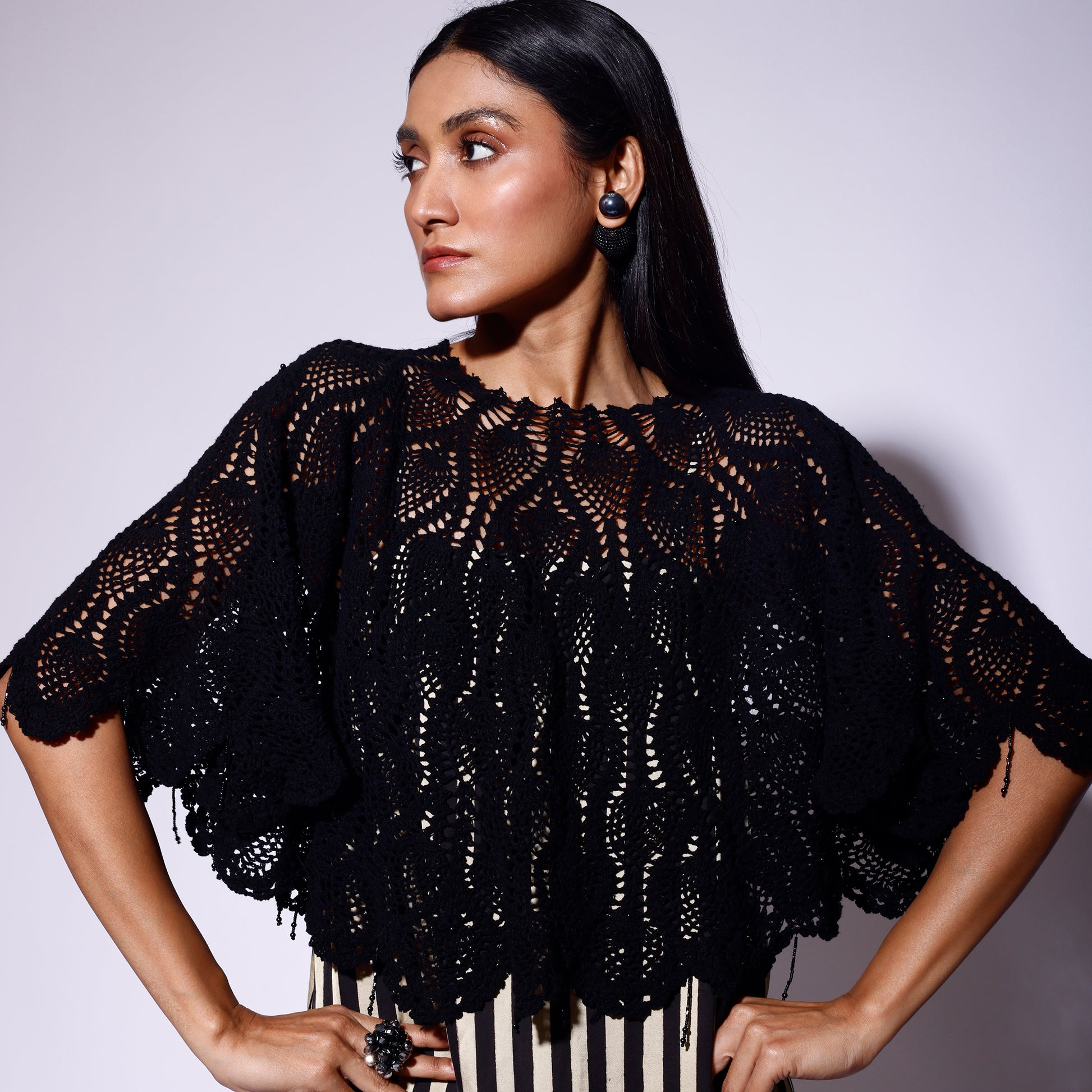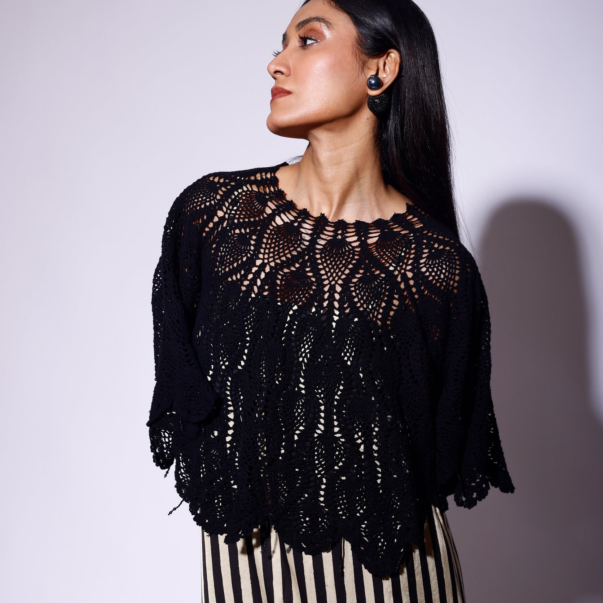 This black crochet top with pearl detailing is an exquisite fusion of texture and elegance. The delicate crochet weave paired with pearls creates a sophisticated, elevated look—perfect for pairing with dresses, skirts, trousers, or jeans for a refined yet edgy ensemble.