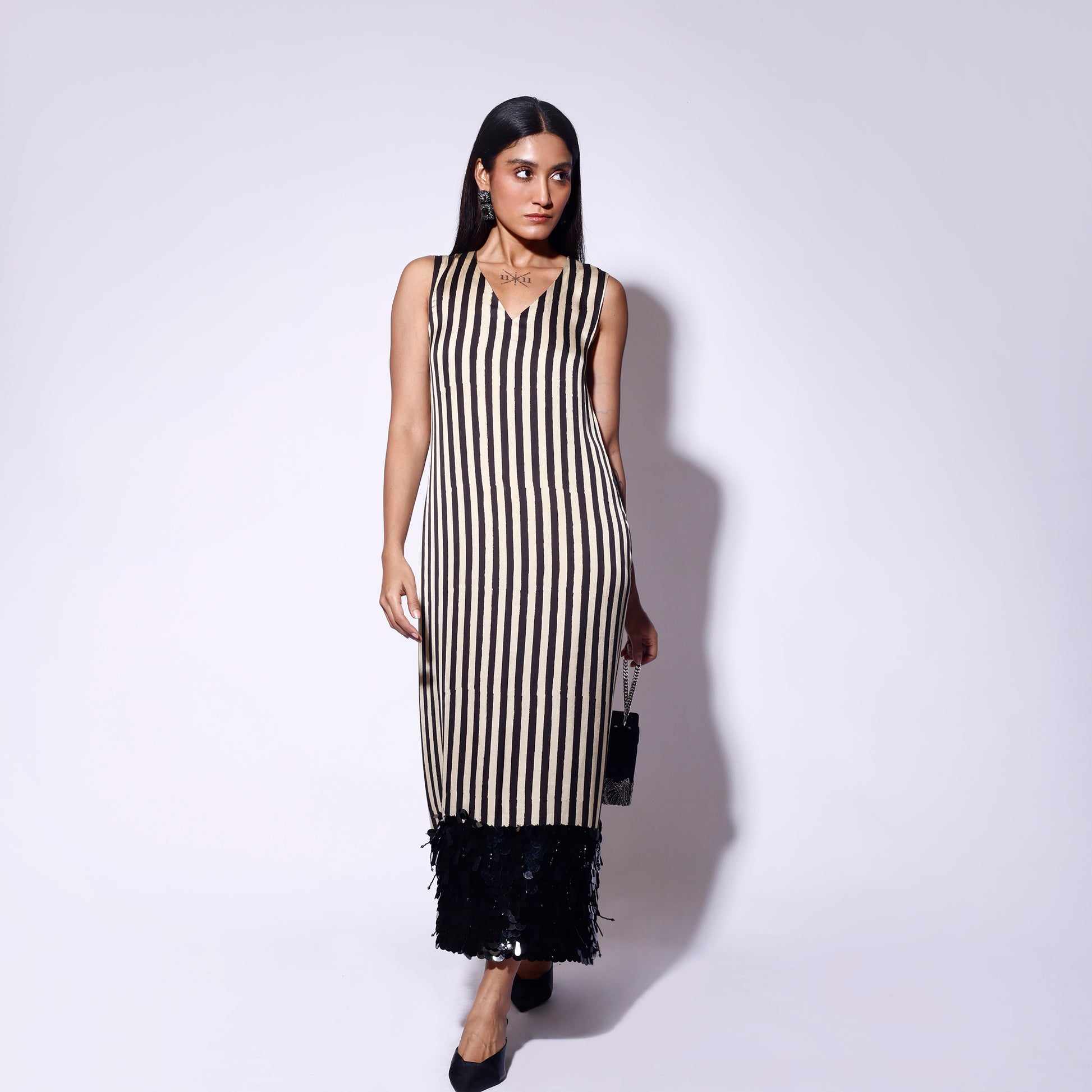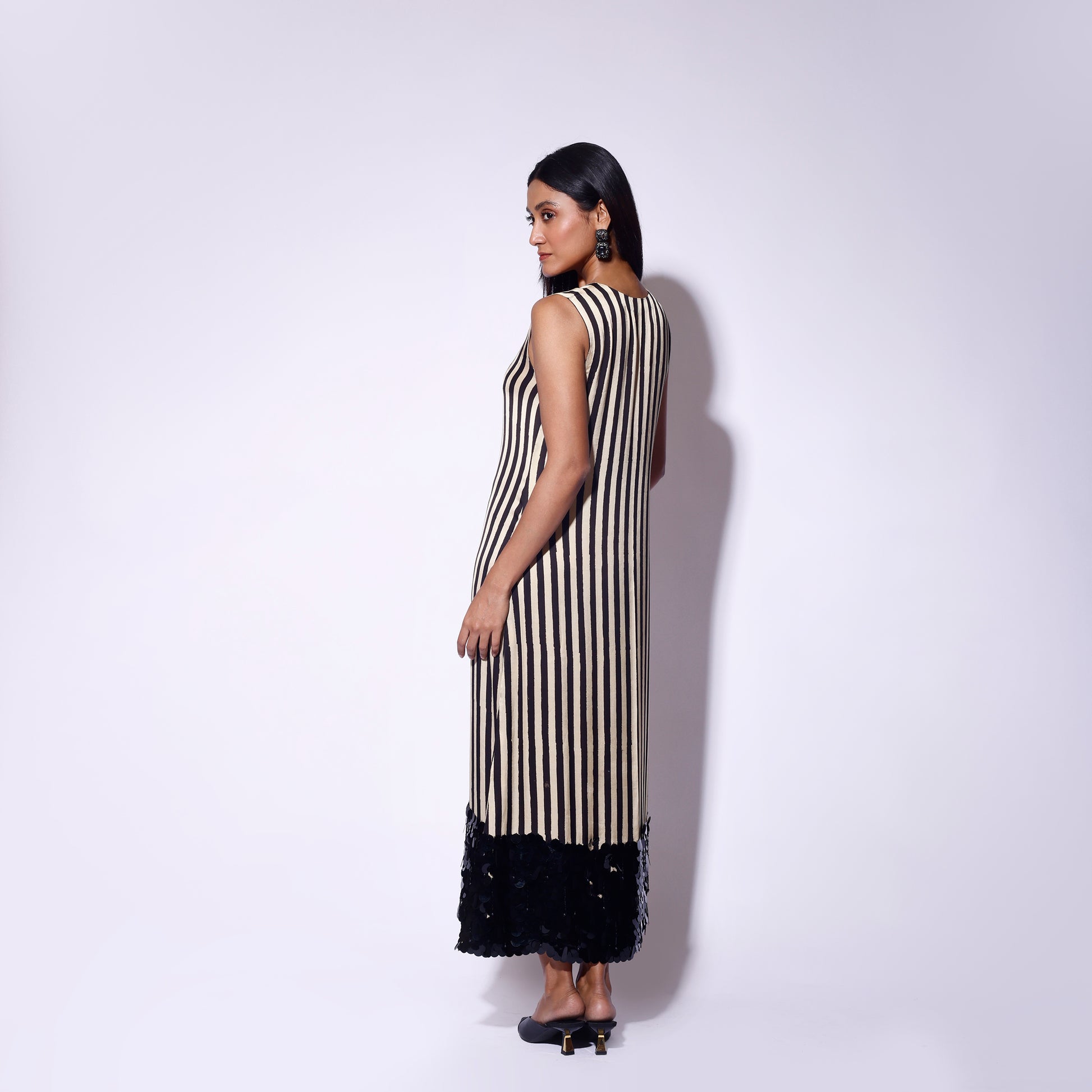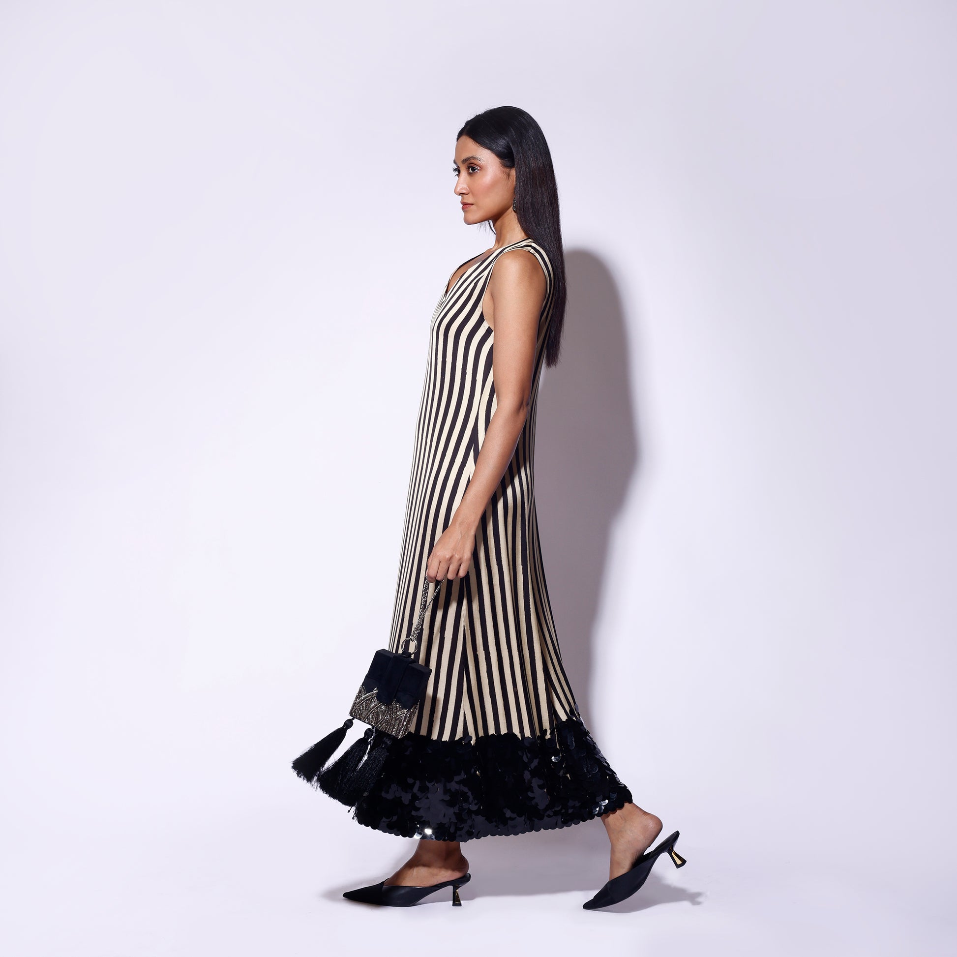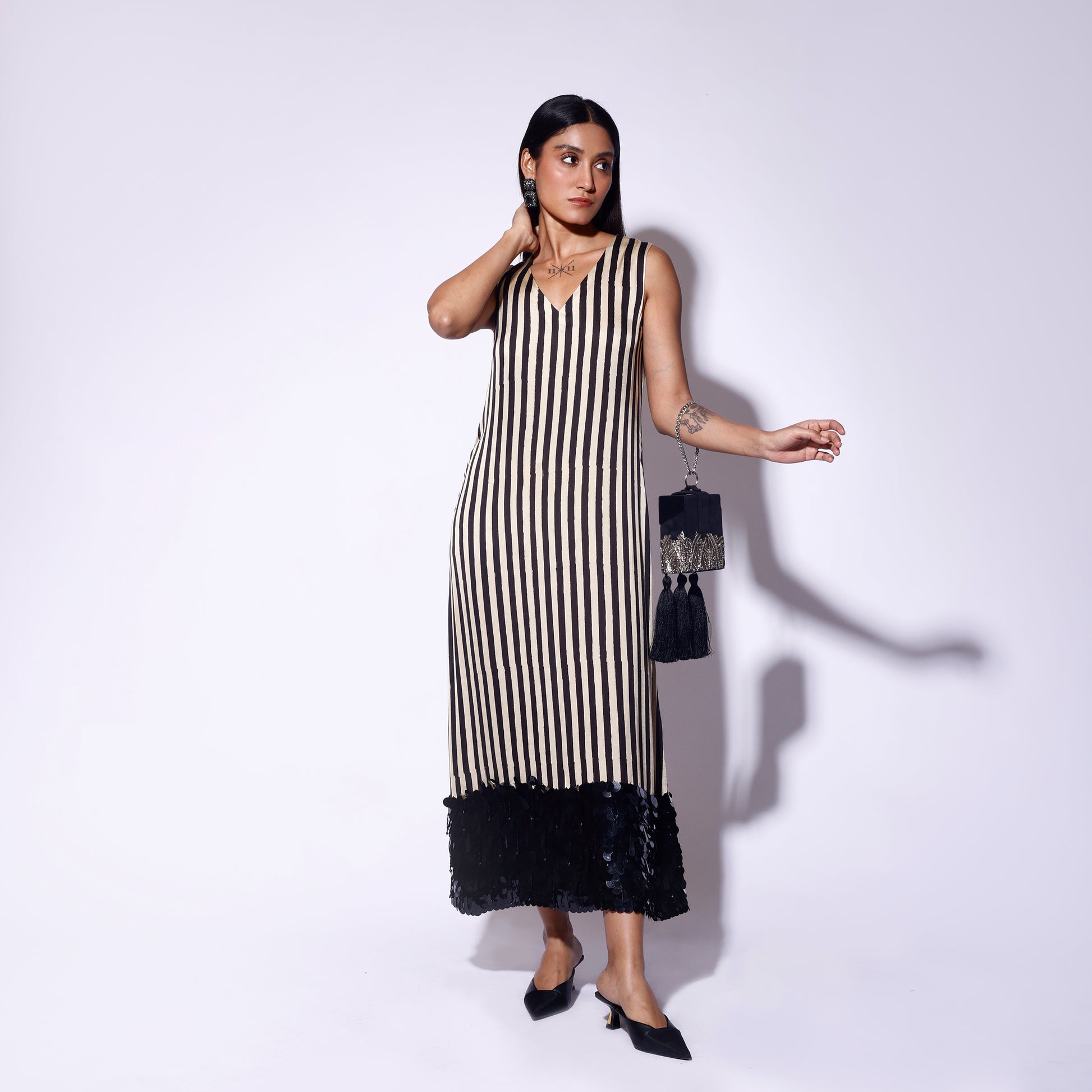 This stripe black midi dress with sequins adds an element of luxe to any occasion. The metallic sequins catch the light, creating a subtle shimmer that’s perfect for evening