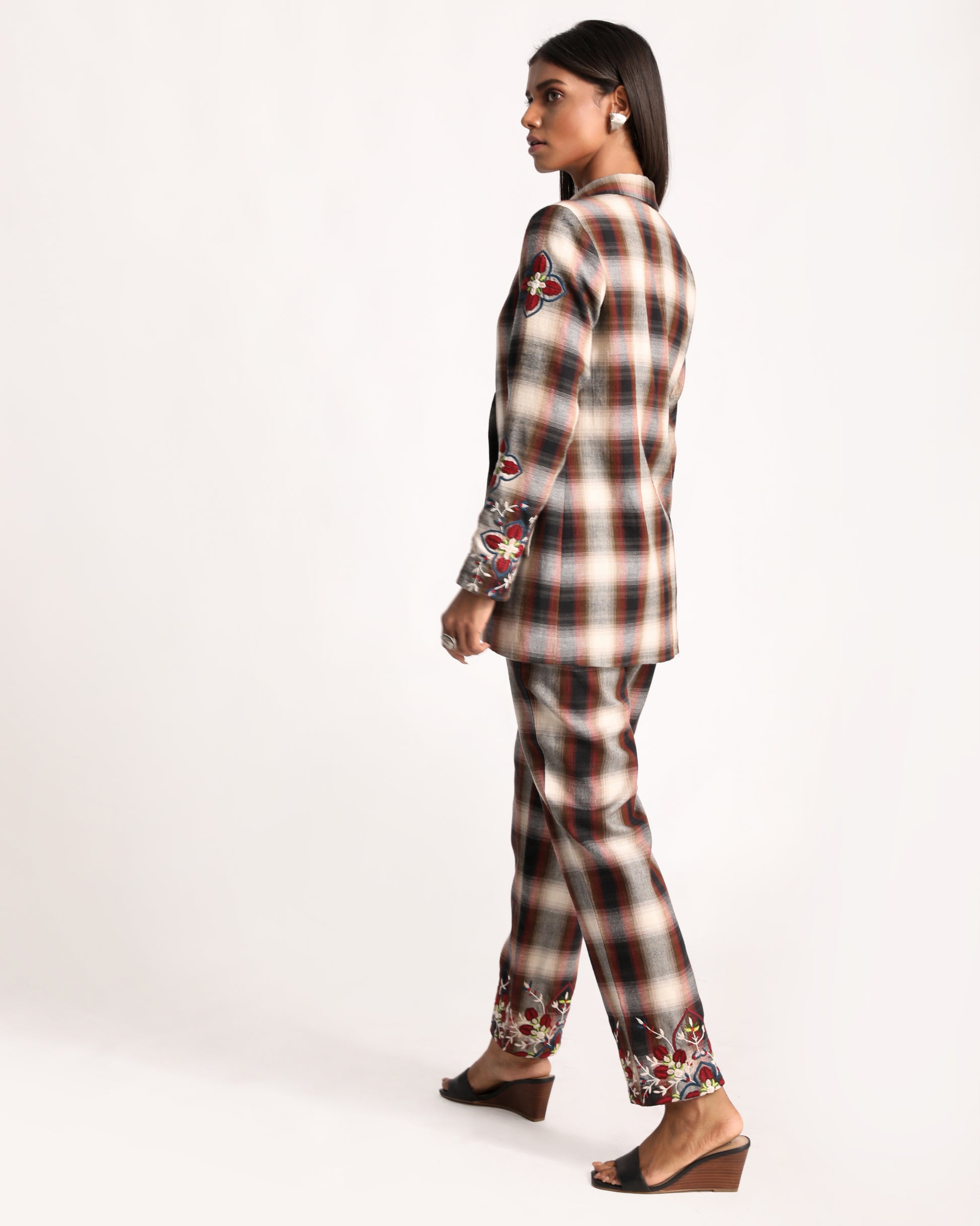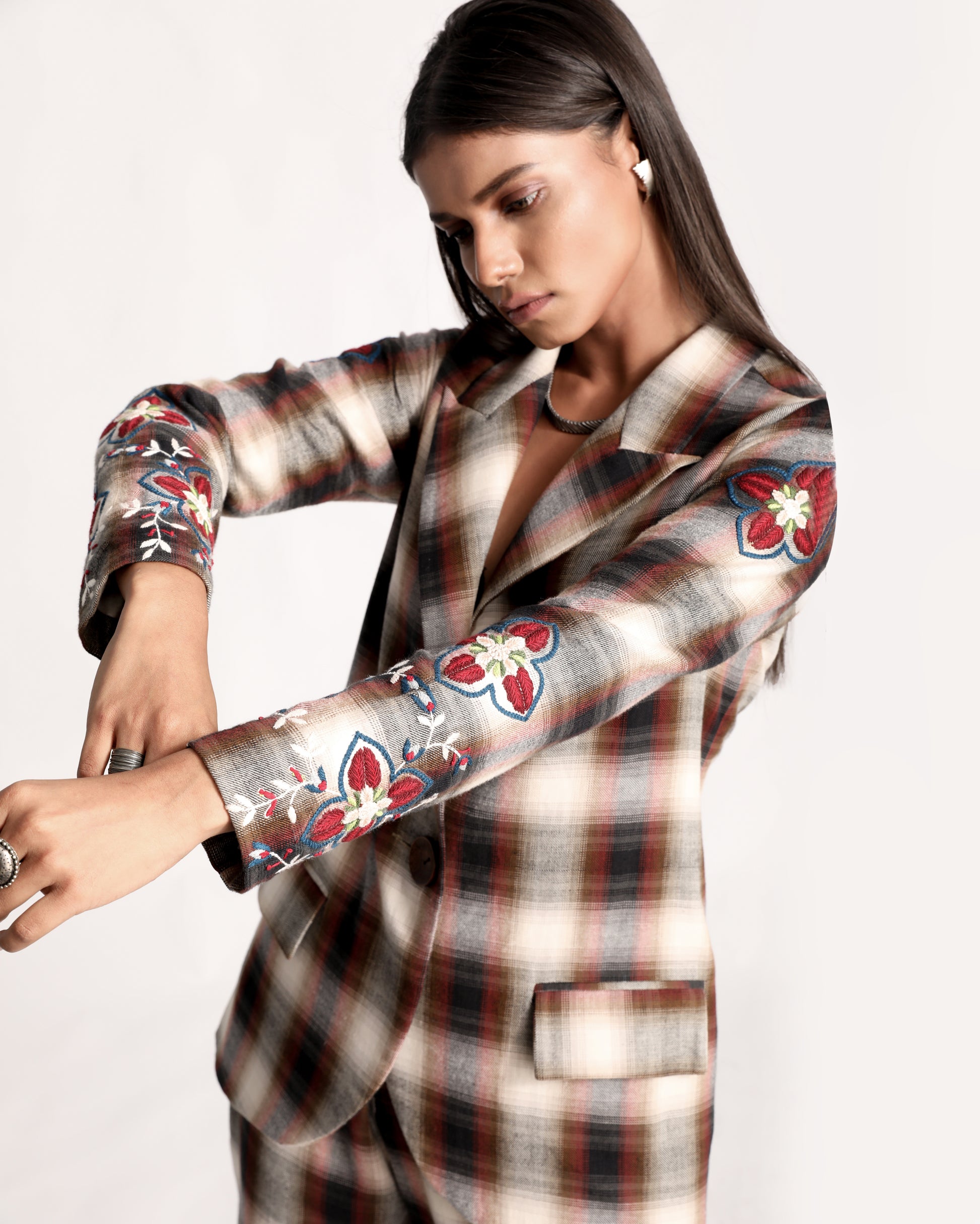 "Made with plaid cotton weave, featuring hand embroidery detailing on the sleeves and hemline of the trousers, this blazer set is a perfect fit for the winters.