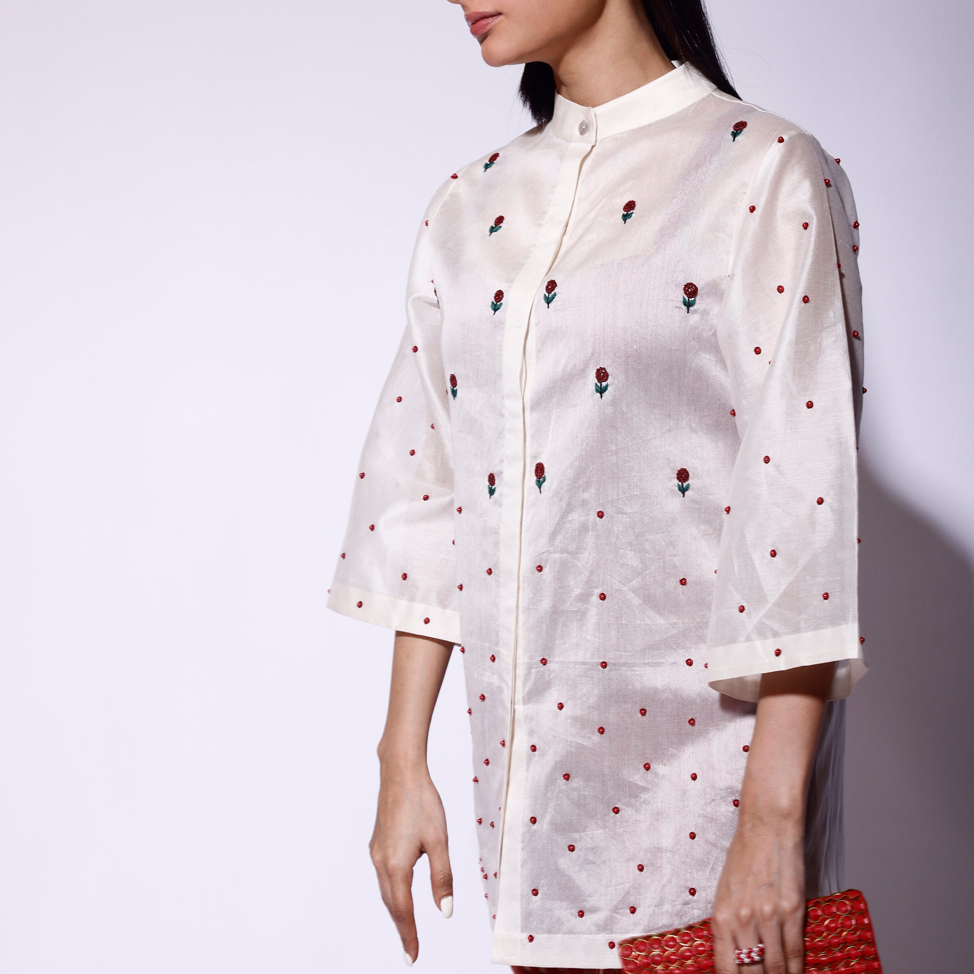 Delicate and elegant, this white Chanderi shirt features intricate rose embroidery, is paired with a sleek and stylish red pants with gold stripes that adds a touch of luxury to your wardrobe offering a fusion of comfort and style. Lightweight and breathable, tailored for a flattering fit, the subtle yet striking gold accents make them the perfect choice for both casual outings and more formal events, offering the perfect balance of comfort and elegance.