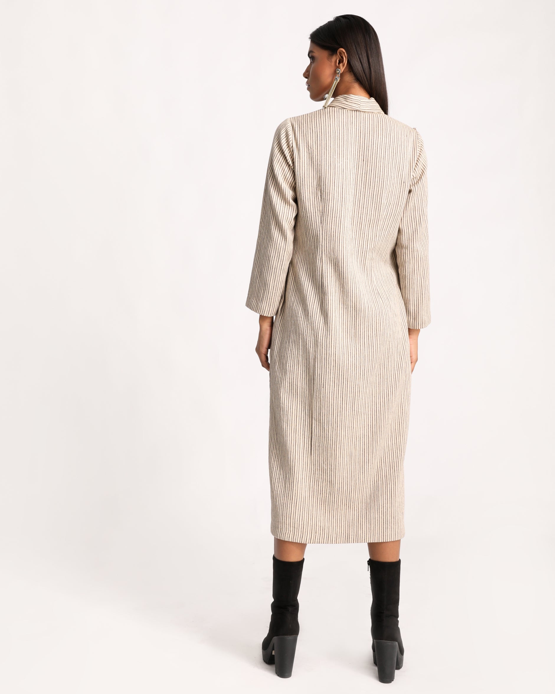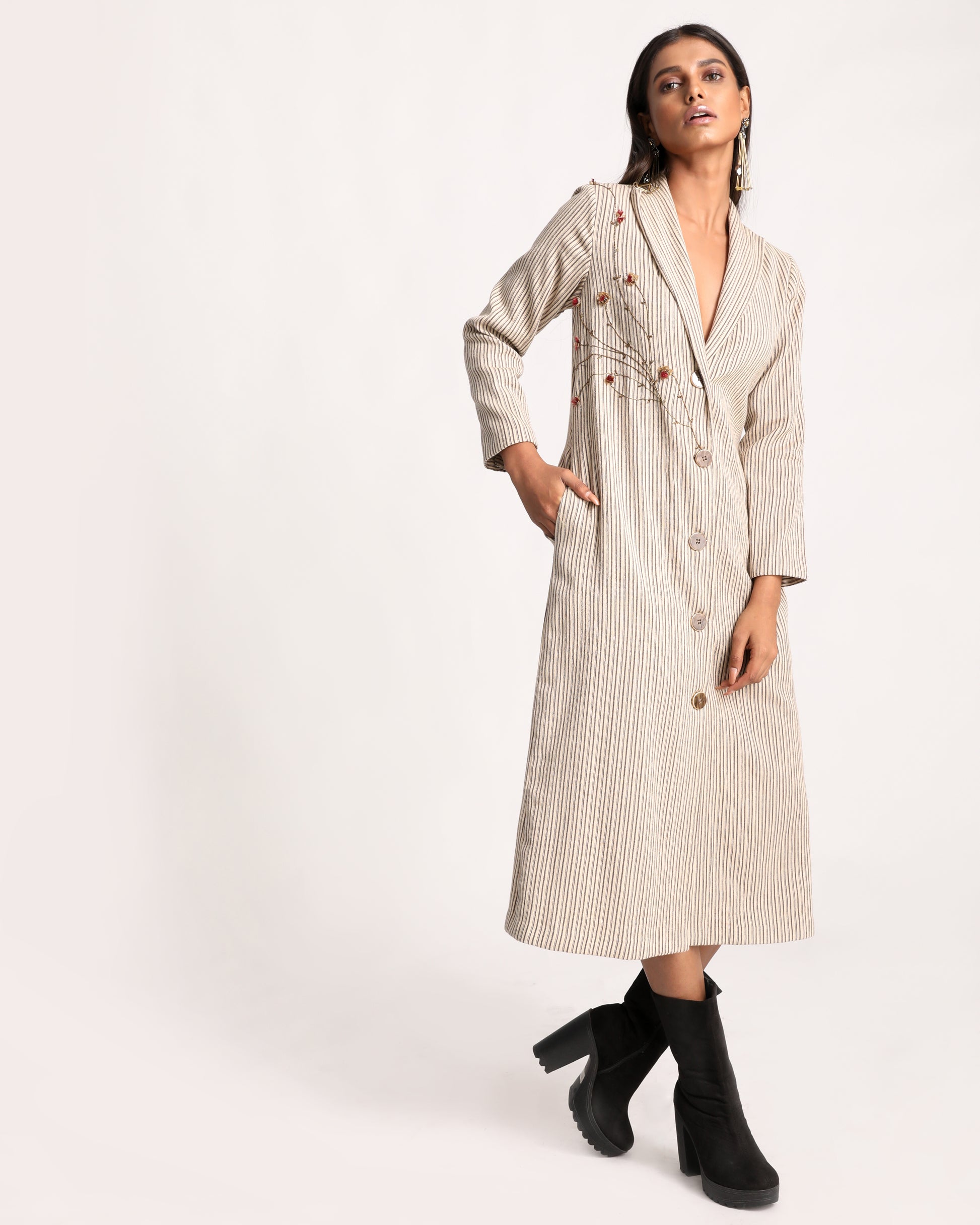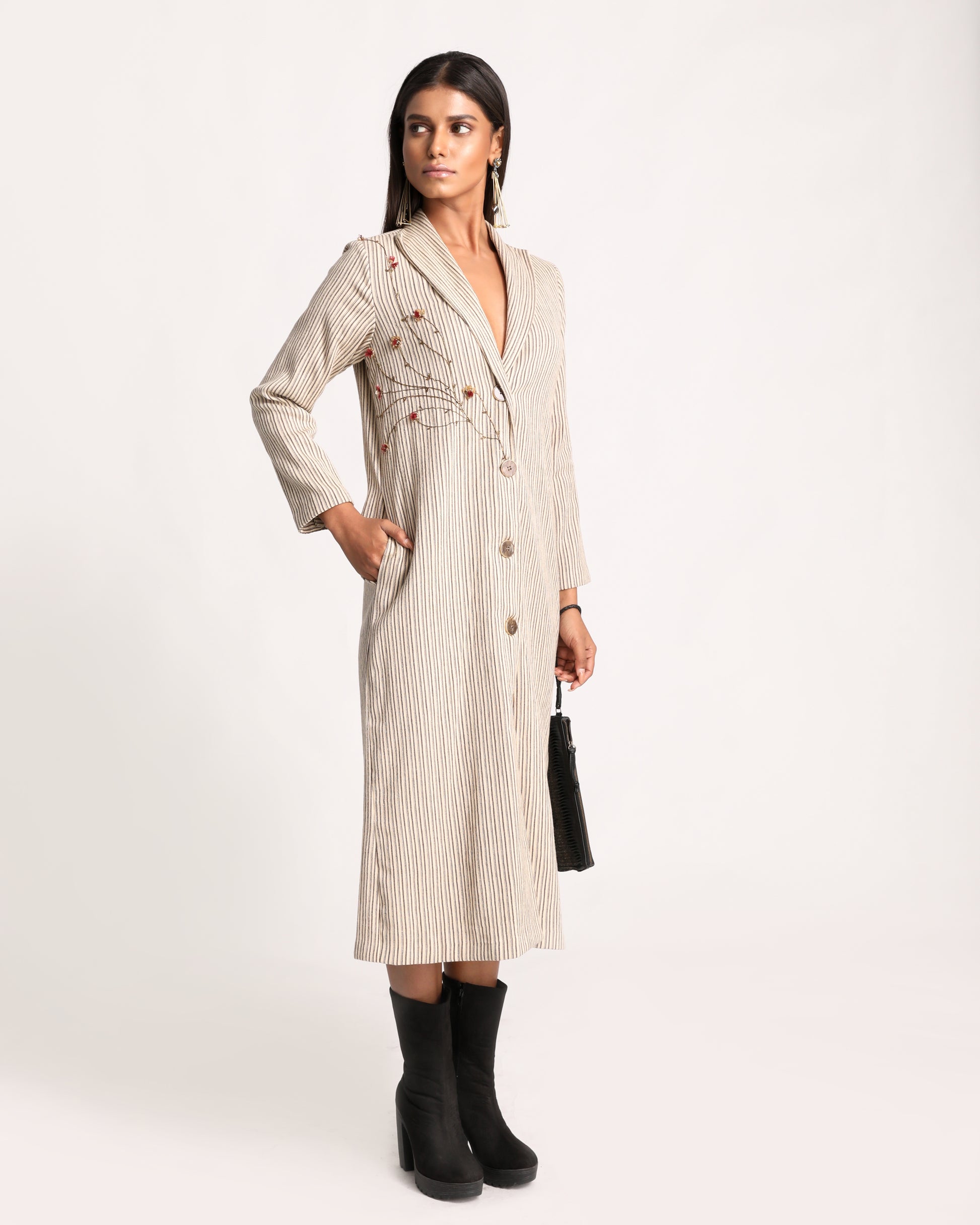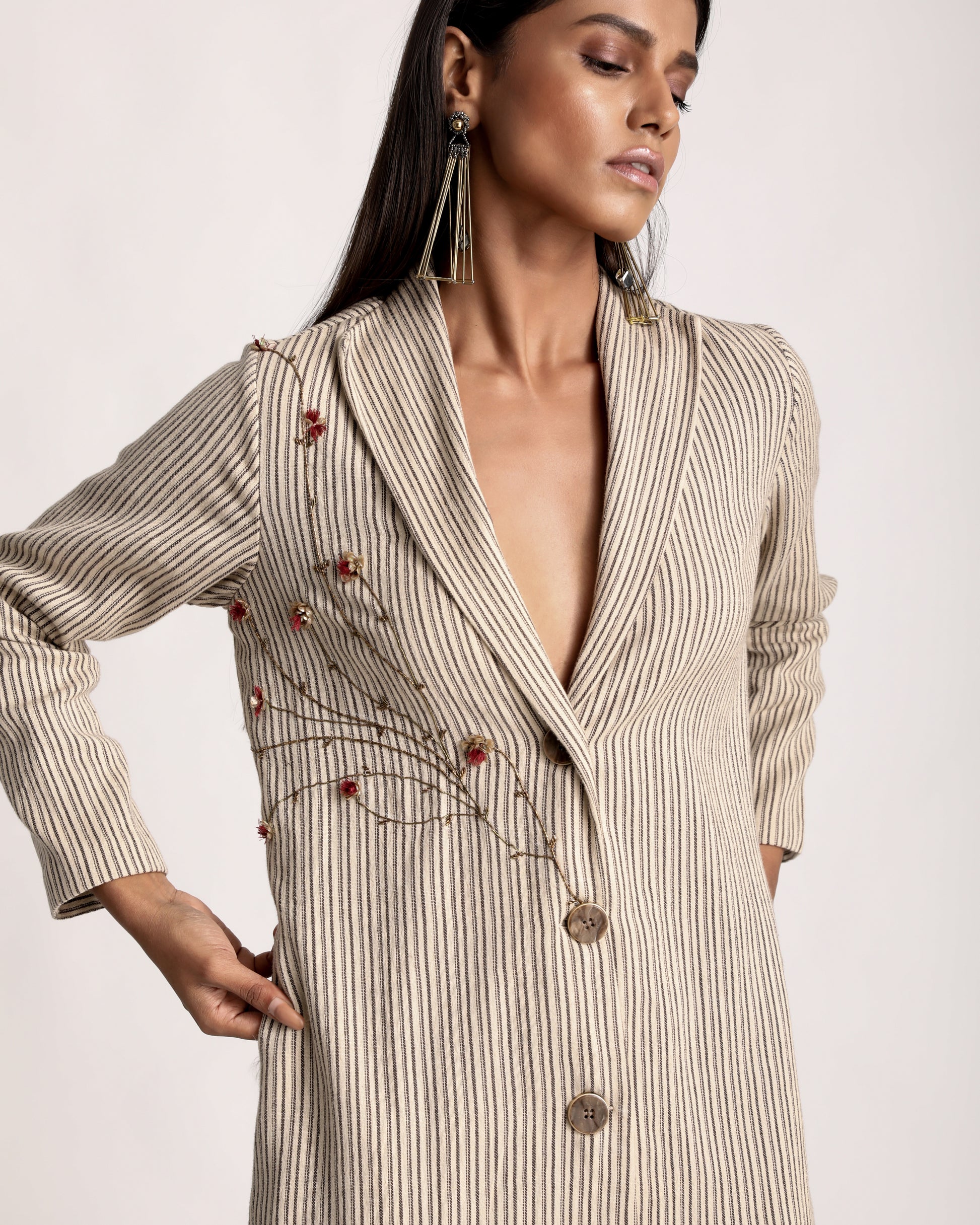 "This blazer dress is a perfect item of clothing for your fall and winter wardrobe. With its pinstripe pattern, plunging v-neckline, button down front and comfortable fit, there is nothing missing from this outfit. The floral embroidery detailing on one side creates a chic balance of high-octane glamour and wearability.
