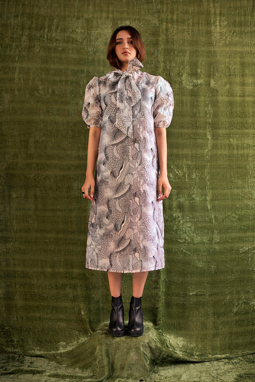 The Black and beige garden embroidered dress is a midi. Cut in handloom organza silk, comes with a detached lining. It has a straight silhouette with a short puffed sleeve and a big tie-up bow around the neck.