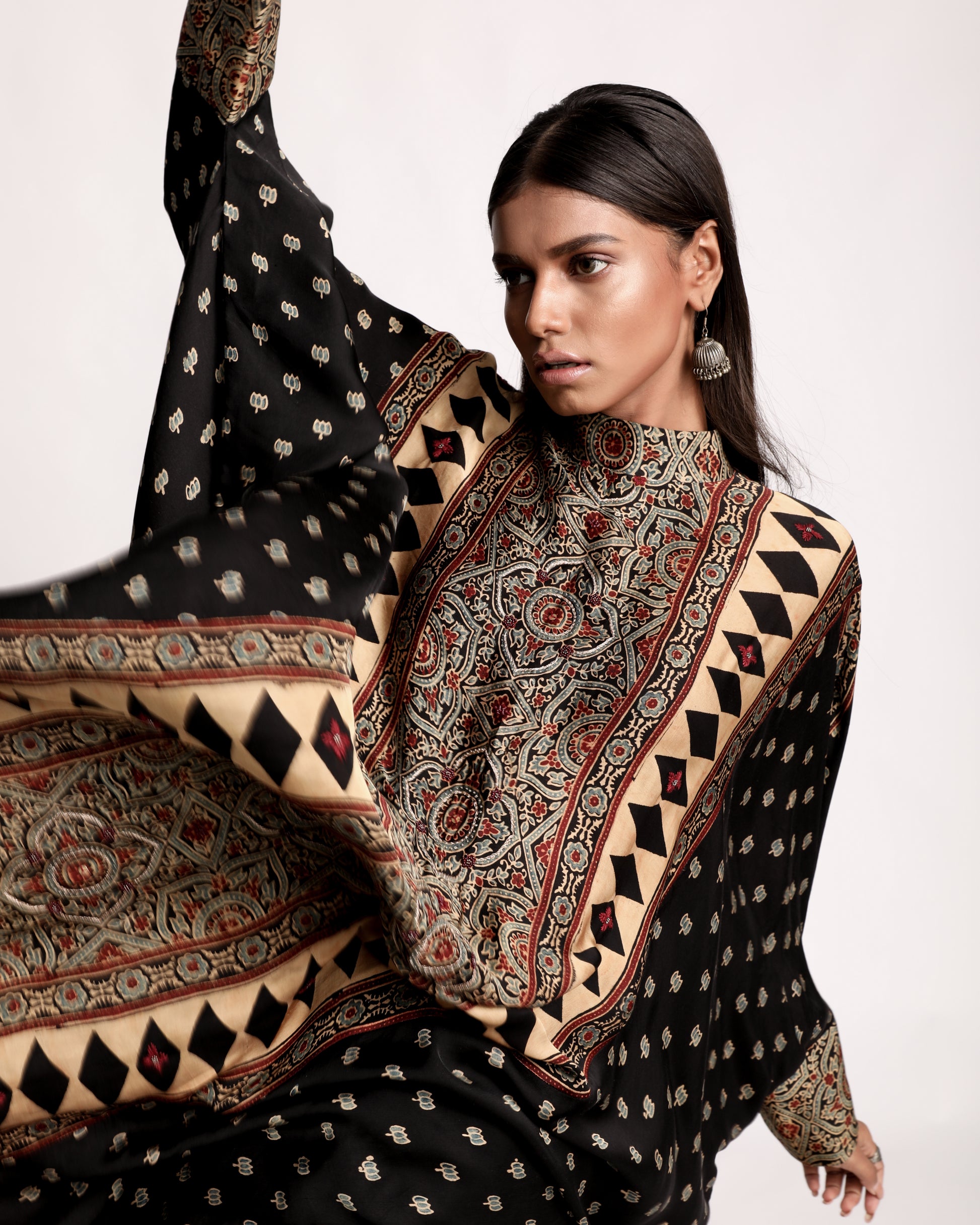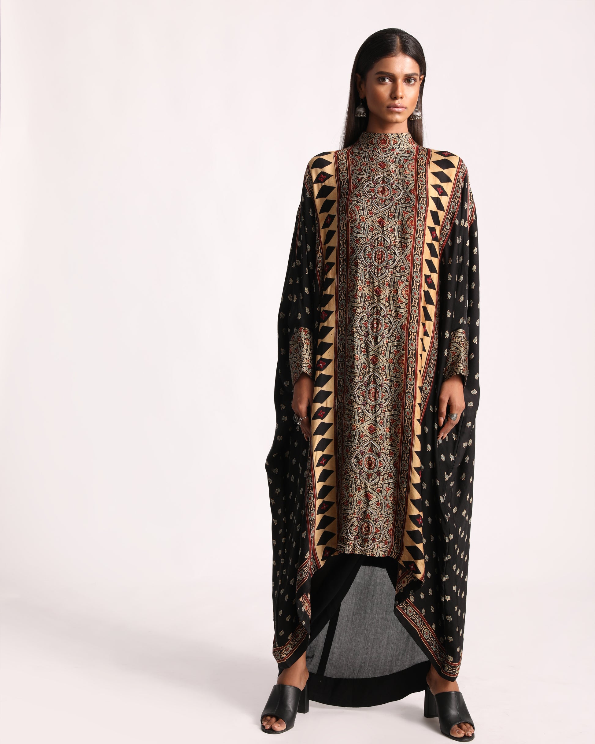 "Comfort meets elegance in this free-size, relaxed Full Bloom Lotus Kaftan. The modern silhouette and conventional ajrakh print makes this piece ultra flattering and perfect for a morning to evening look. You can take hints from the brand and team it up with dhoti or drape skirts and minimal accessories.