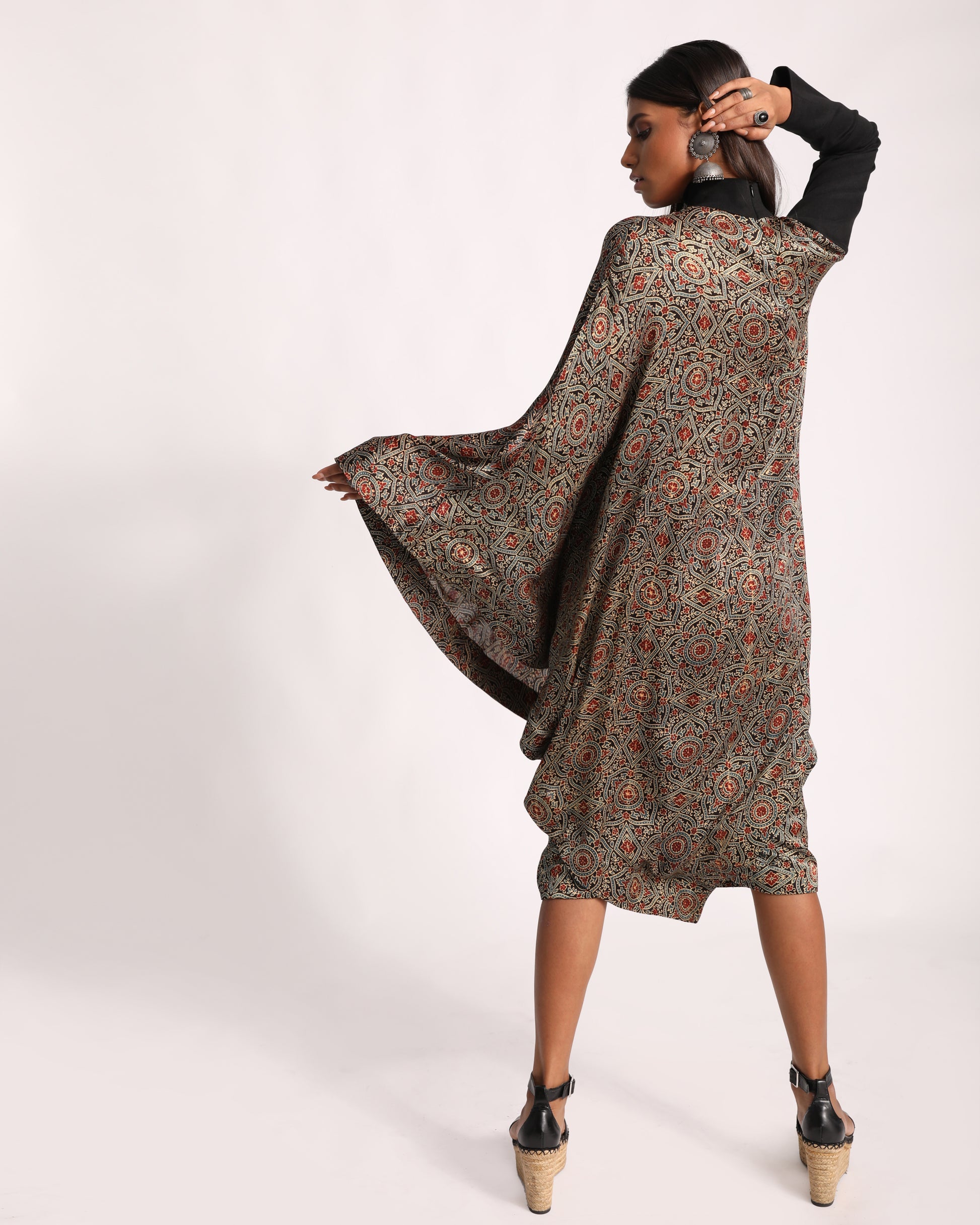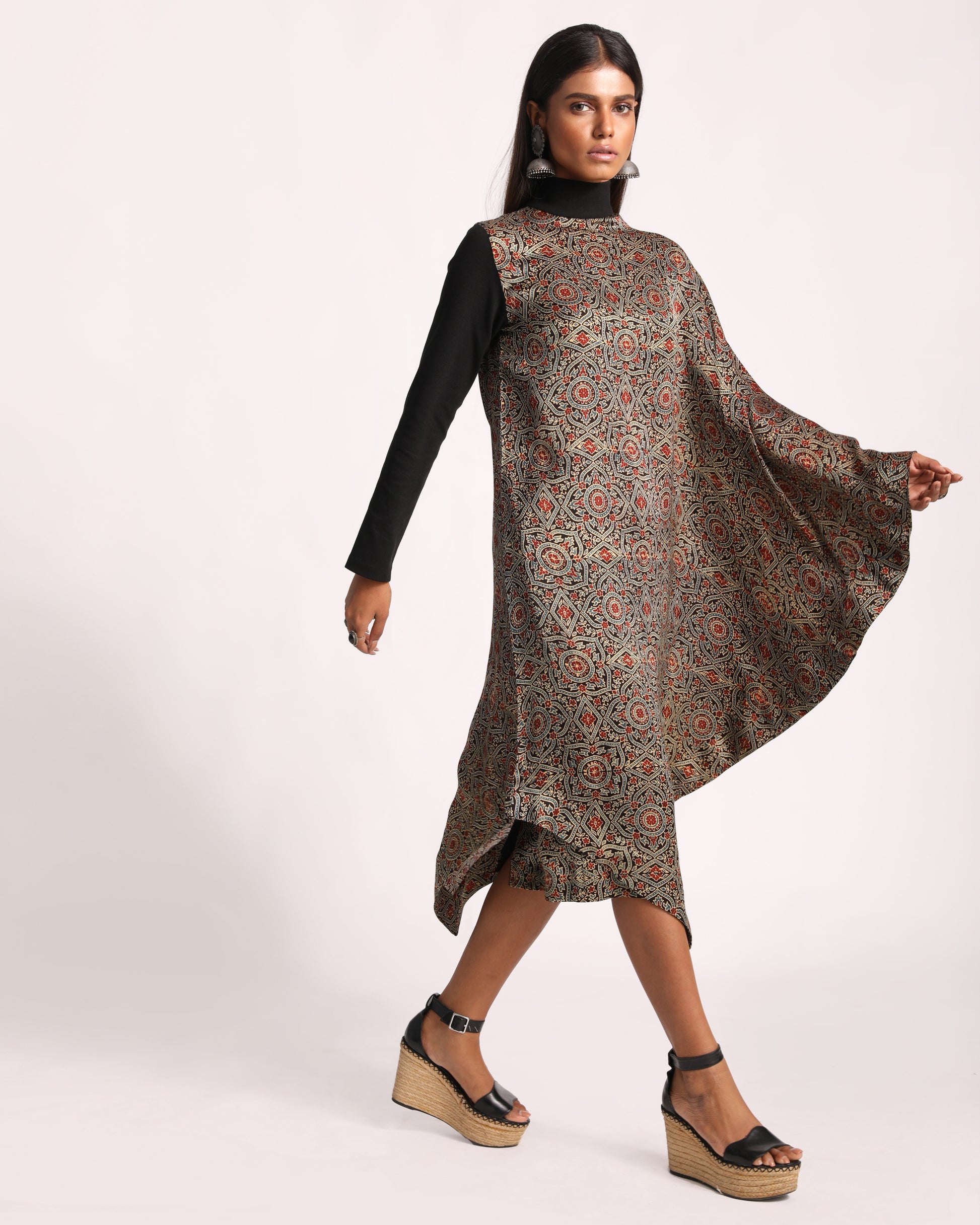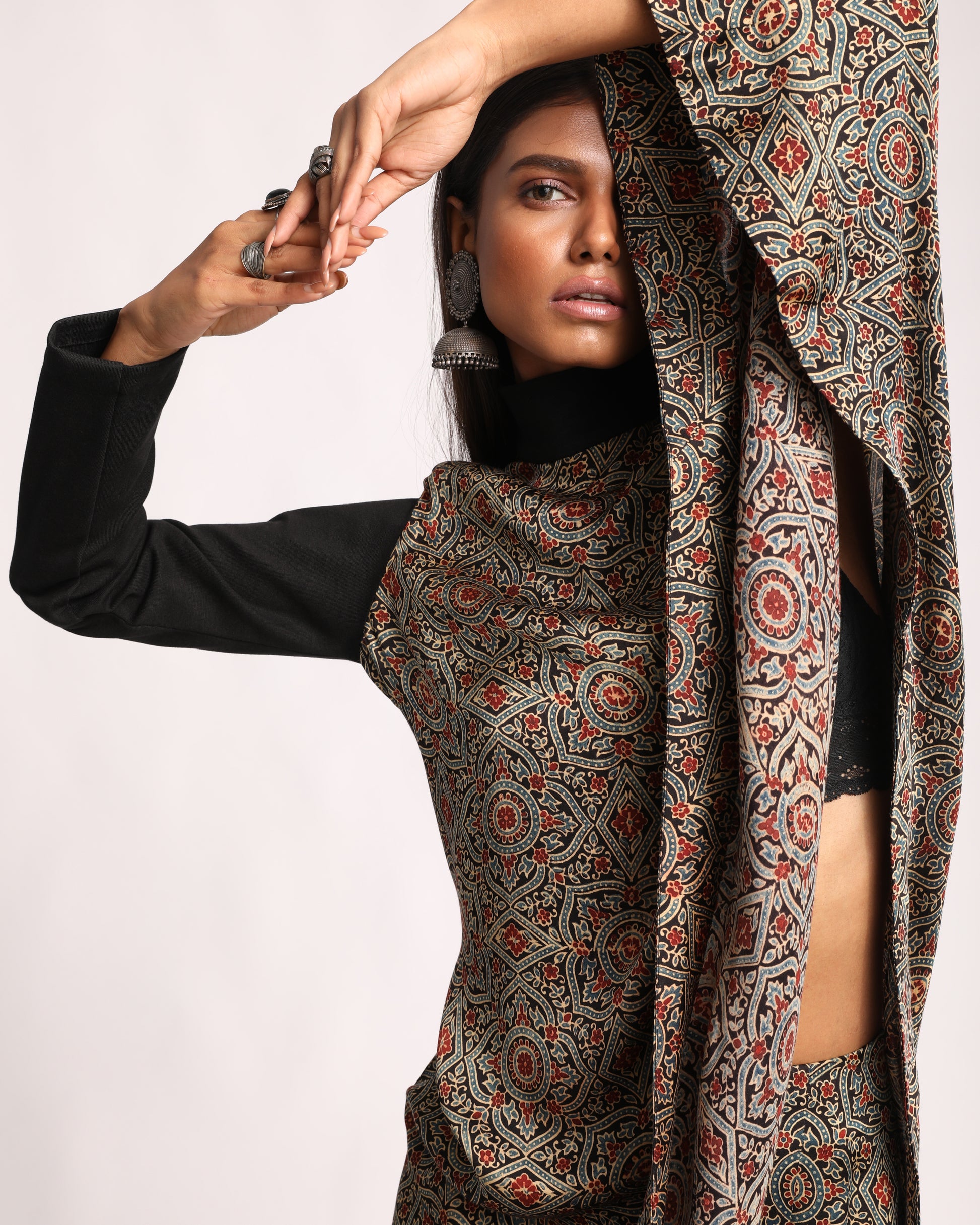 "This mid-length kaftan top with contemporary and comfortable silhouette which features fitted jersey sleeve and collar is tailored from traditional Ajrakh block print on modal satin. Complement this with our Full Bloom Pencil skirt as a set.