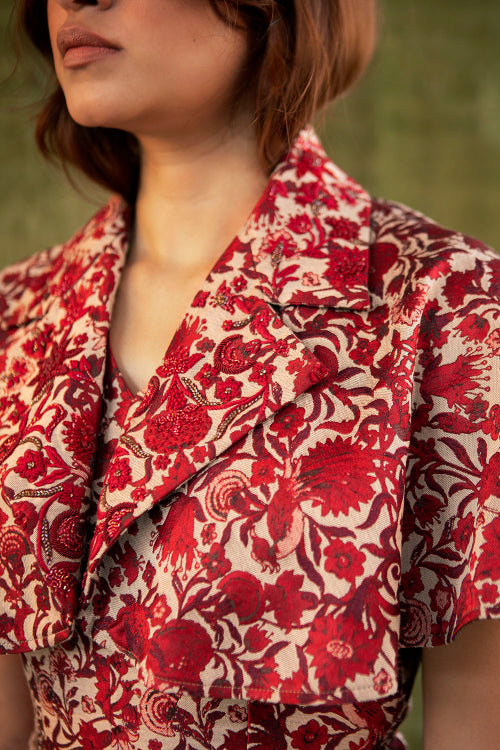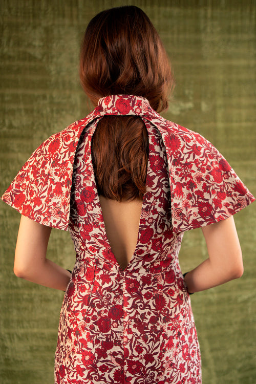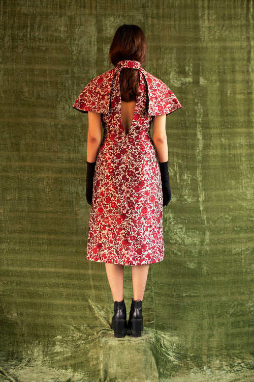 The red floral sleeveless jacquard dress is both modern and elegant. It has an attached short cape with an embroidered collar and flap pockets at the waist. The back is exposed with a low cut to add glamour.