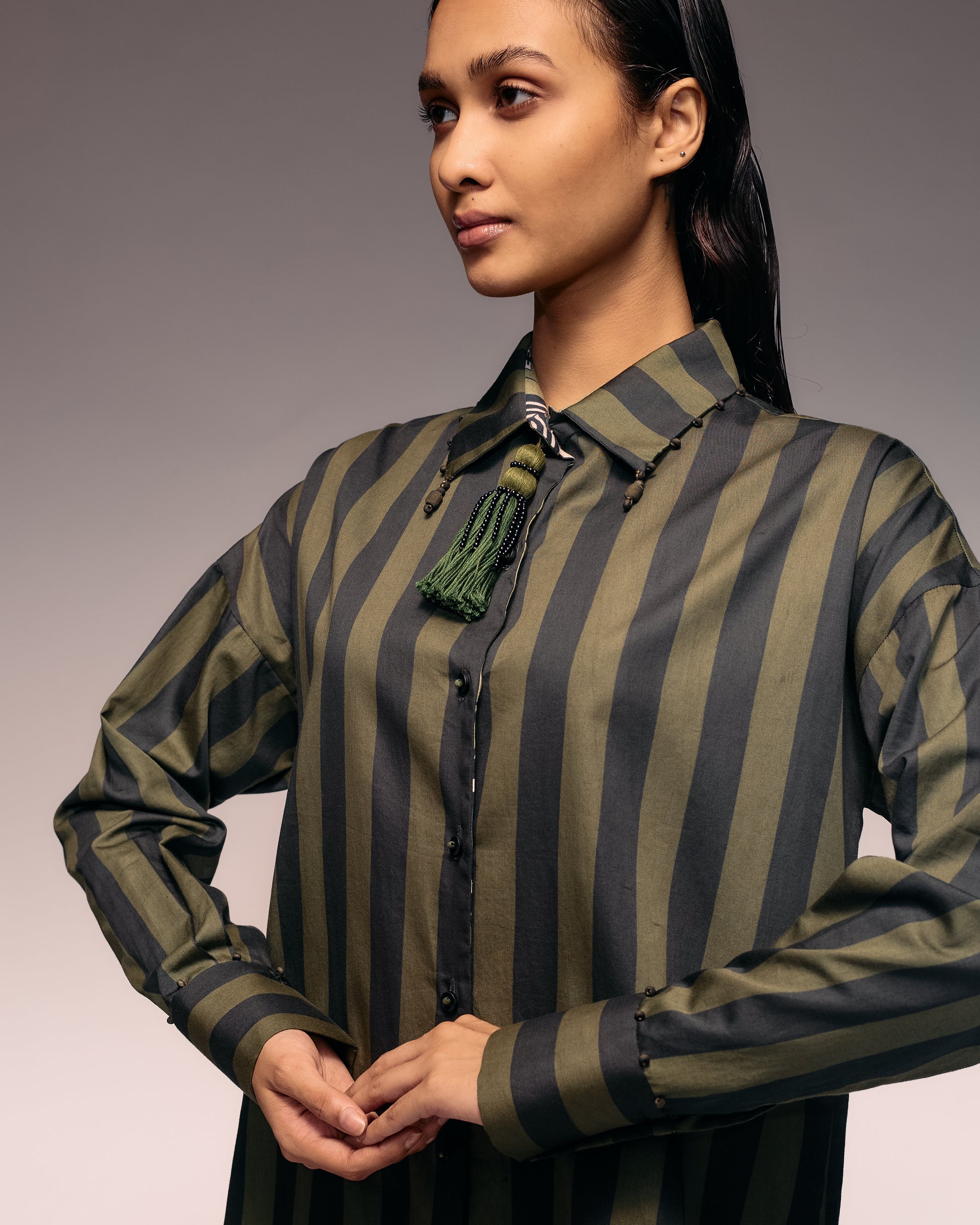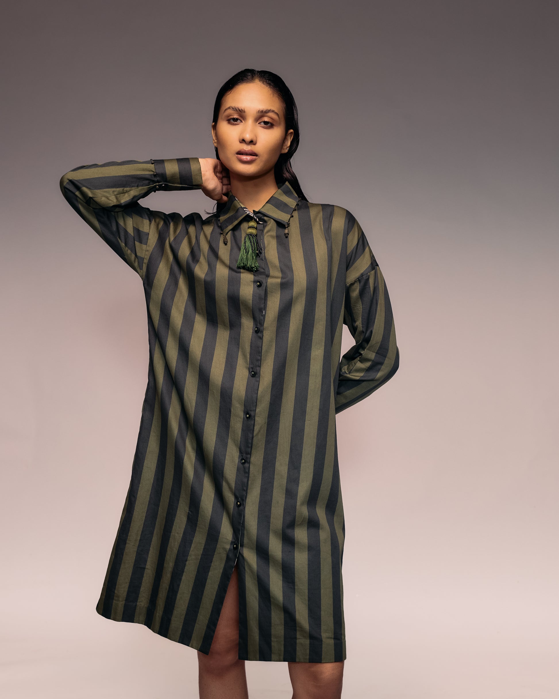 The Green Black Stripe Shirt Dress redefines classic tailoring with a relaxed, elongated silhouette. Crafted from soft cotton, it features a collared neckline highlighted by olive-dyed wooden beads adding a handcrafted touch. High-quality stitching ensures a structured yet fluid drape. Pair it with belts, sneakers, or boots for versatile styling. Ideal for spring-to-autumn transitions, creative workplaces, or bold looks.