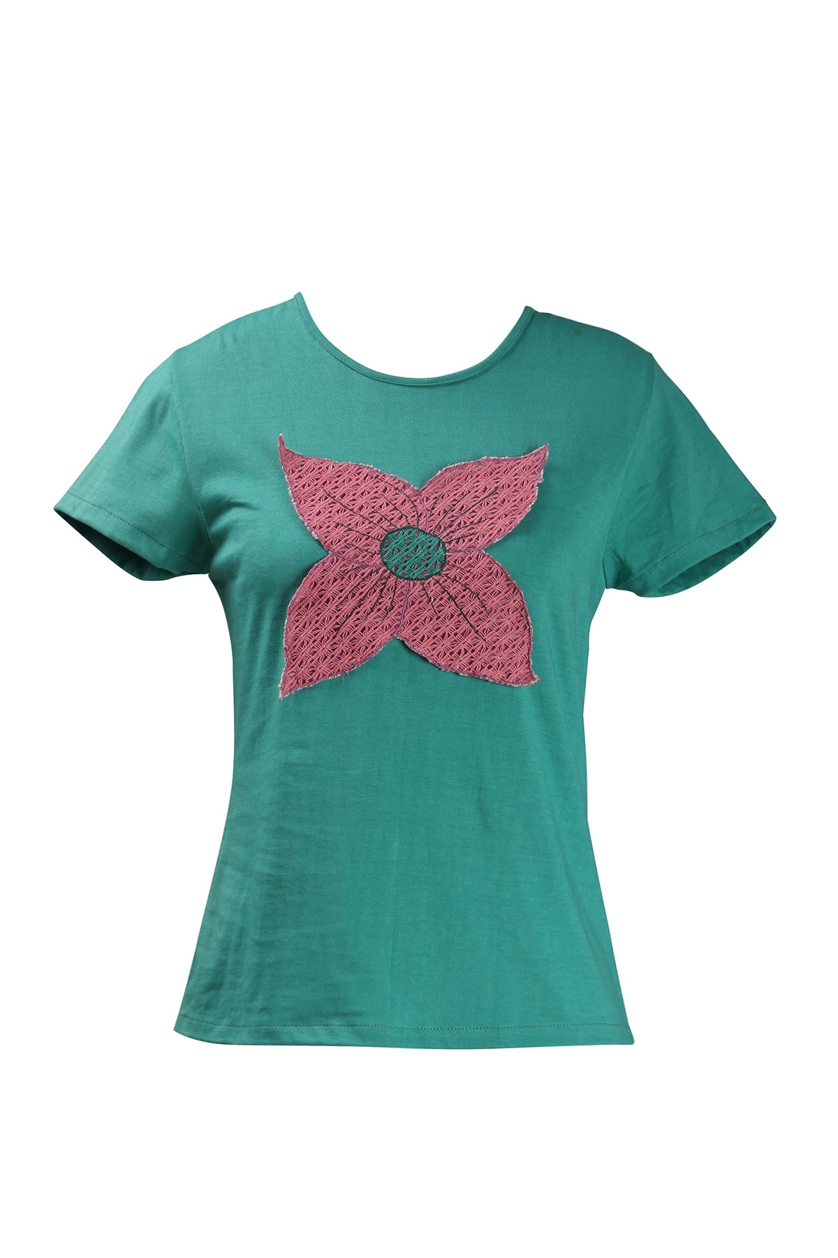 The green knit T-shirt balances the look with a soft feel and floral appliqué at the center. Casual yet put-together, this T-shirt is ideal for relaxed sightseeing or laid-back afternoons at a resort café.