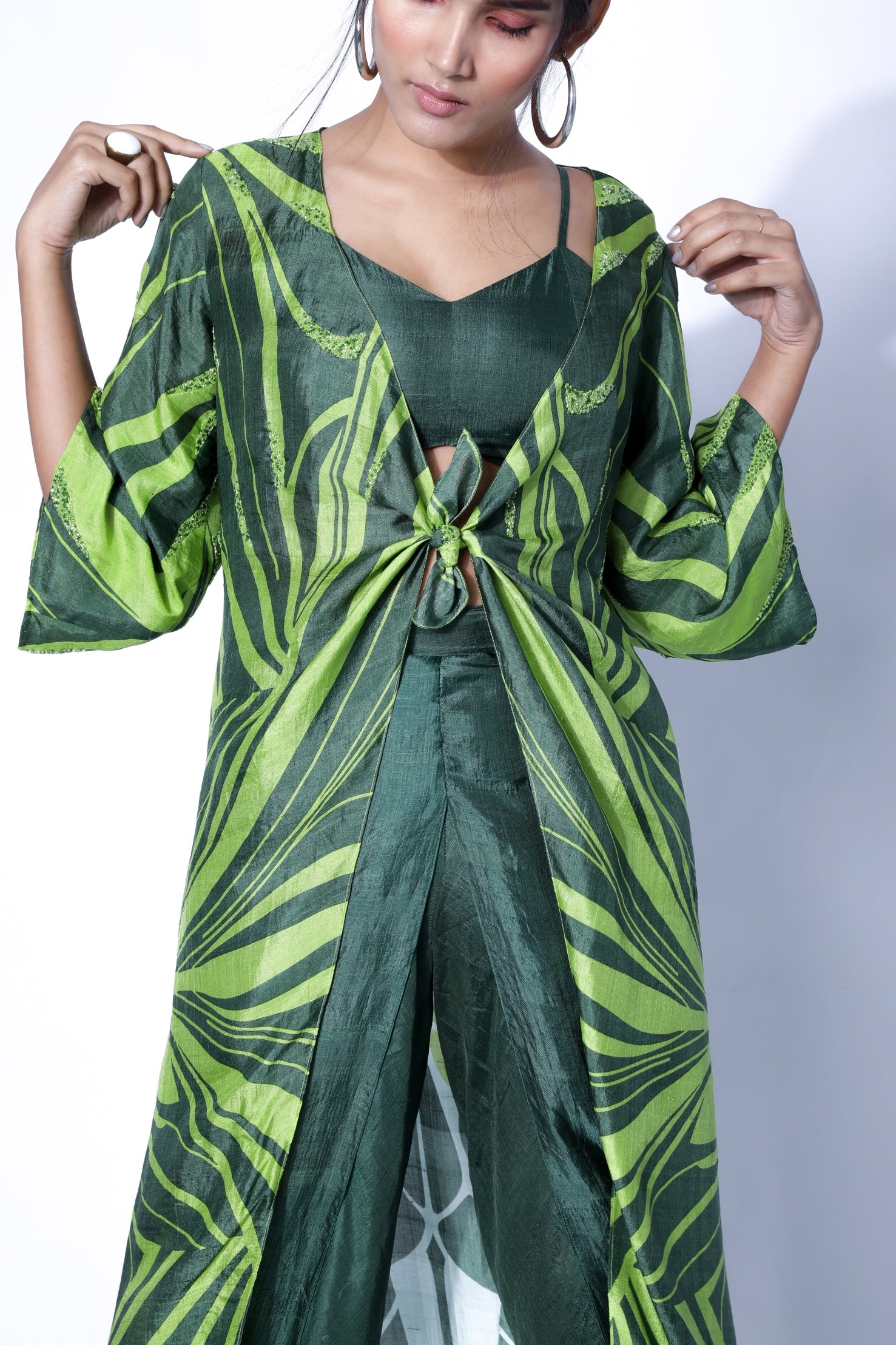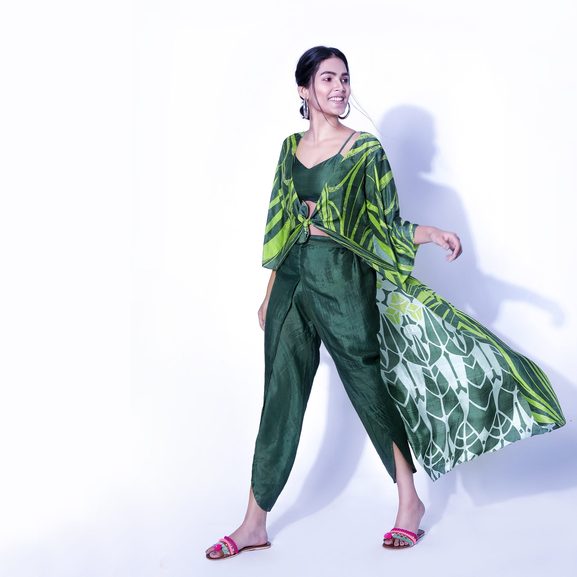 Hand-screen-printed tie-knot cape with hand-dyed dhoti and bustier set in Bengal handloom silk with embroidery detailing.