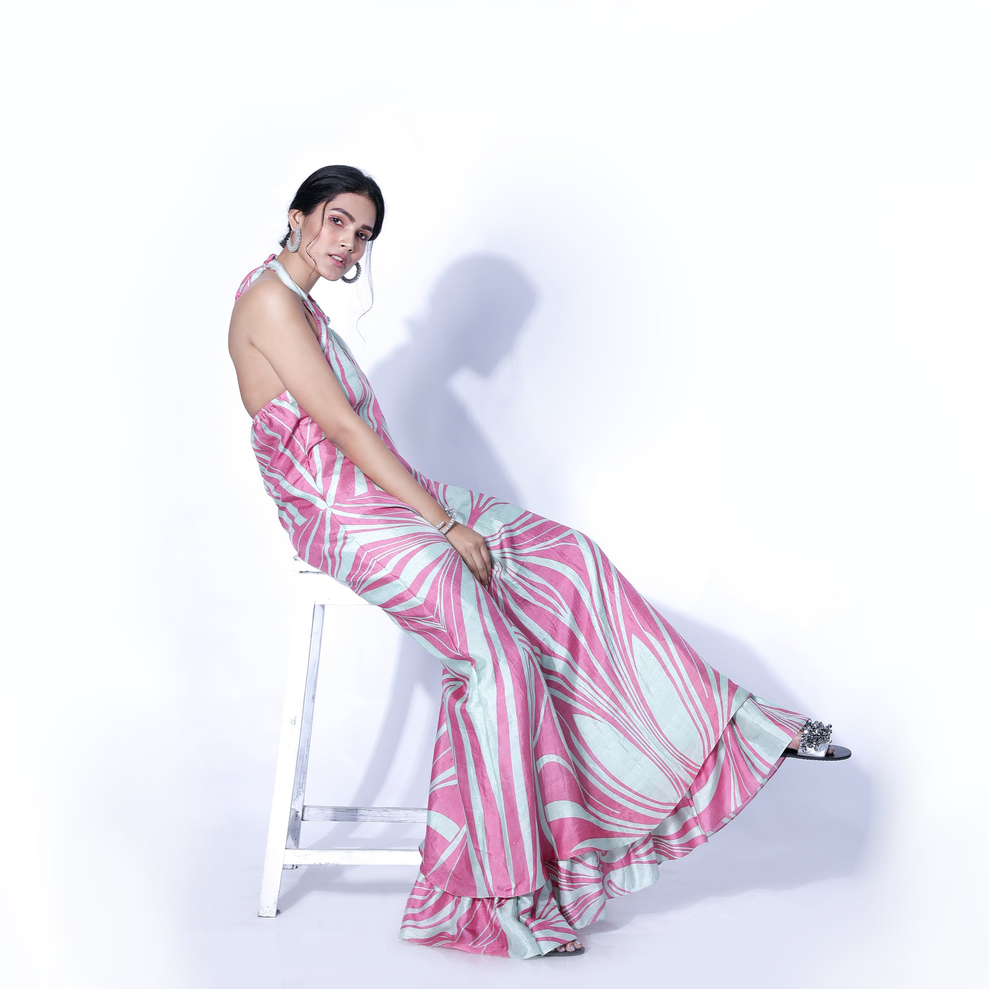 Hand screen-printed halter maxi dress in handloom Bengal silk with embroidery detailing and frill at base.