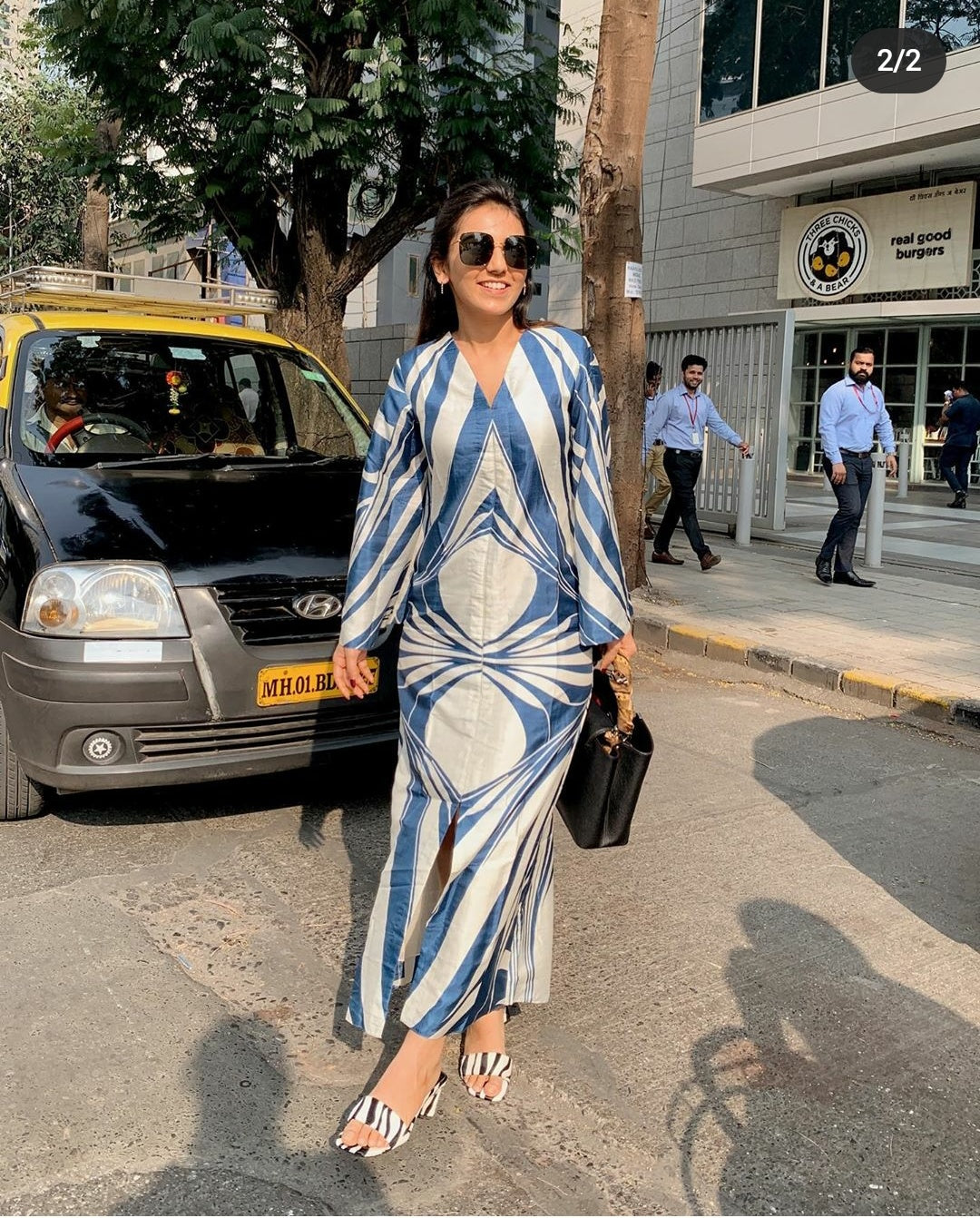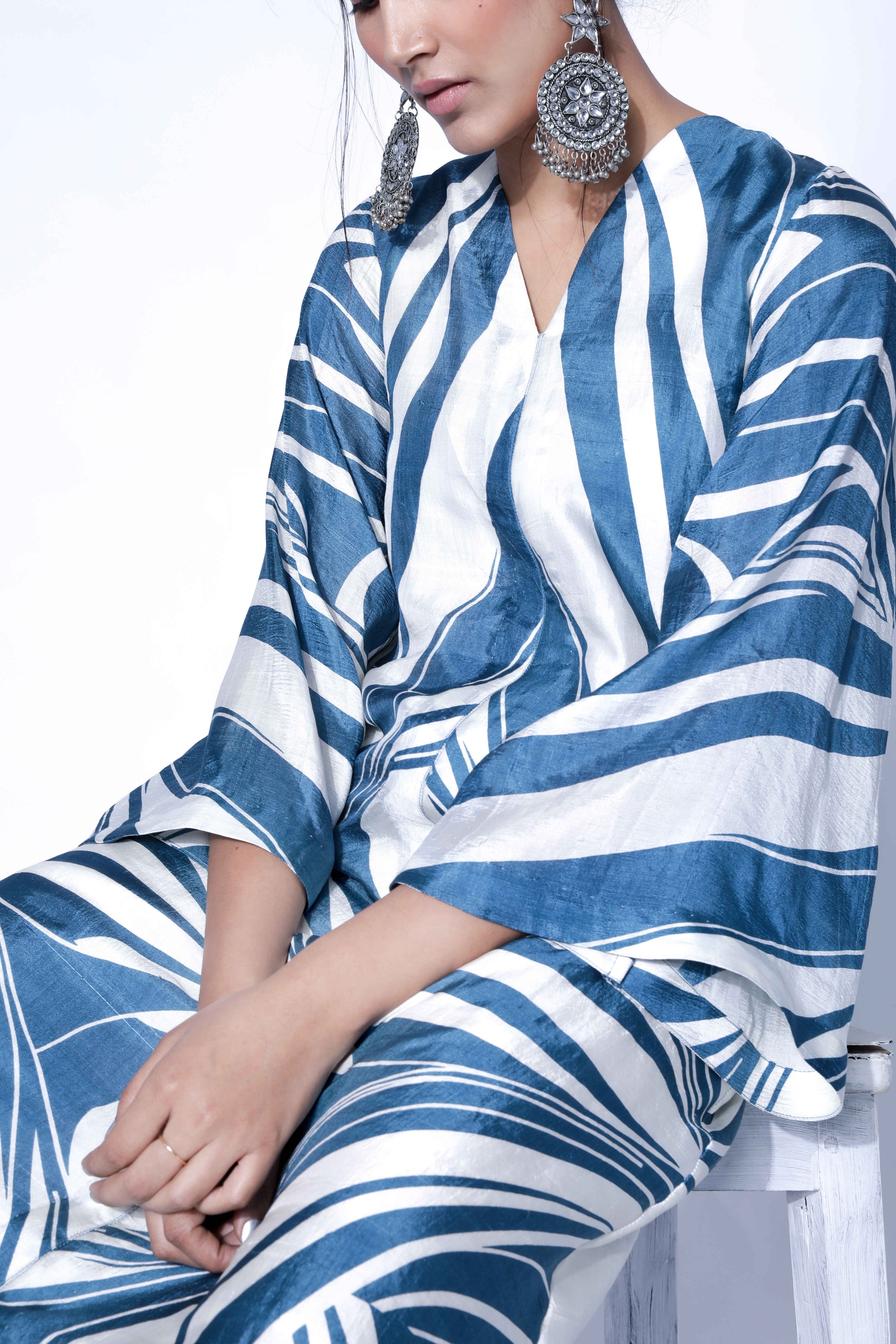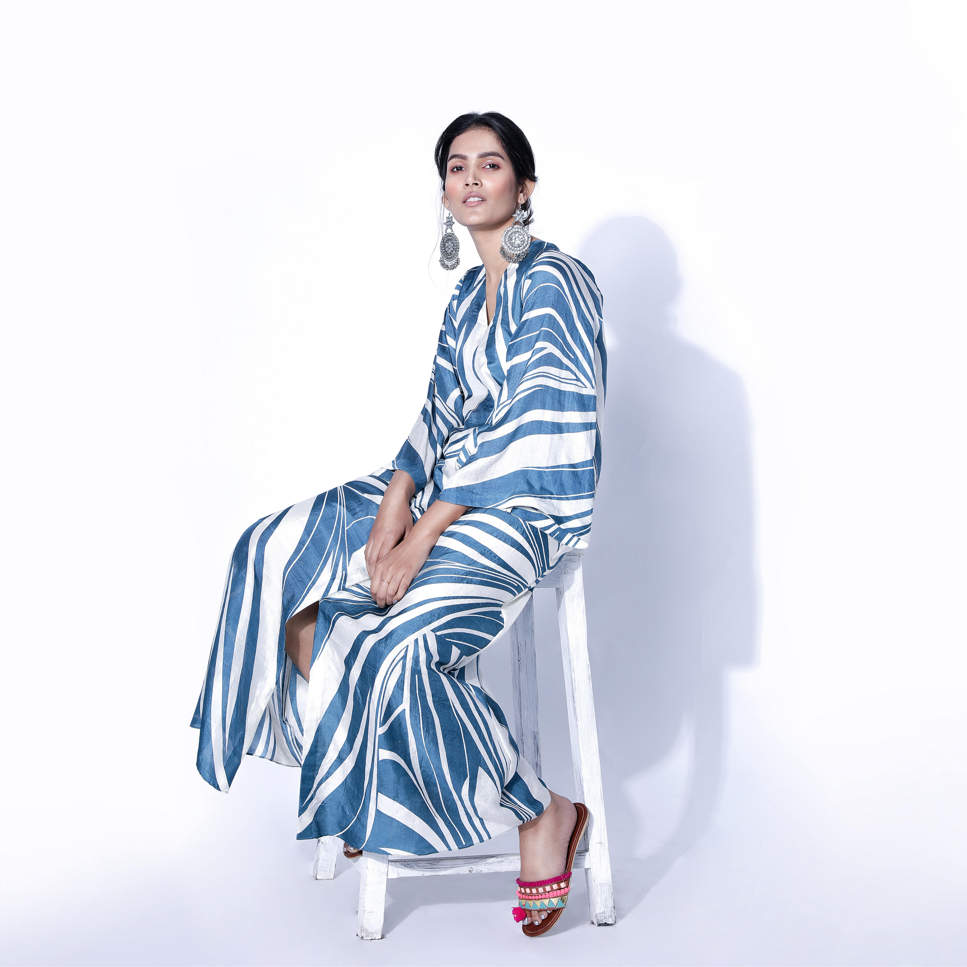 Hand-screen-printed long dress in Bengal handloom silk with flared sleeves and front slit.