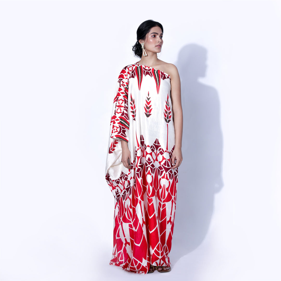 Hand screen-printed off shoulder dress in Bengal handloom silk with embroidery detailing.