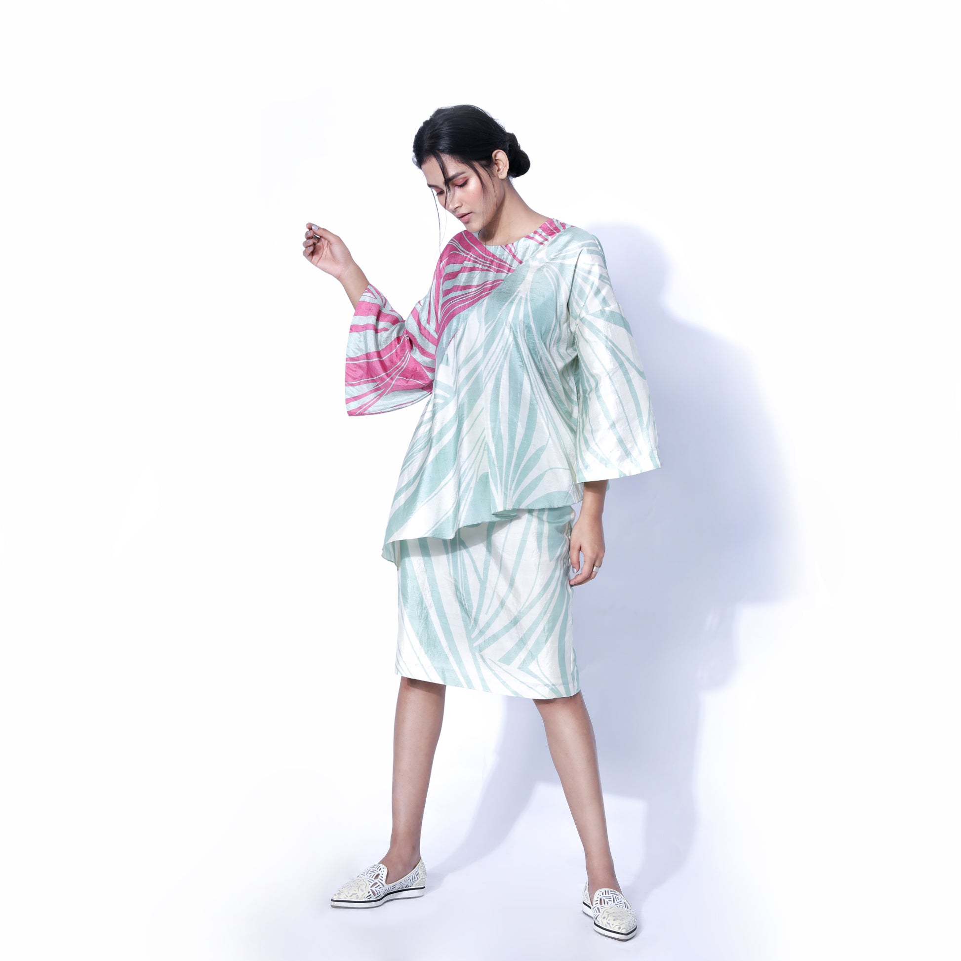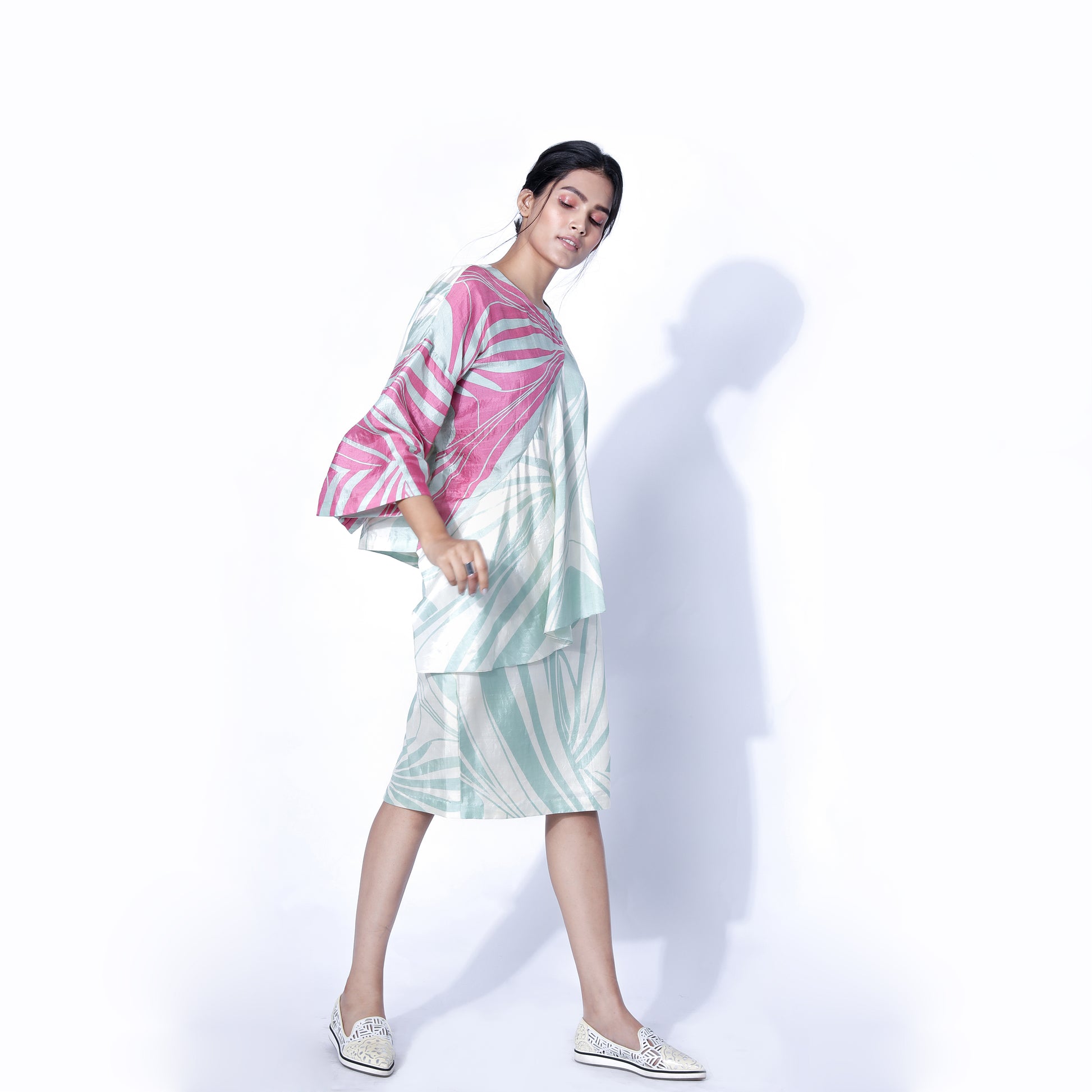 Hand-screen-printed pencil skirt in Bengal handloom silk.