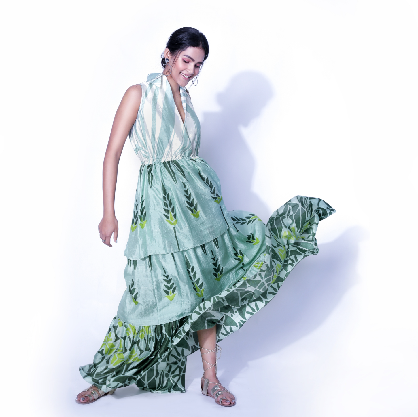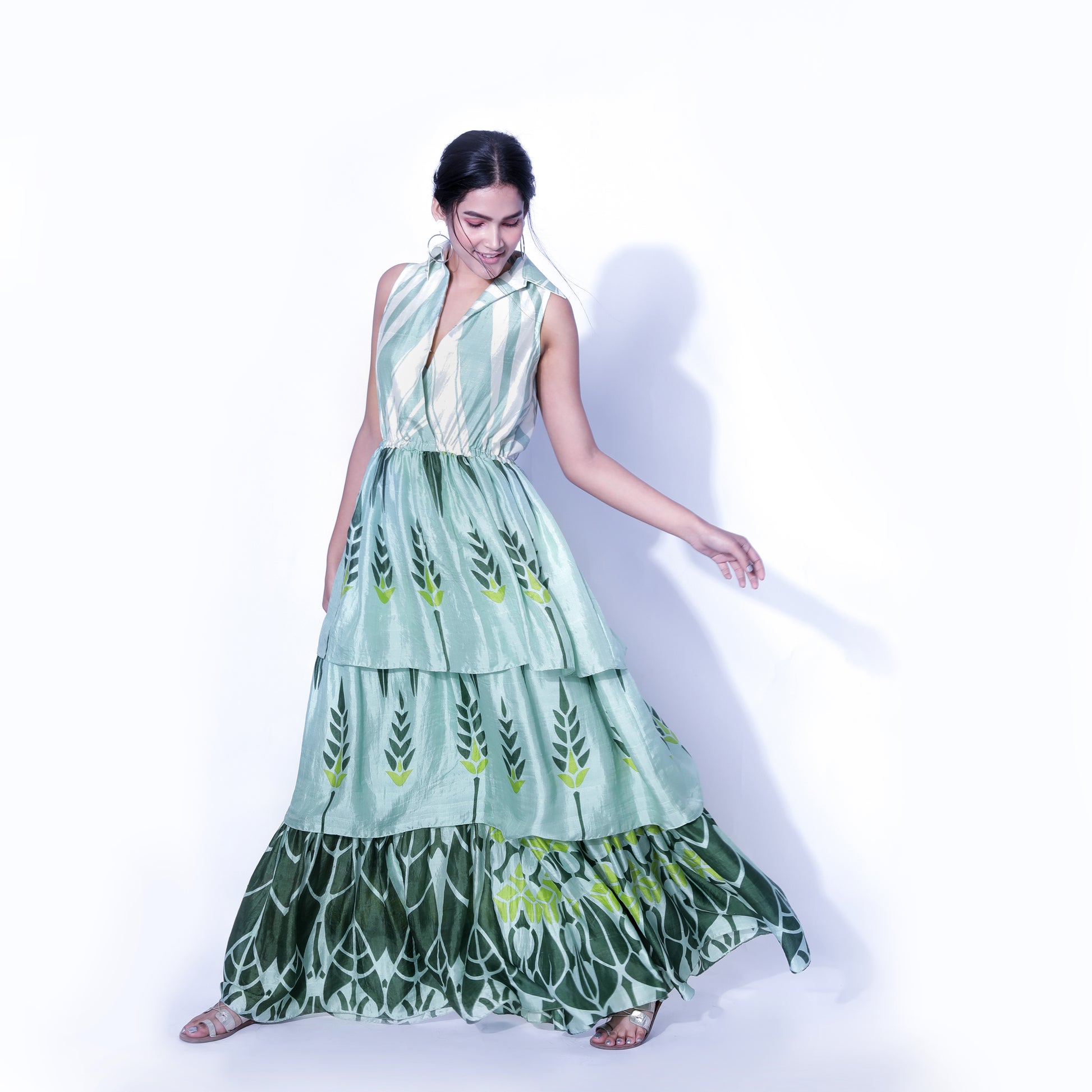 Hand-screen-printed 3-tier dress in Bengal handloom silk