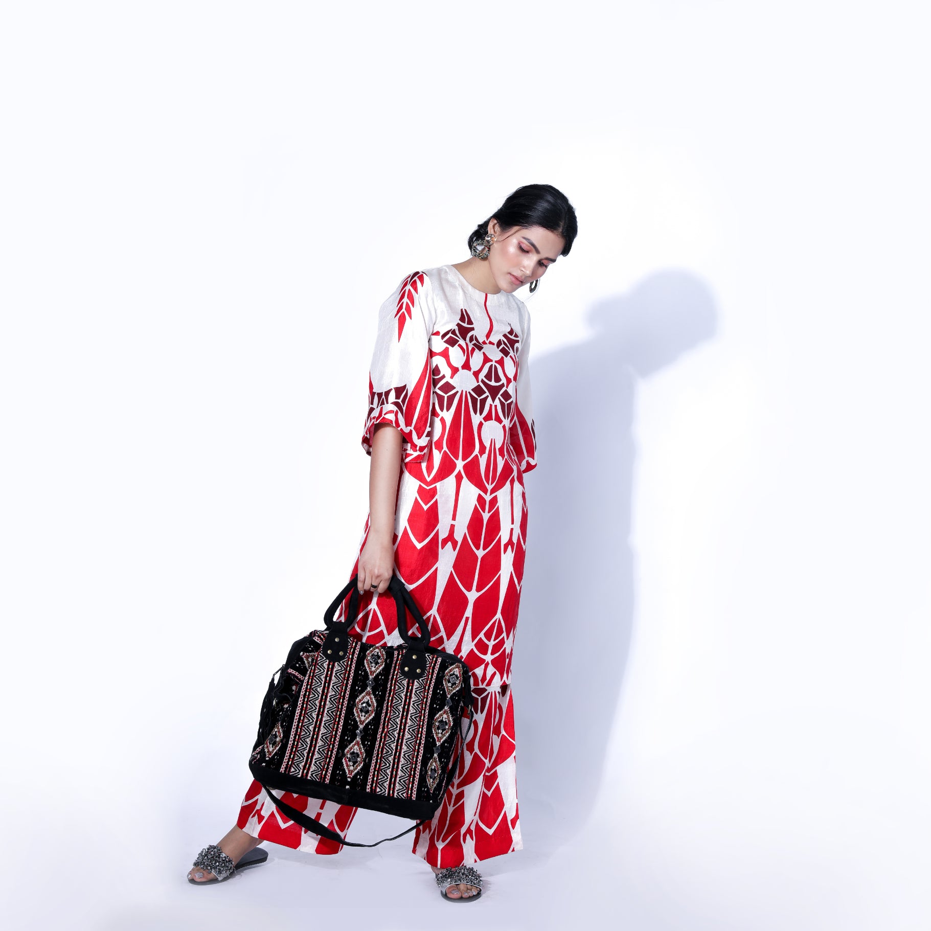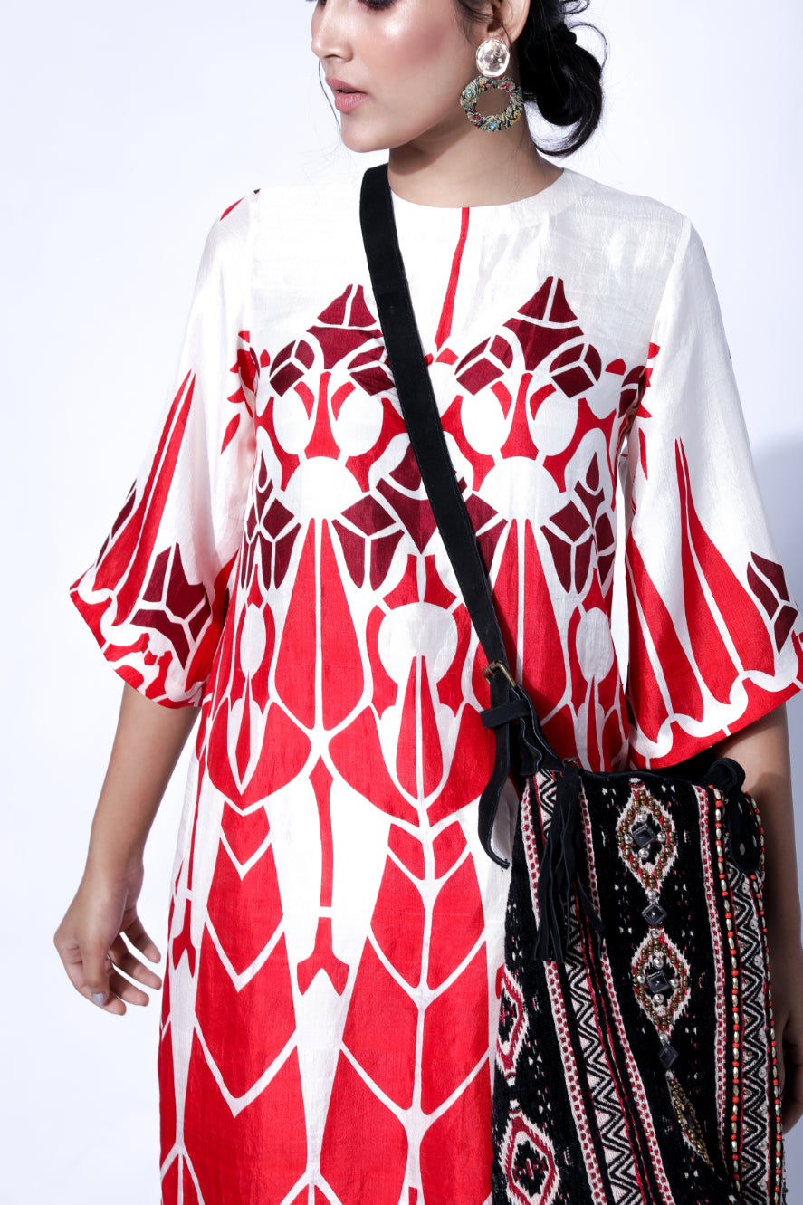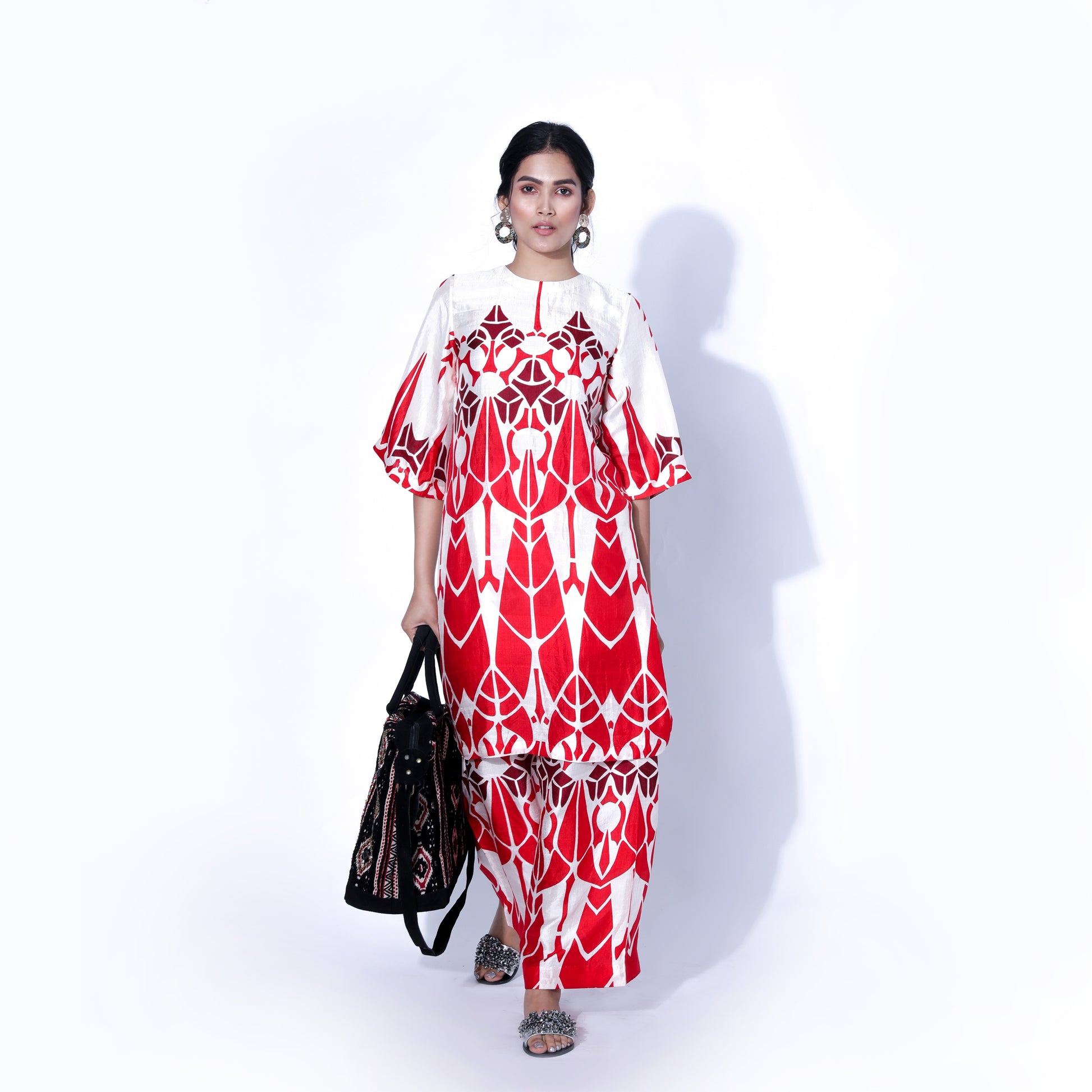 Hand-screen-printed tunic dress and pant set in Bengal handloom silk.