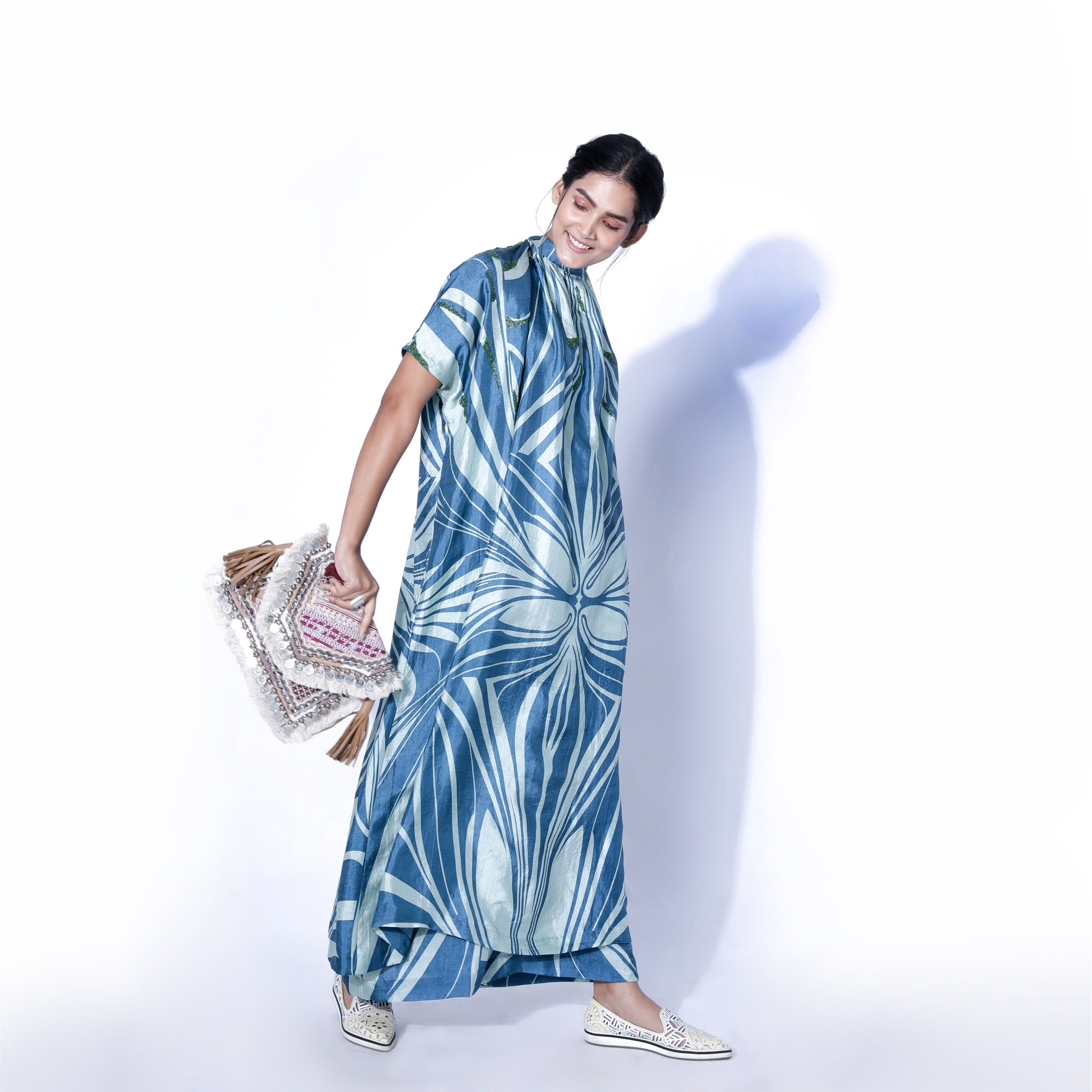 Hand-screen-printed tunic dress in Bengal handloom silk with embroidery detailing.