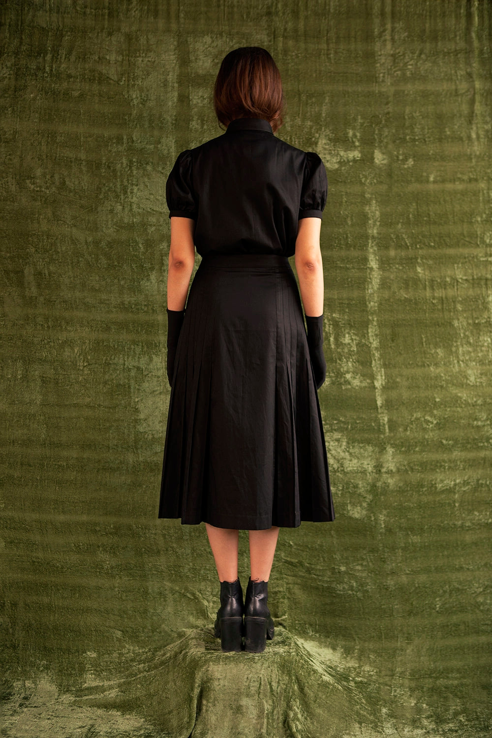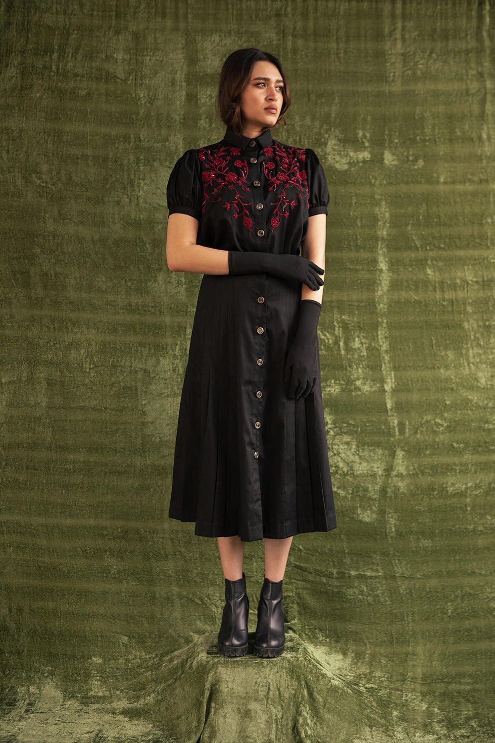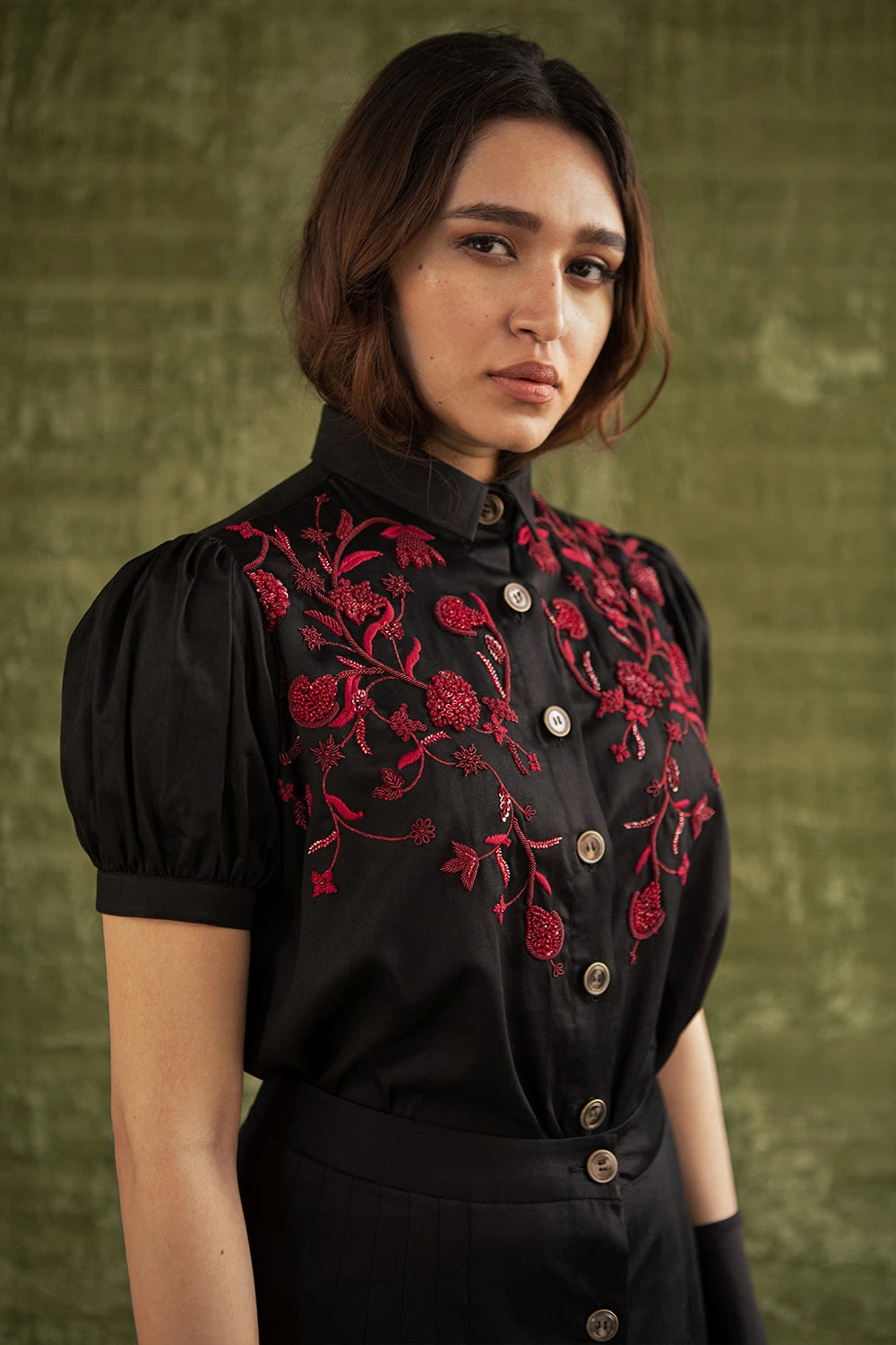 The button-down classic black cotton satin shirt reinvents the timeless style. It features delicate floral embroidery in red with antique metal buttons down the front.