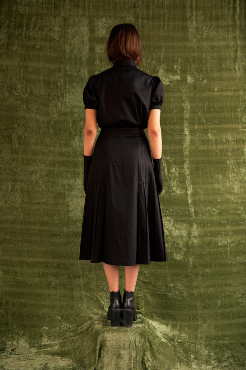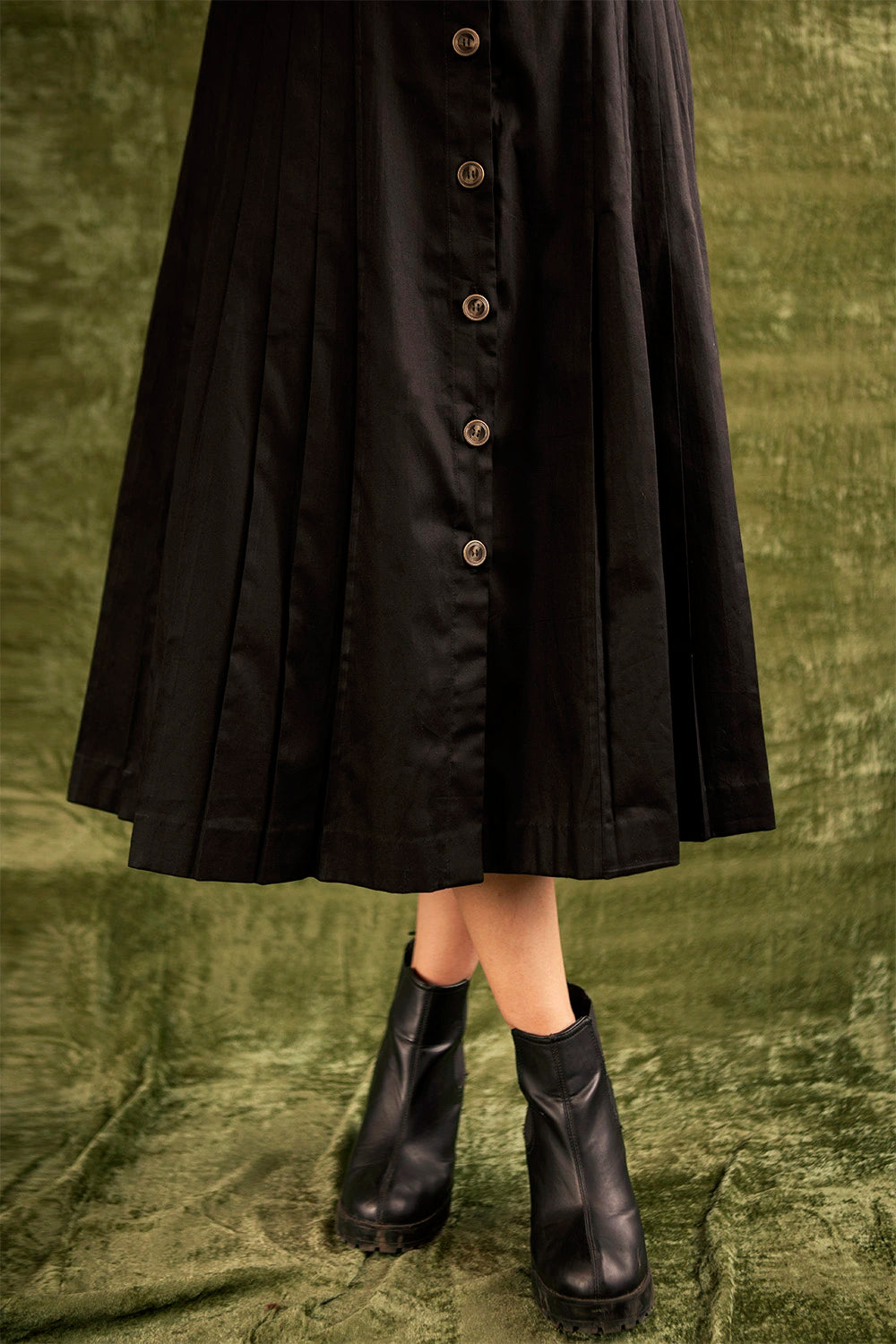 The black front button-down skirt is made using a cotton satin blend. It is of a mid length with big antique metal buttons. It features knife pleats on sides of the skirt.