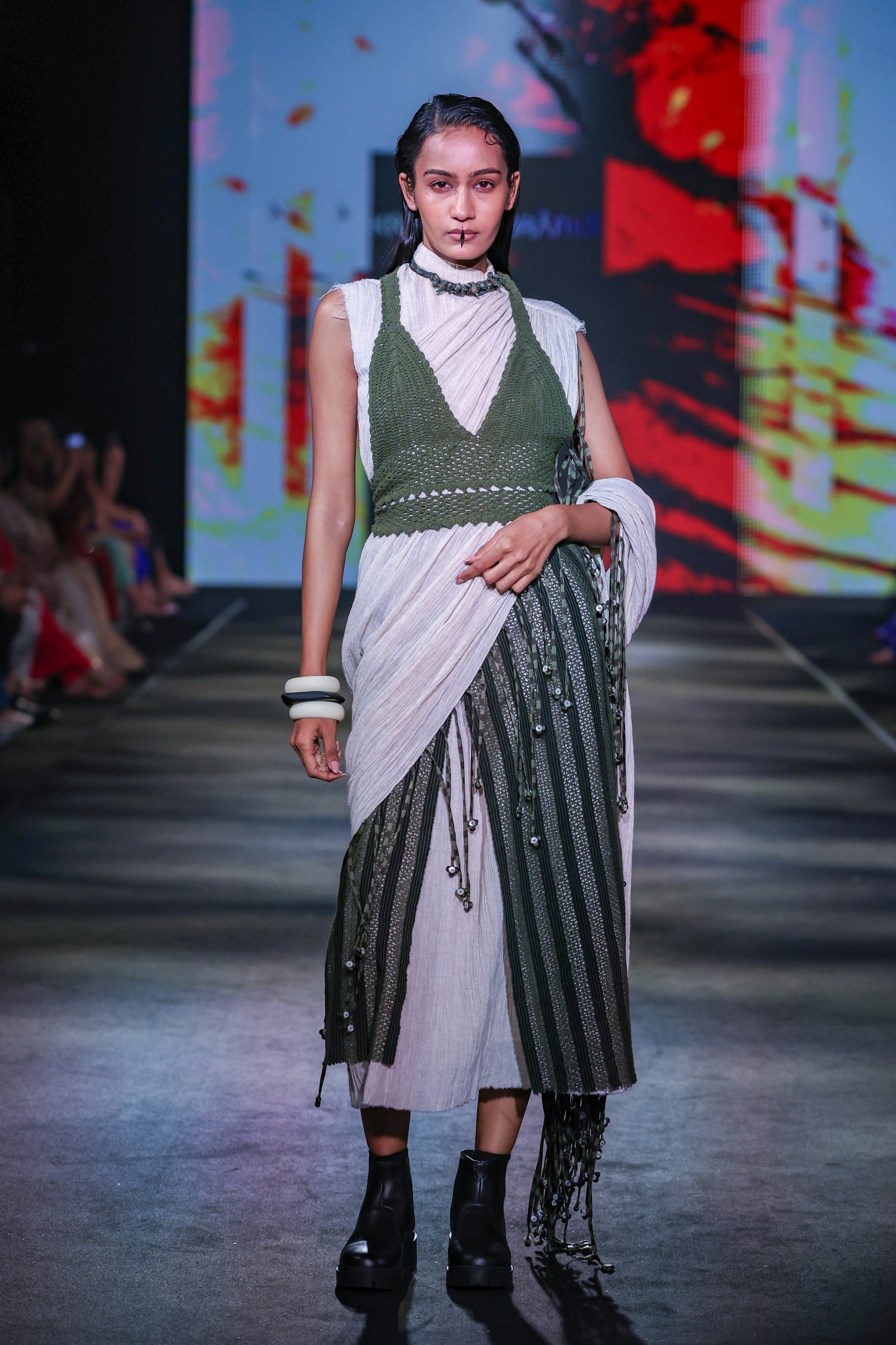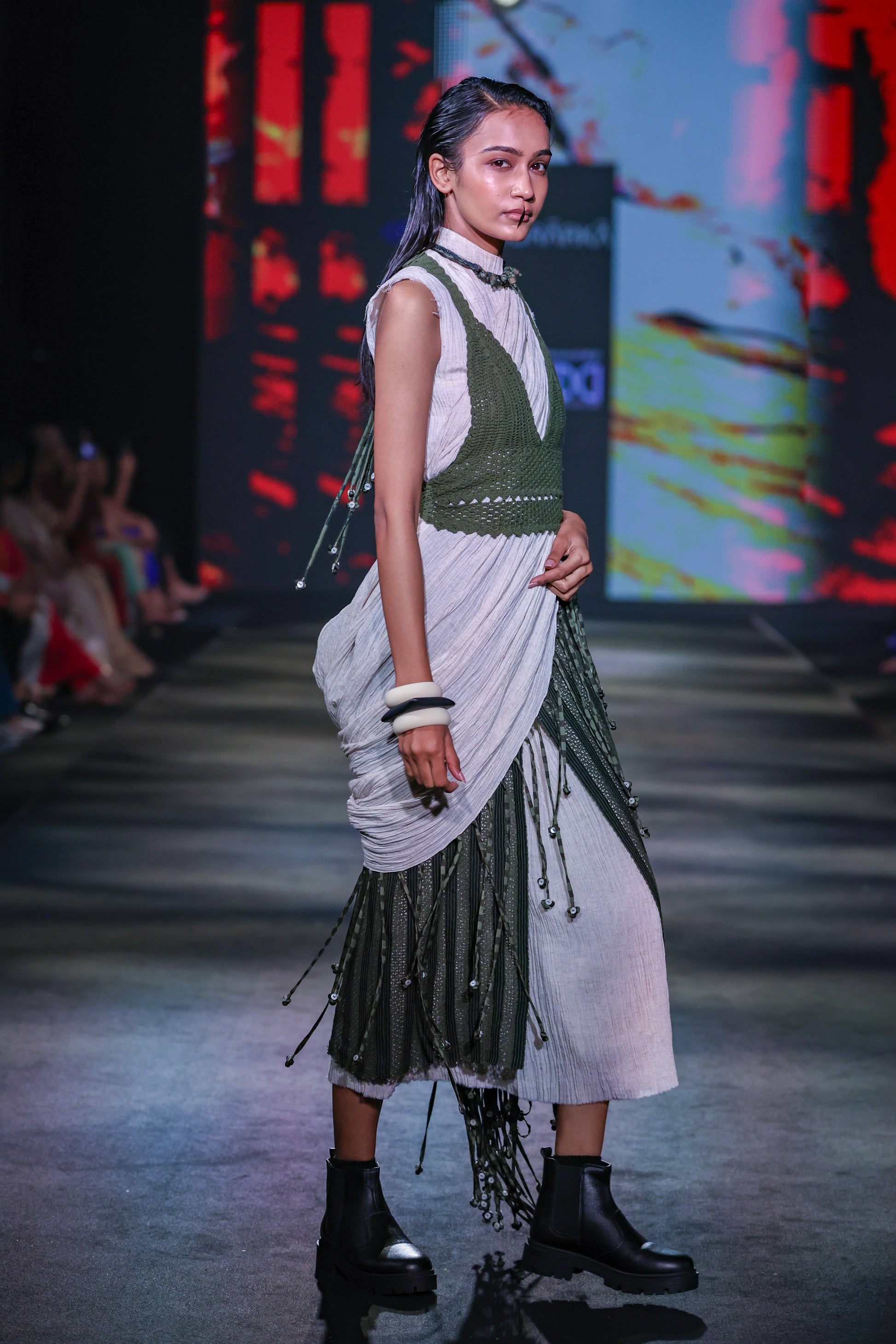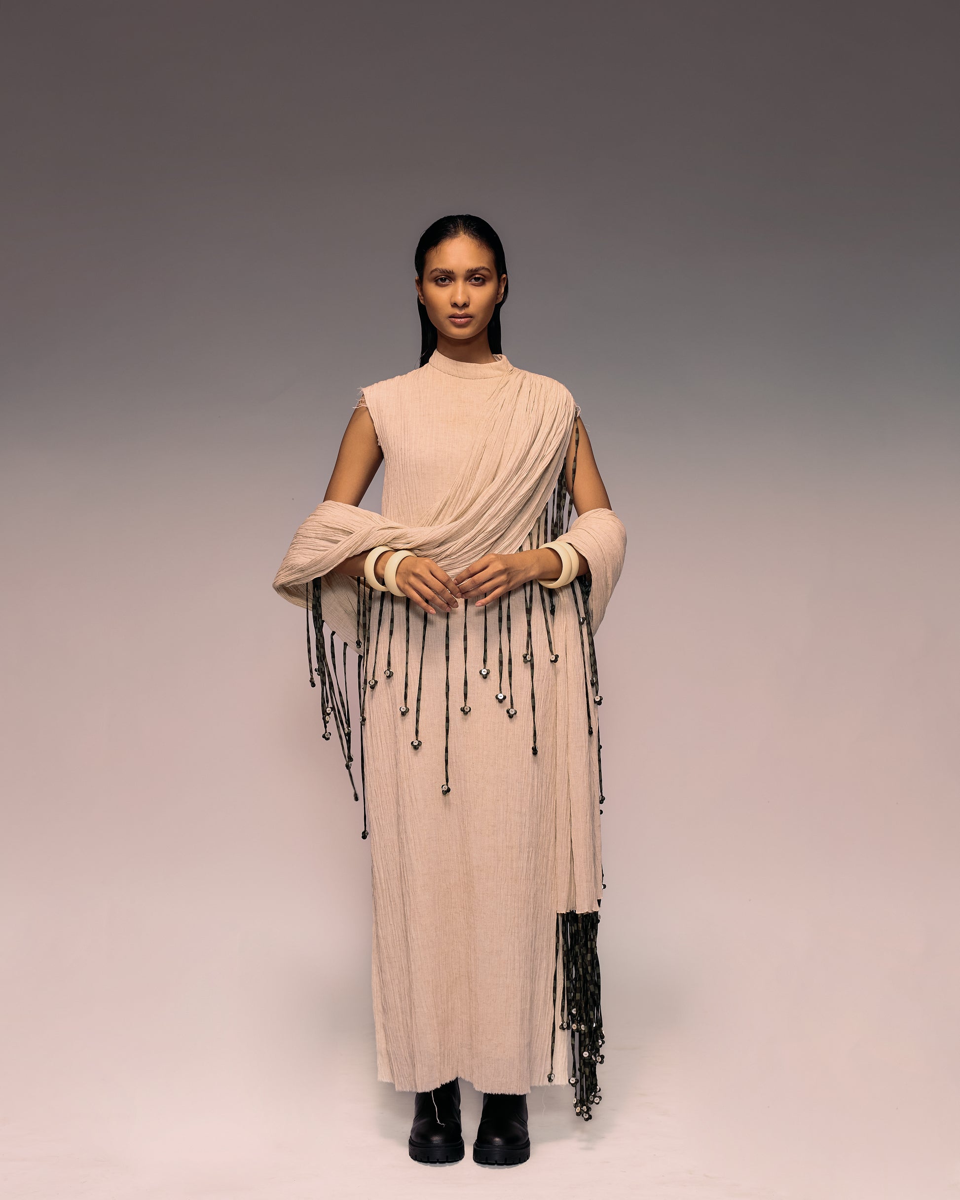A timeless fusion of artistry and ease, the Ivory Crushed Tassel Scarf Dress is crafted from textured, wrinkled cotton for a raw, organic look. The straight silhouette features an attached shoulder scarf detailed with olive-check cords and tactile round tassel balls along the edges, adding movement and character. The scarf can be draped like a saree pallu or dupatta for styling versatility. Perfect for resort evenings, summer gatherings, or daytime elegance.