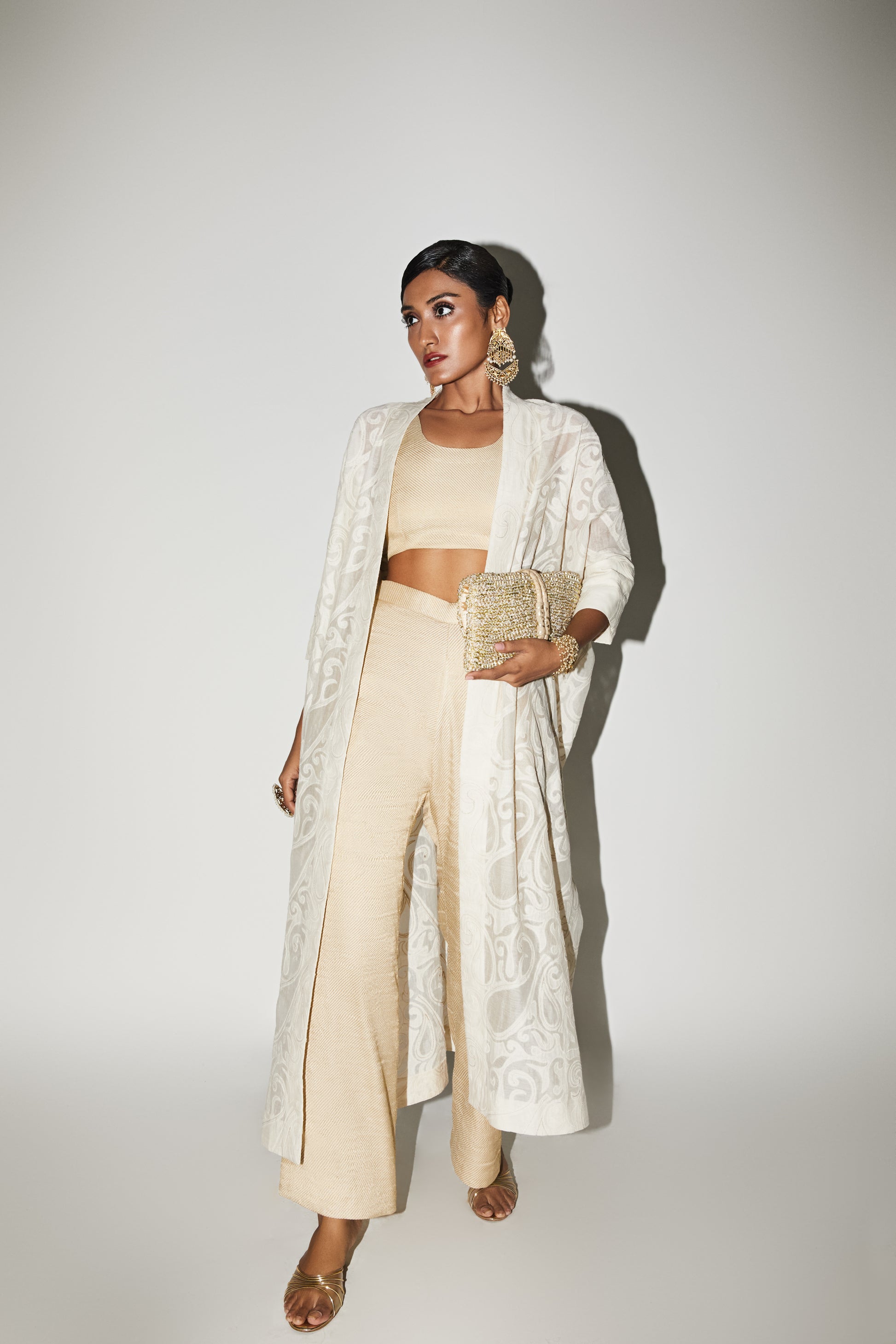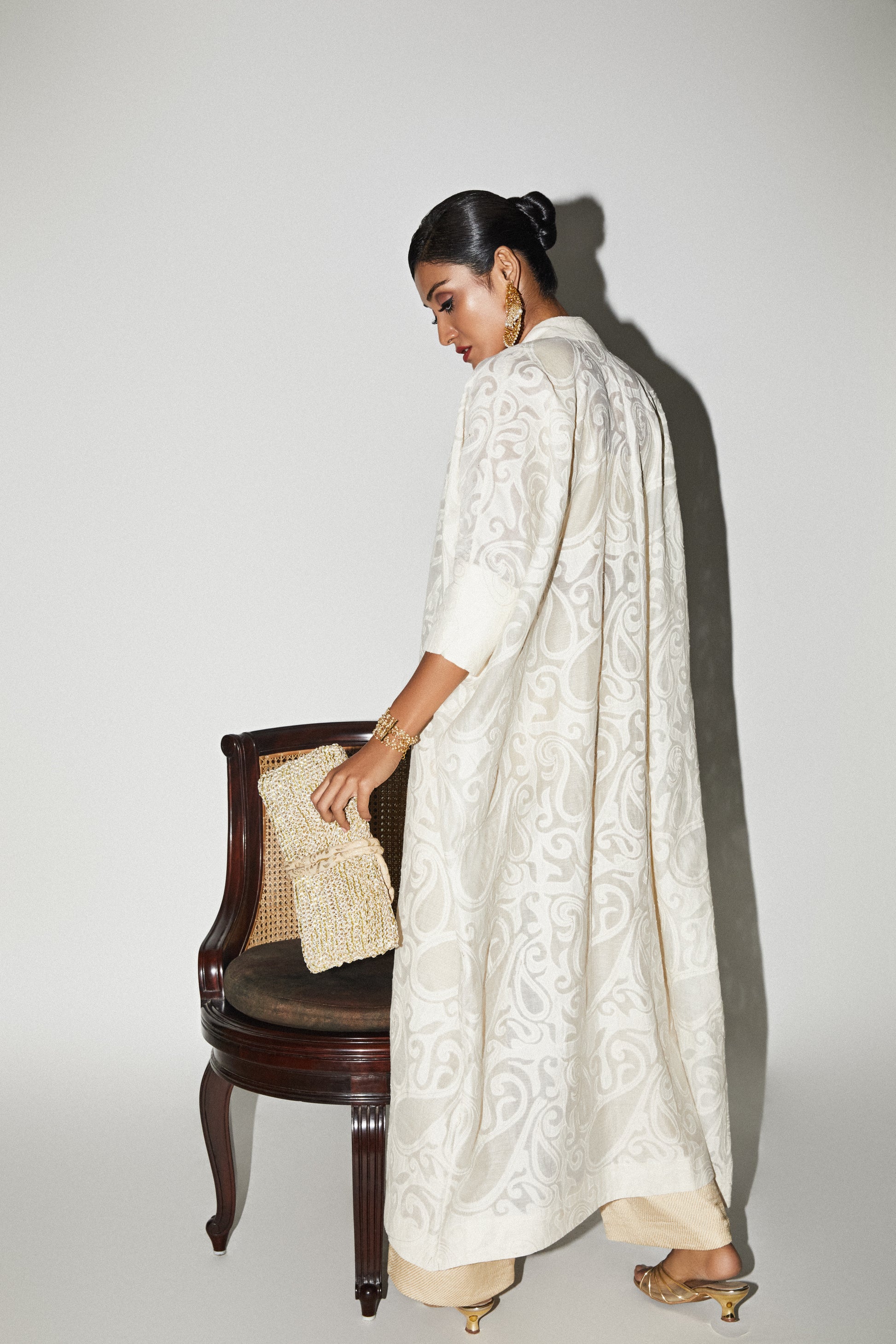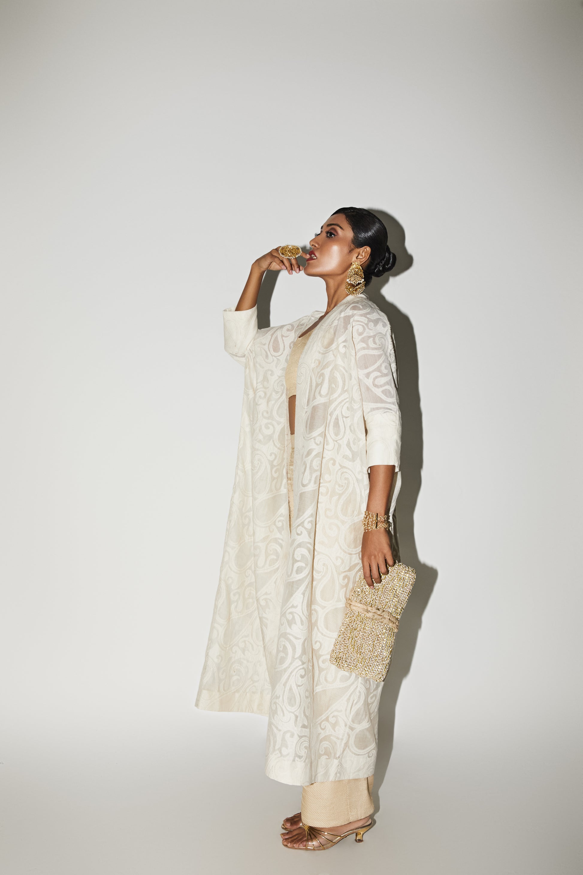 This jacket is made out of applique fabric with a relaxed, flowy silhouette, decorated with subtle embroidery detailing. Pair yours with tailored sets to stay stylish.
