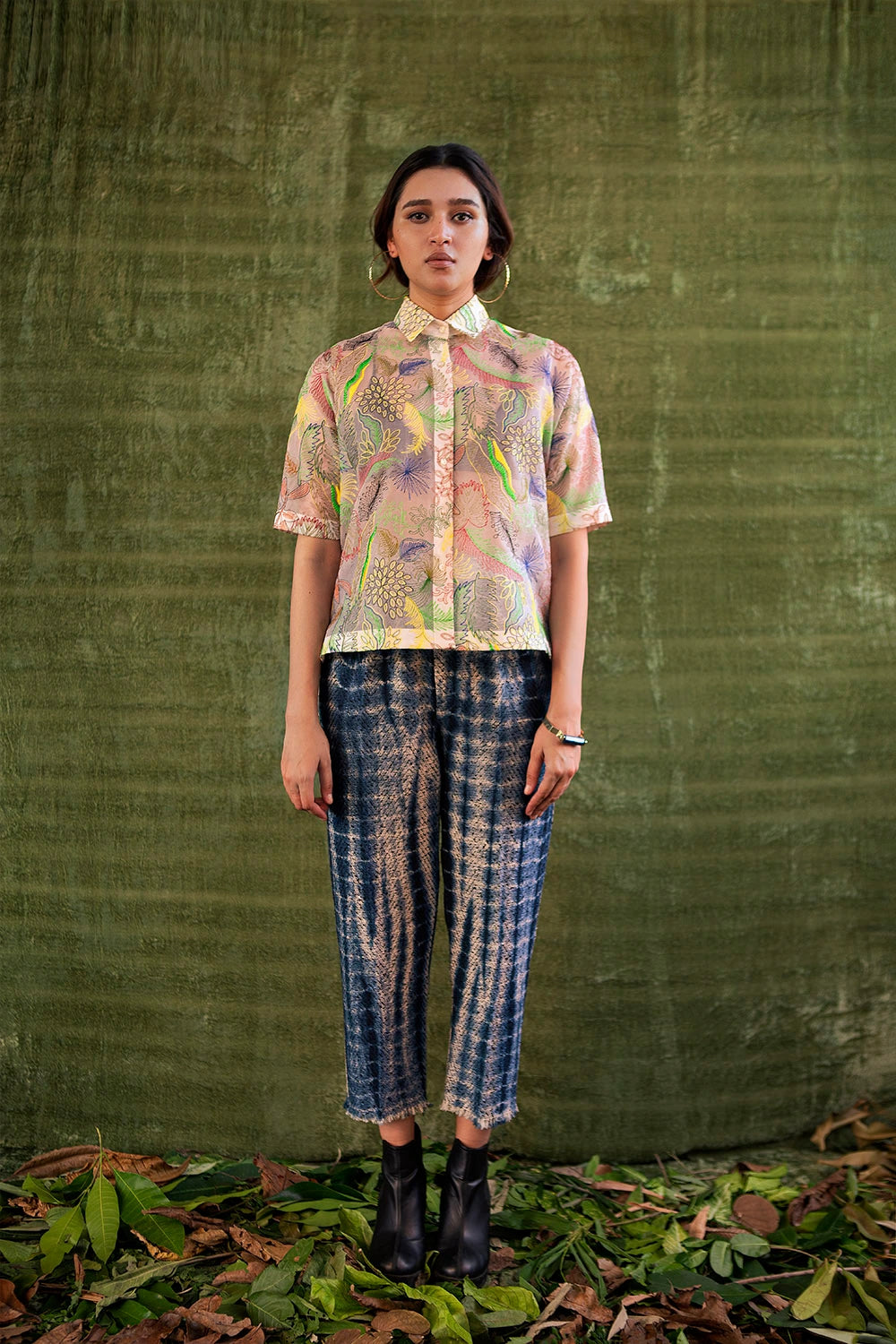 The multi-coloured button-down shirt is crafted in handloom organza silk. Pleats at the back with a cross strap signify the mobster style, whereas the all-over thread embroidery of a variety of leaves pays homage to the gardens of Bali.