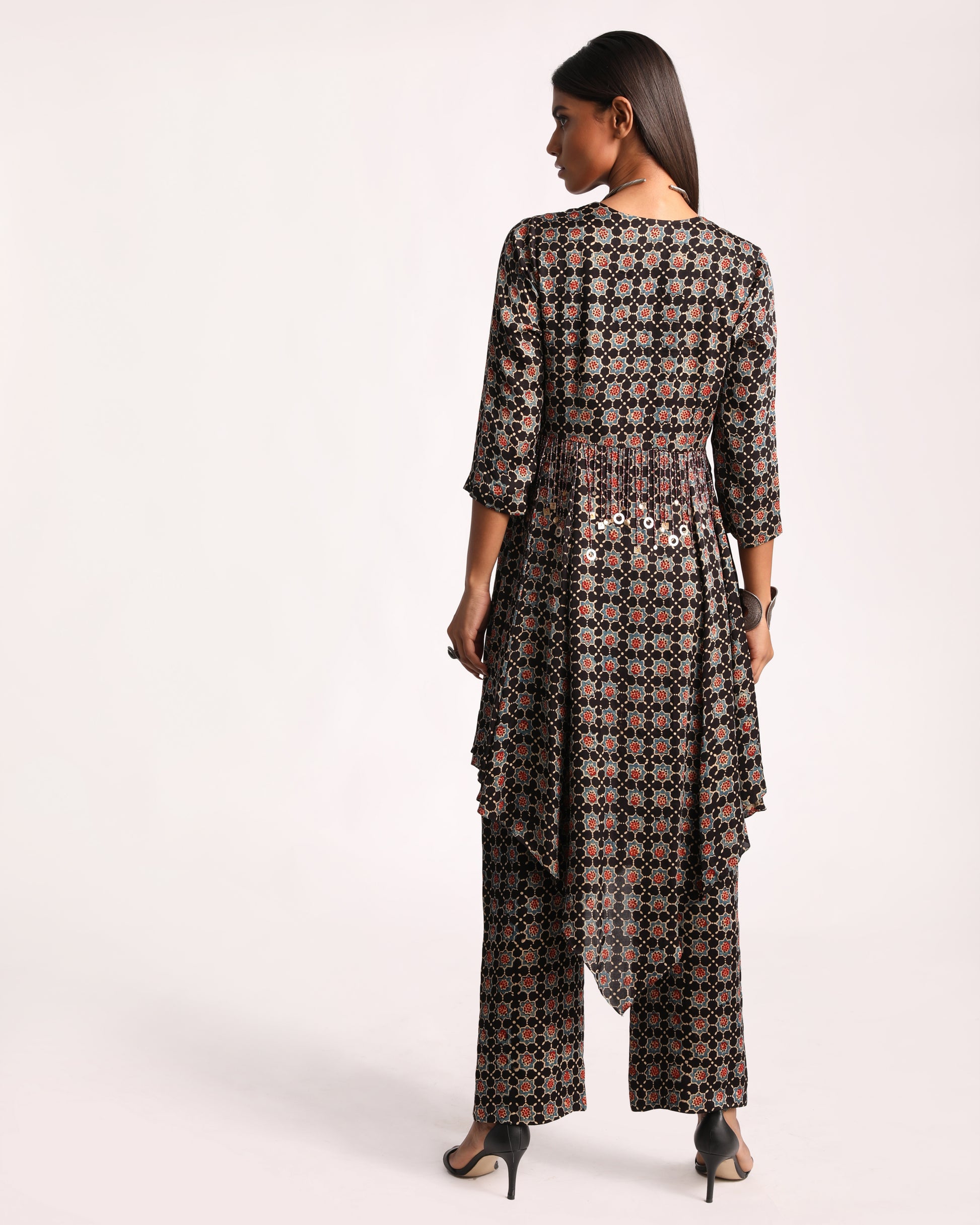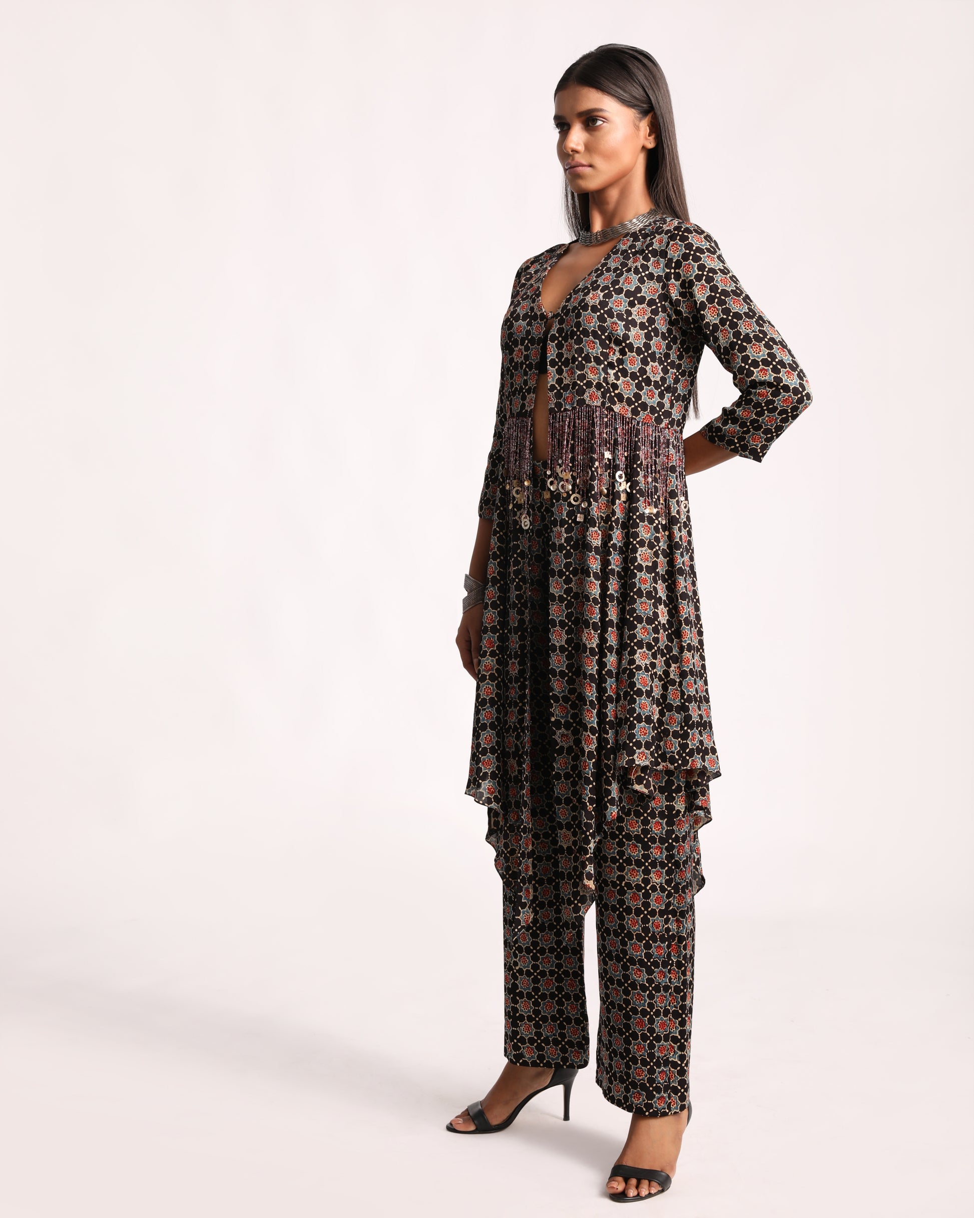 "Cut from satin with conventional ajrakh print by traditional craftspeople, this tunic with minimal highlight embroidery has a plunging neckline, metallic fringes at the waist and a flounce hemline. The tunic is paired with matching pants to form a perfect co-ord set.