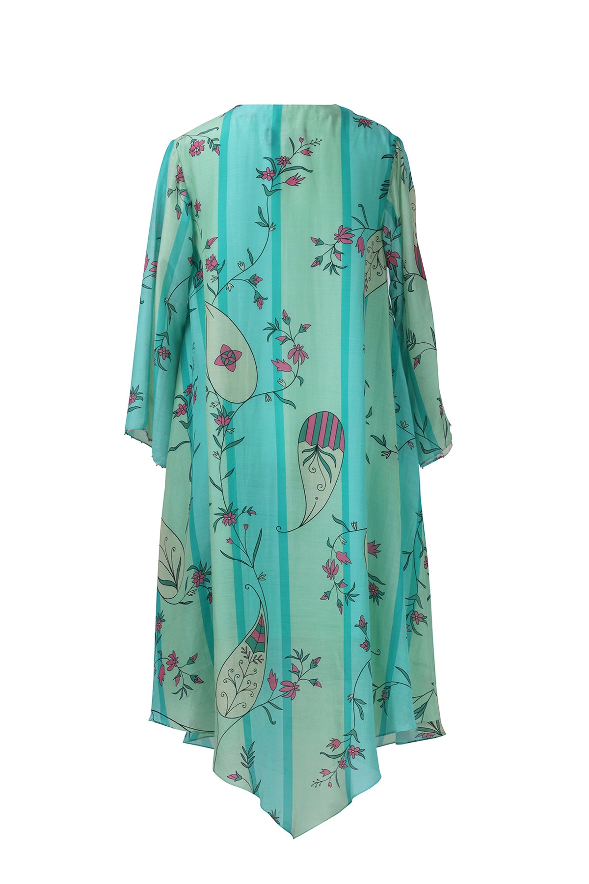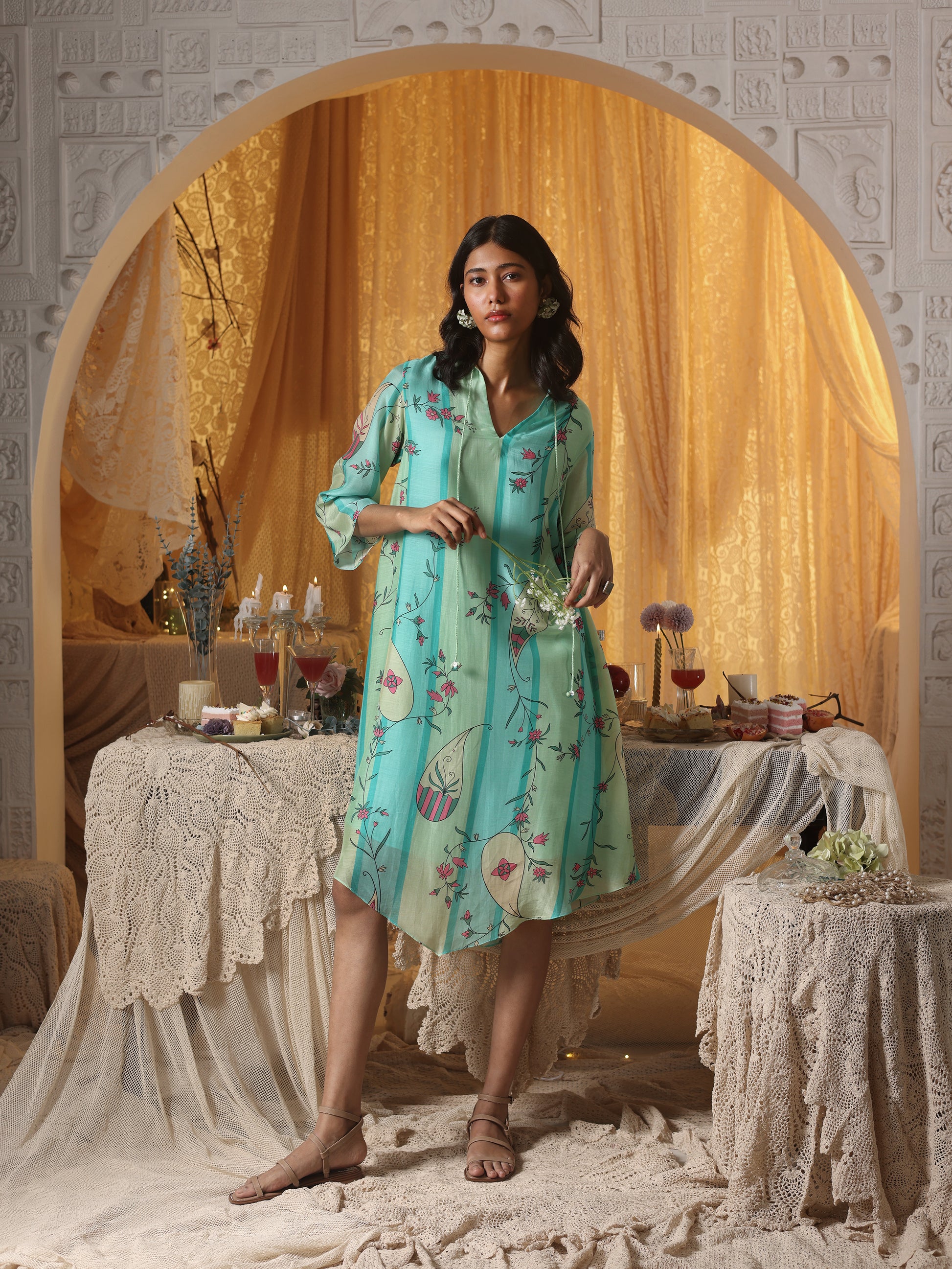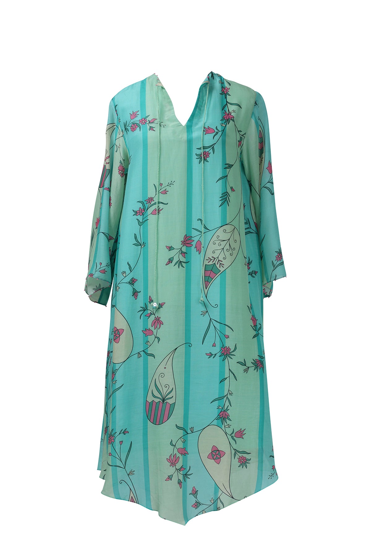 Infused with breezy elegance, this tunic dress blends soft cotton silk with an artistic mix of mint-blue thick stripes, paisley motifs, and delicate floral prints. The lightweight fabric feels gentle on the skin—ideal for humid days or breezy evenings. Featuring a V-neckline with braided thread tie-up detail, this silhouette flows effortlessly for a relaxed yet refined look. Whether worn as a dress or layered over pants or swimwear, it's your ultimate tropical travel companion.