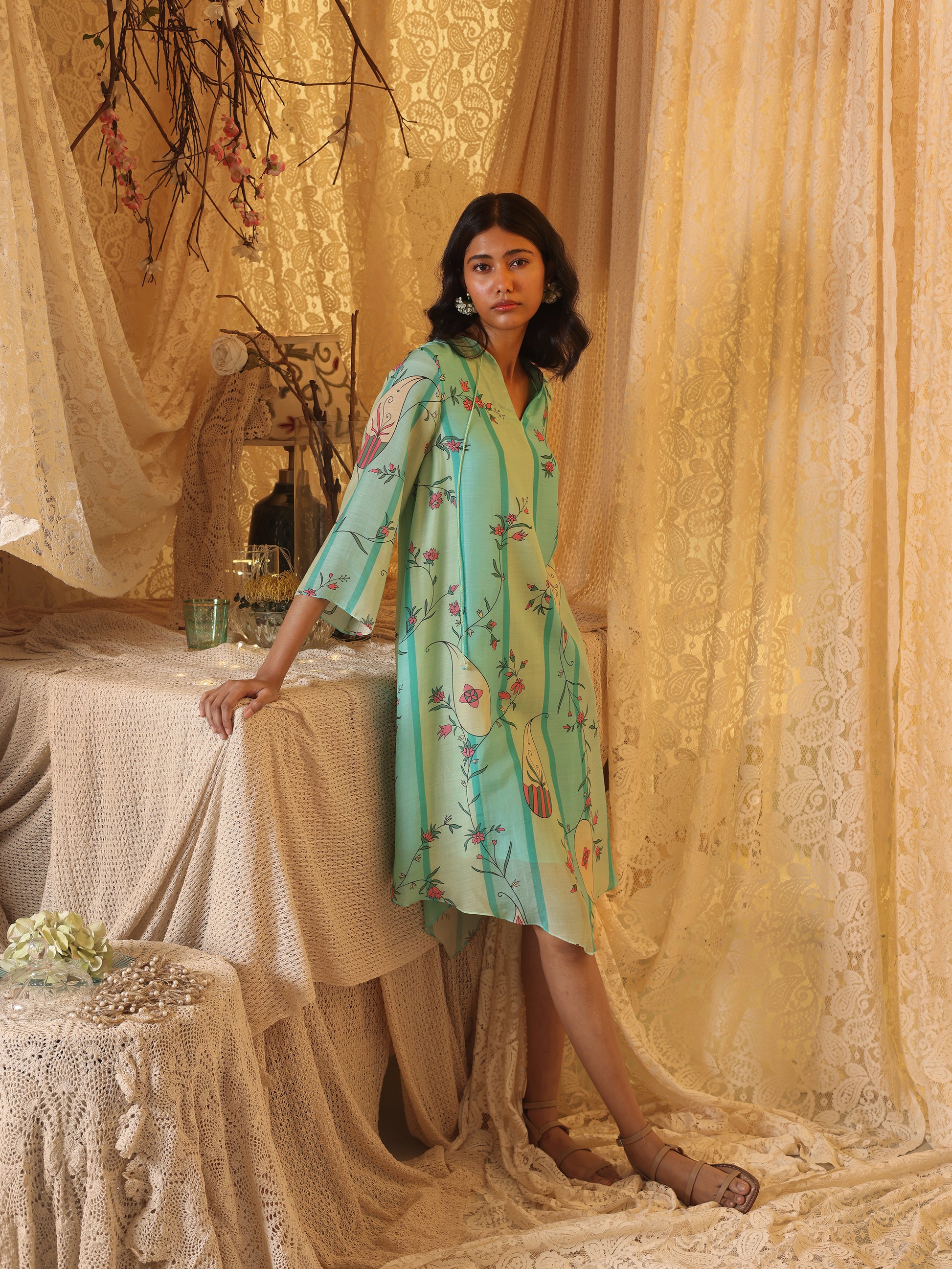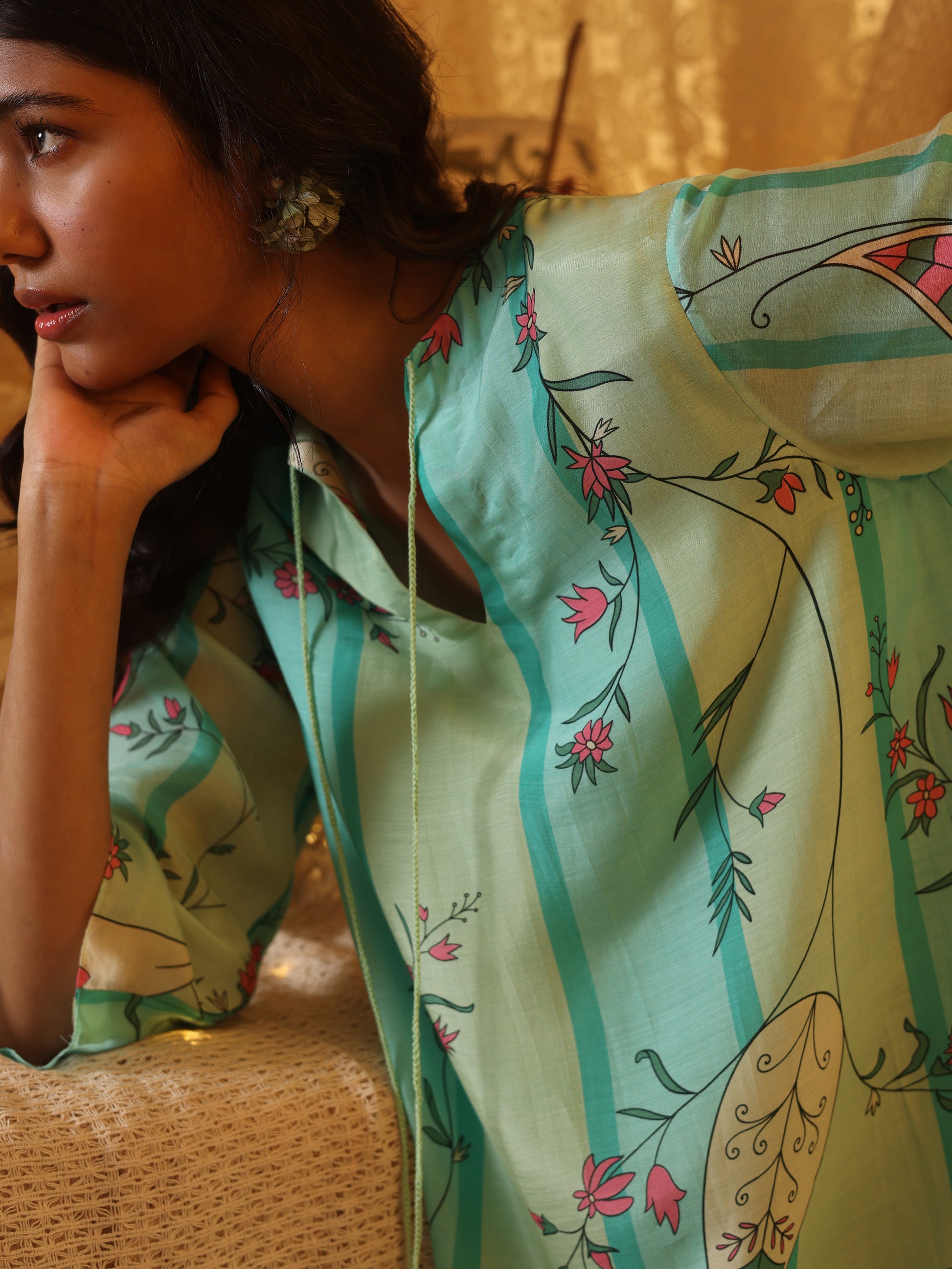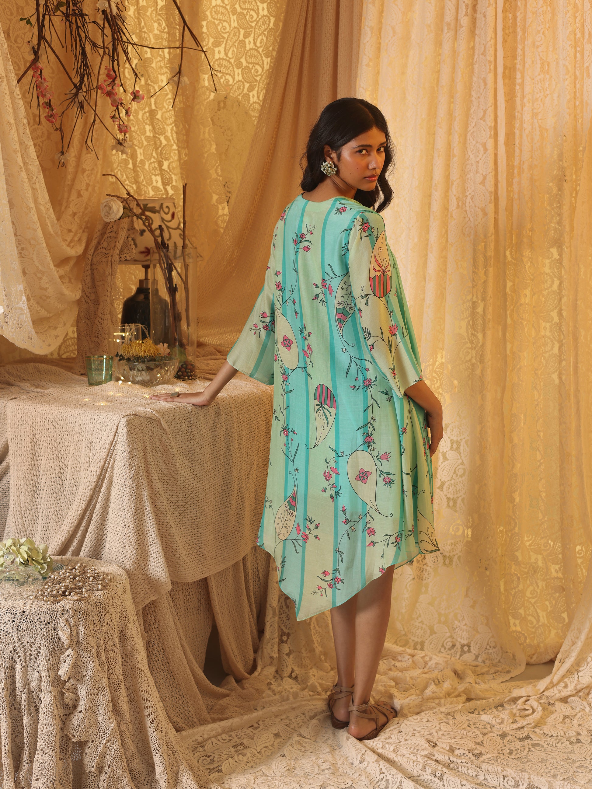 Infused with breezy elegance, this tunic dress blends soft cotton silk with an artistic mix of mint-blue thick stripes, paisley motifs, and delicate floral prints. The lightweight fabric feels gentle on the skin—ideal for humid days or breezy evenings. Featuring a V-neckline with braided thread tie-up detail, this silhouette flows effortlessly for a relaxed yet refined look. Whether worn as a dress or layered over pants or swimwear, it's your ultimate tropical travel companion.
