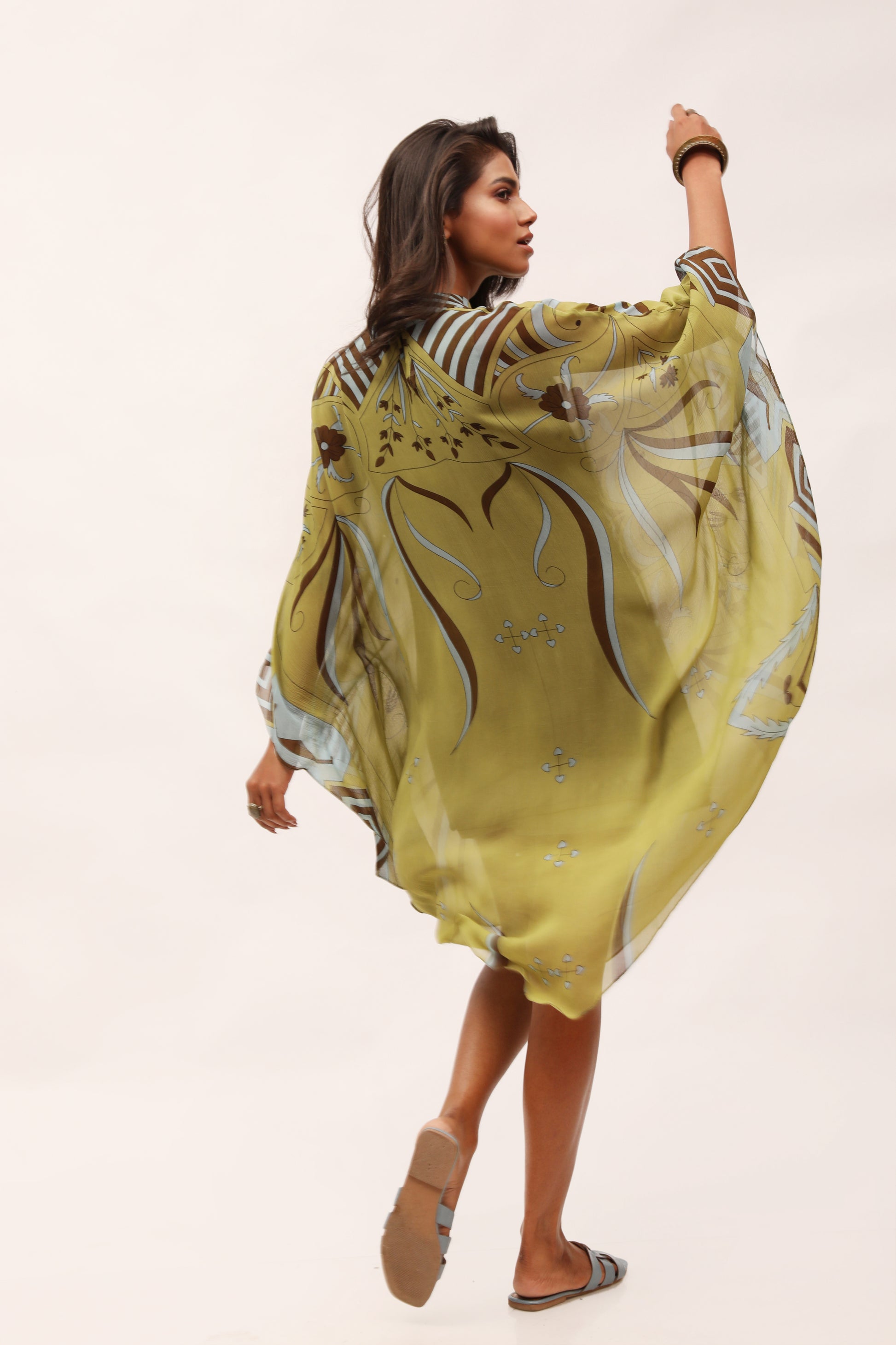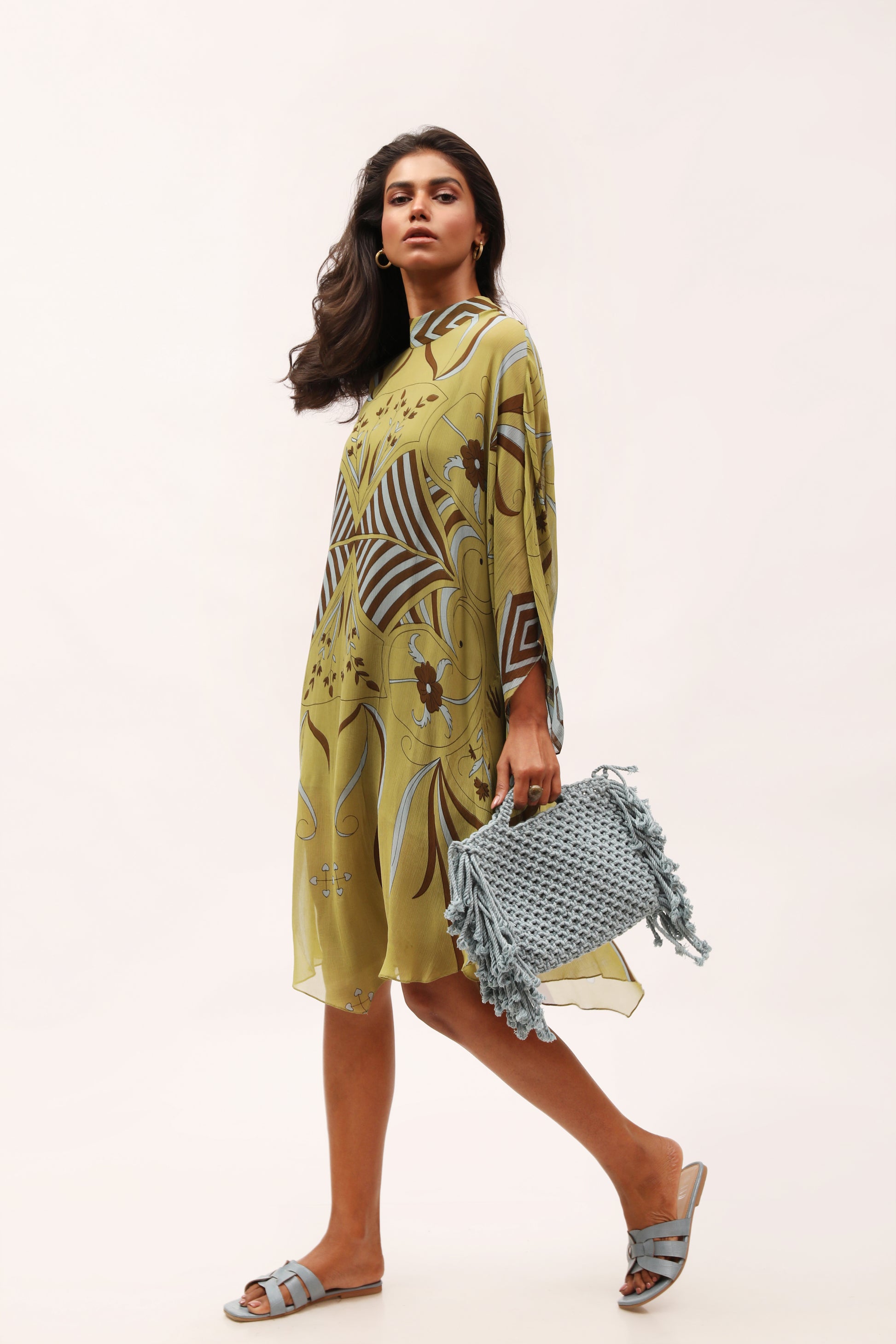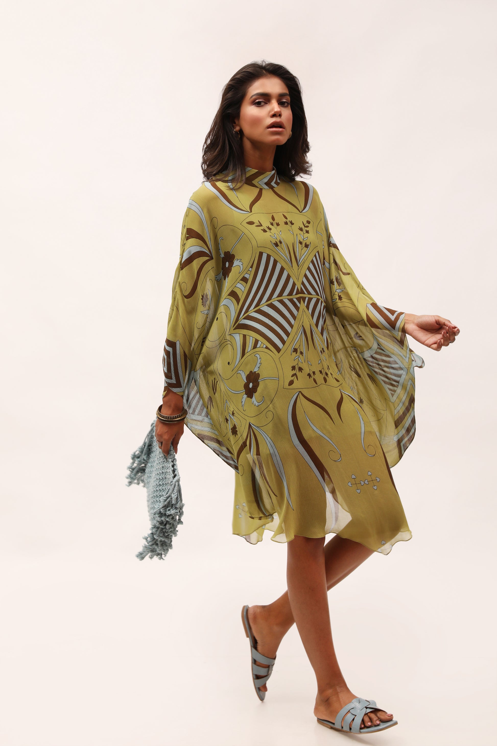 Mint Green Chiffon Batwing Dress With Floral Motifs