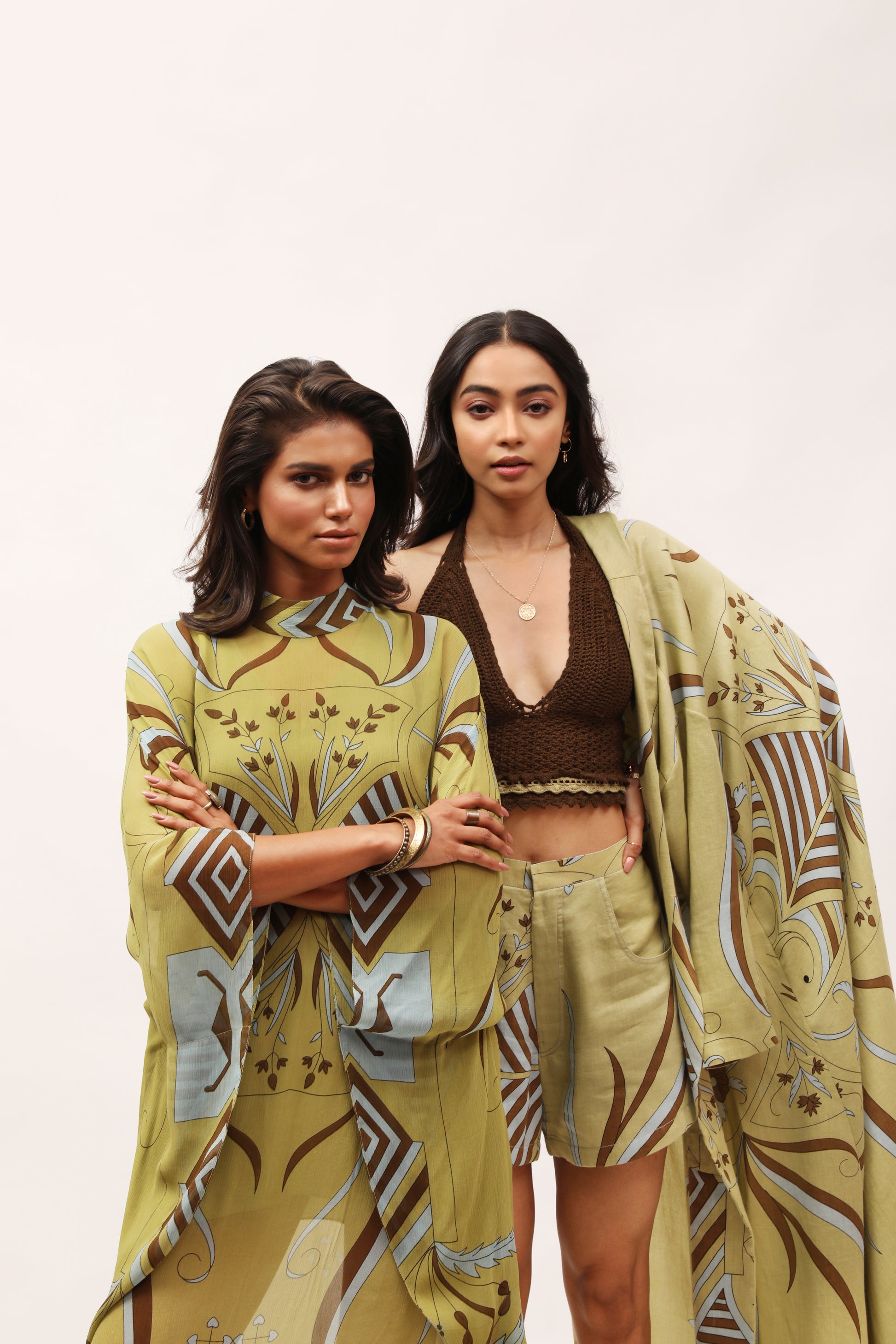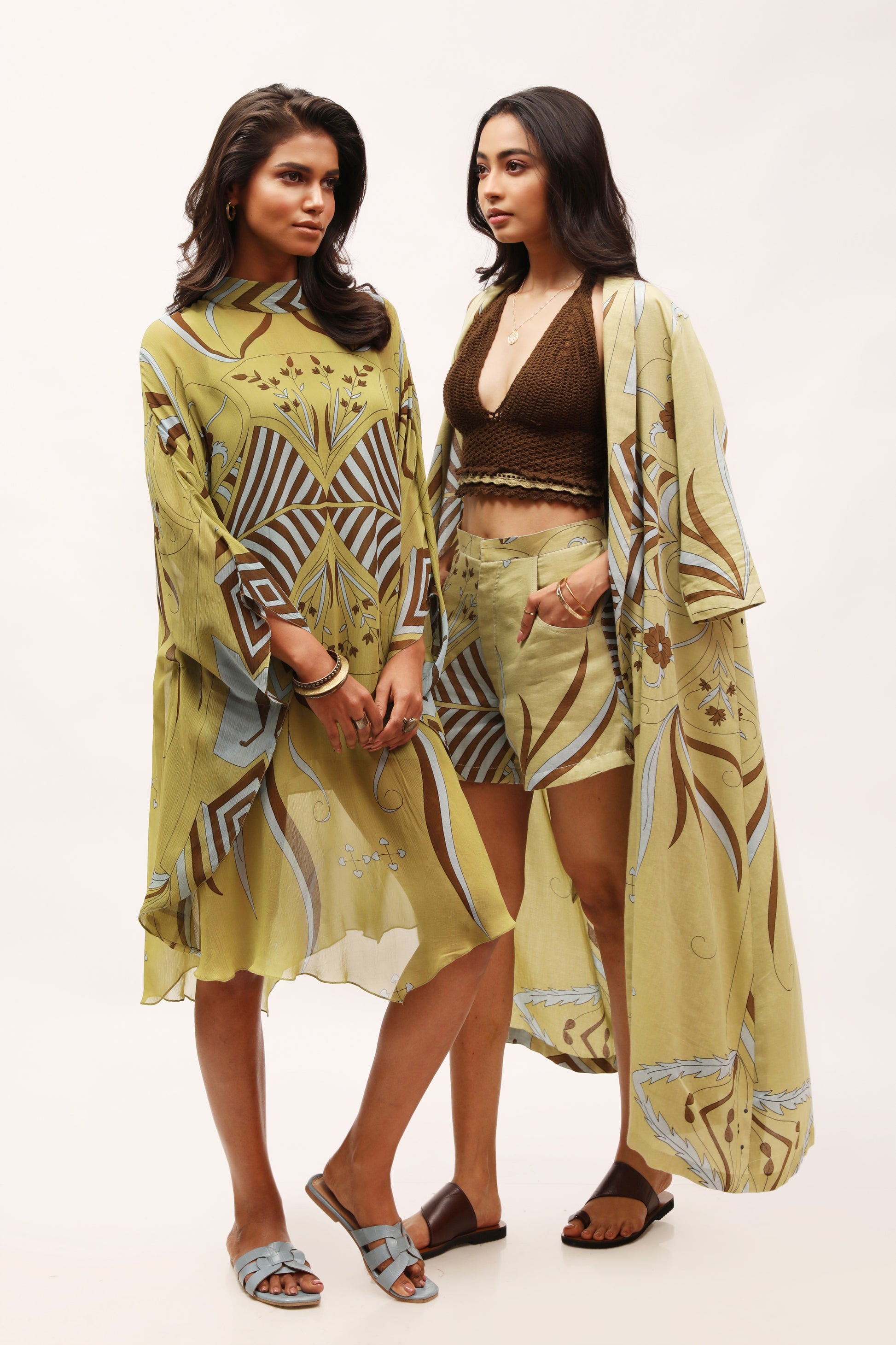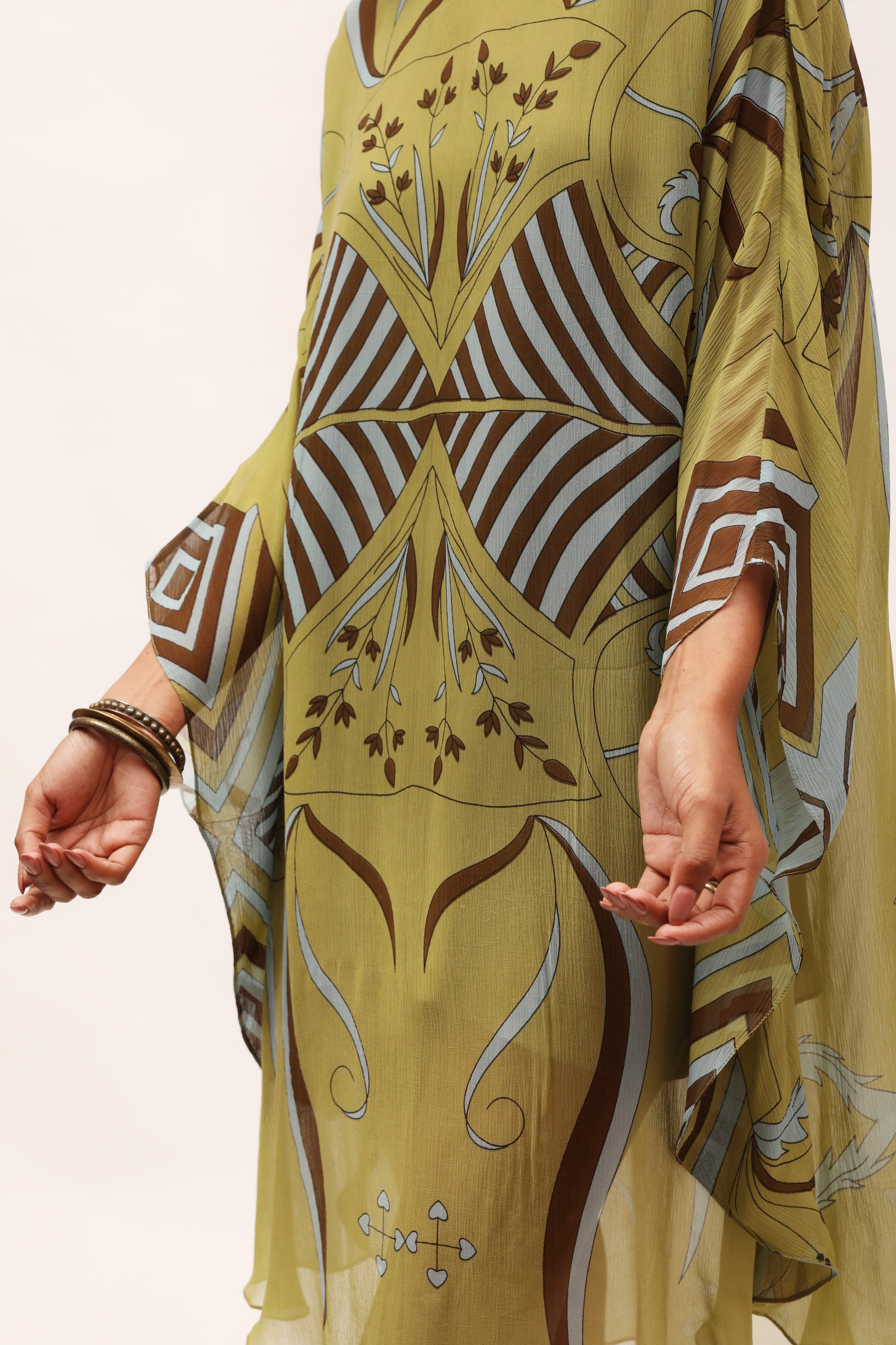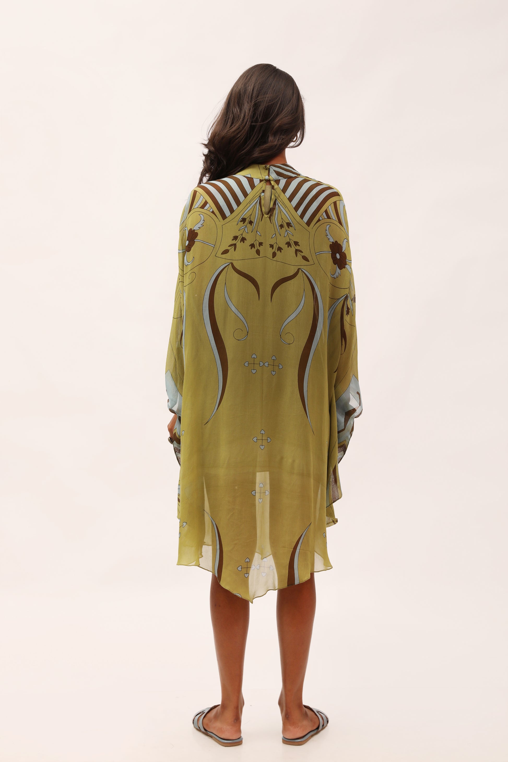 Mint Green Chiffon Batwing Dress With Floral Motifs