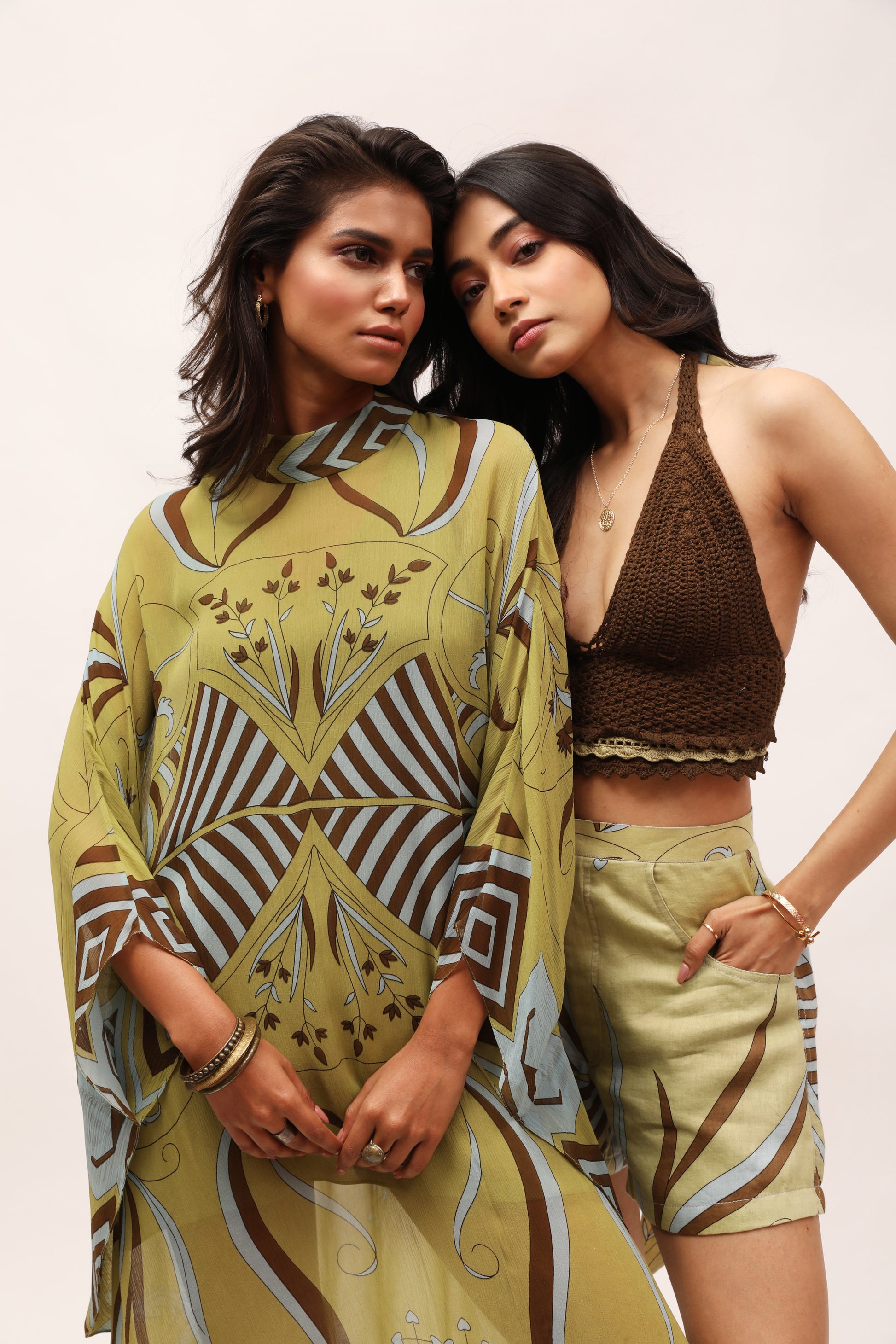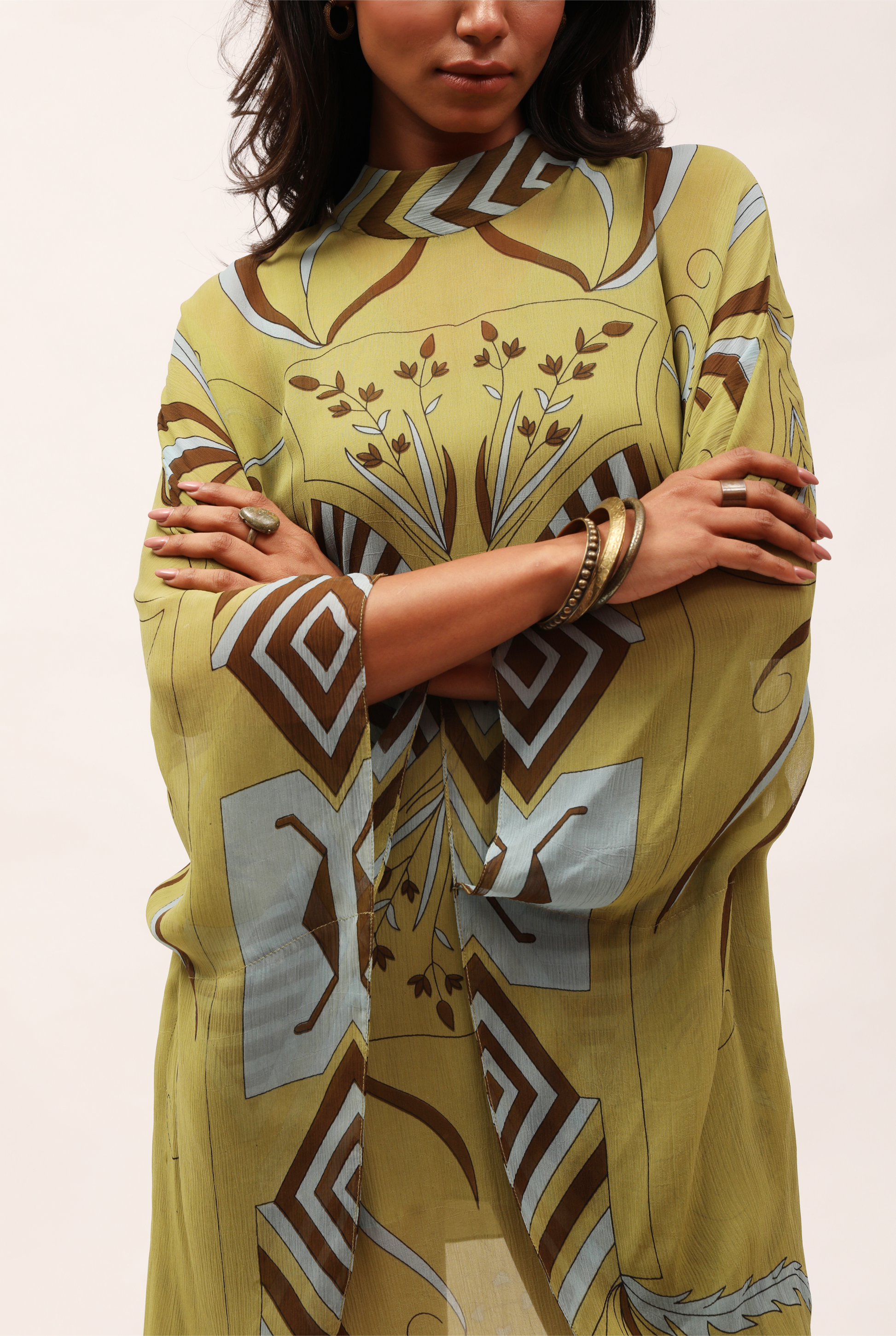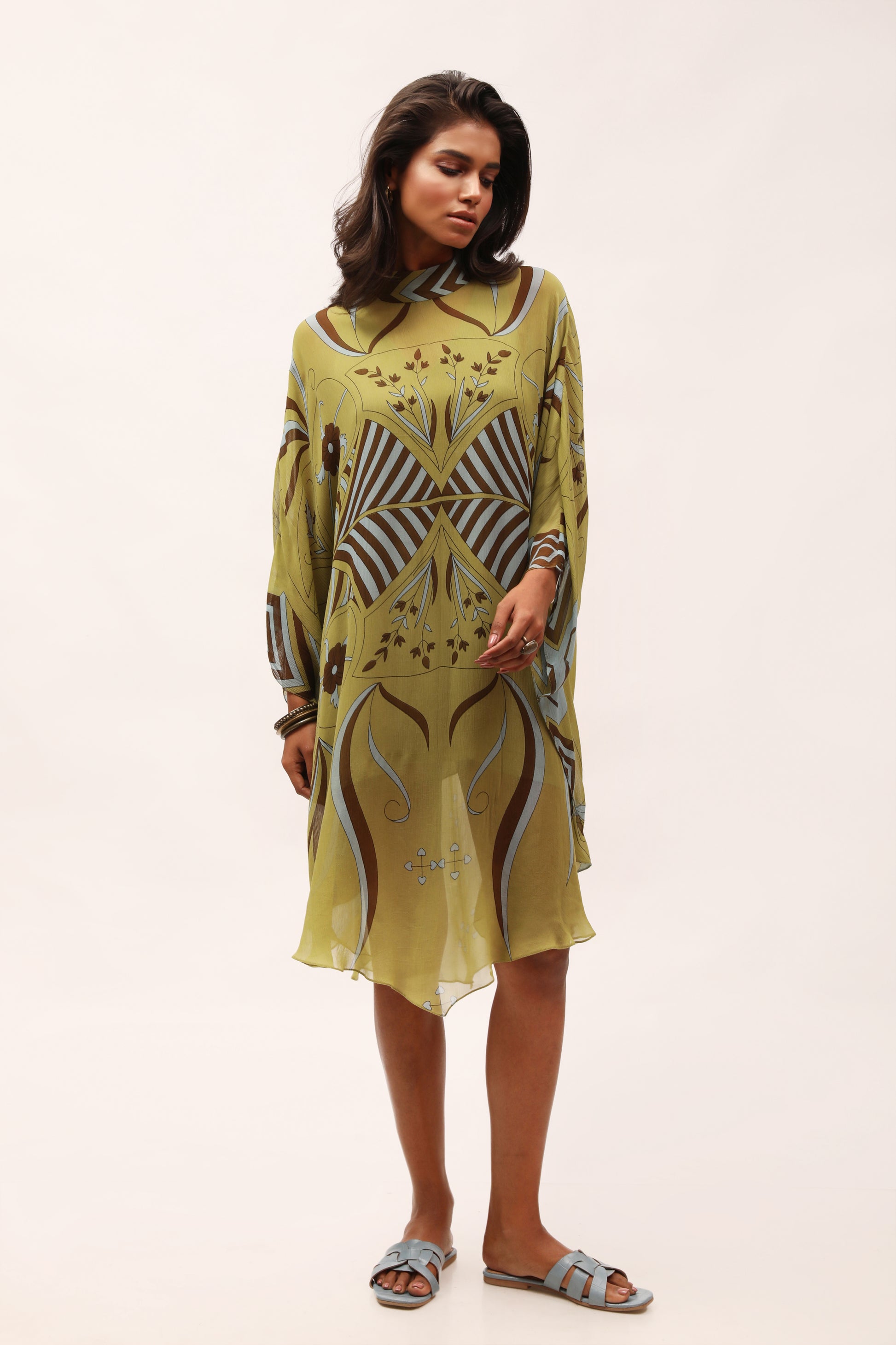 Made from chiffon, this printed, relaxed-fit tunic dress features batwing sleeves and a high neckline for a comfortable and easy-chic look. Team it up with pants for a formal look.