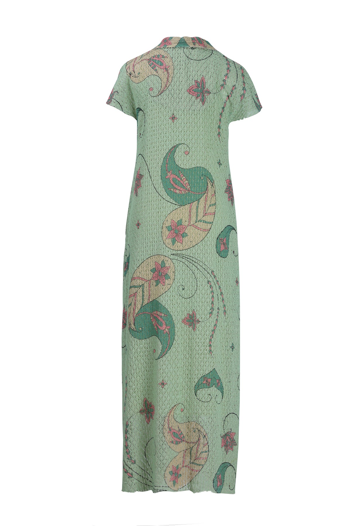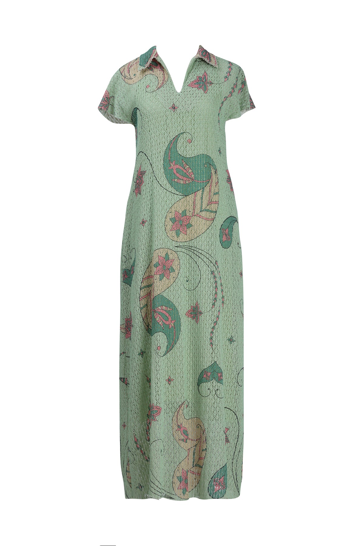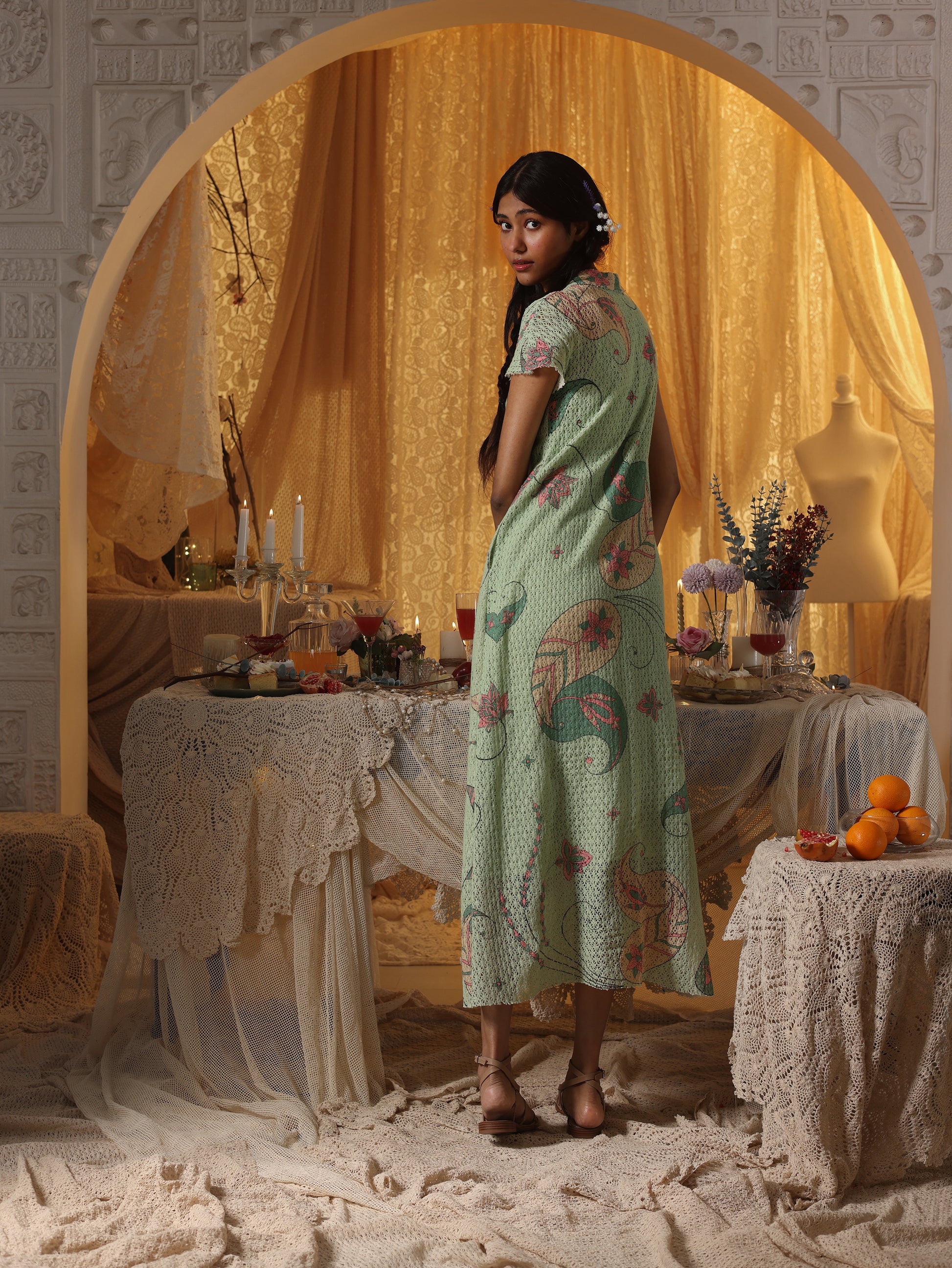 Breeze through your vacation in this elegant mint green maxi, crafted in lightweight cotton net for airy comfort. Featuring an intricate paisley print that evokes traditional charm, the dress is tailored with a collared neckline for a polished yet relaxed silhouette. Perfect for beachside brunches or monsoon escapes, this maxi blends structure with fluidity, making it a