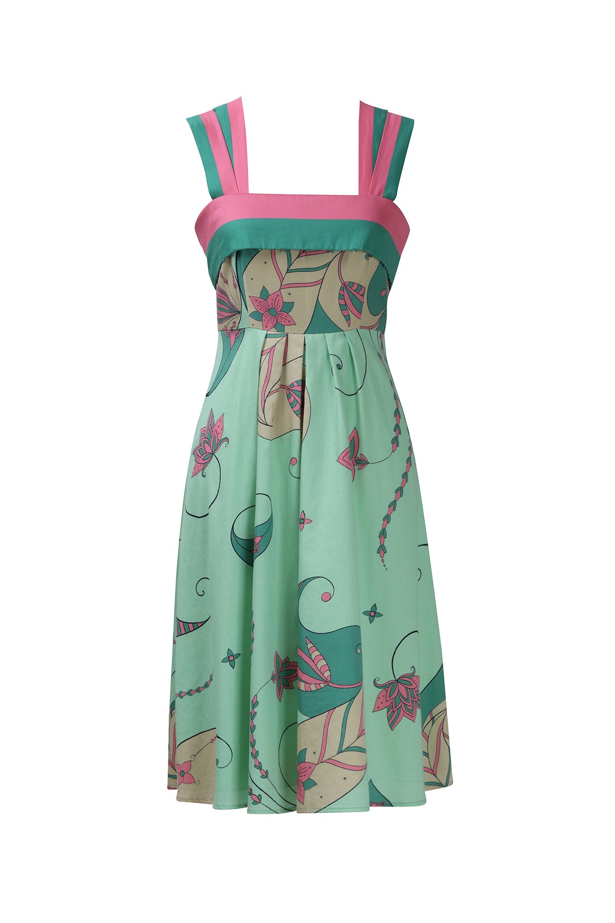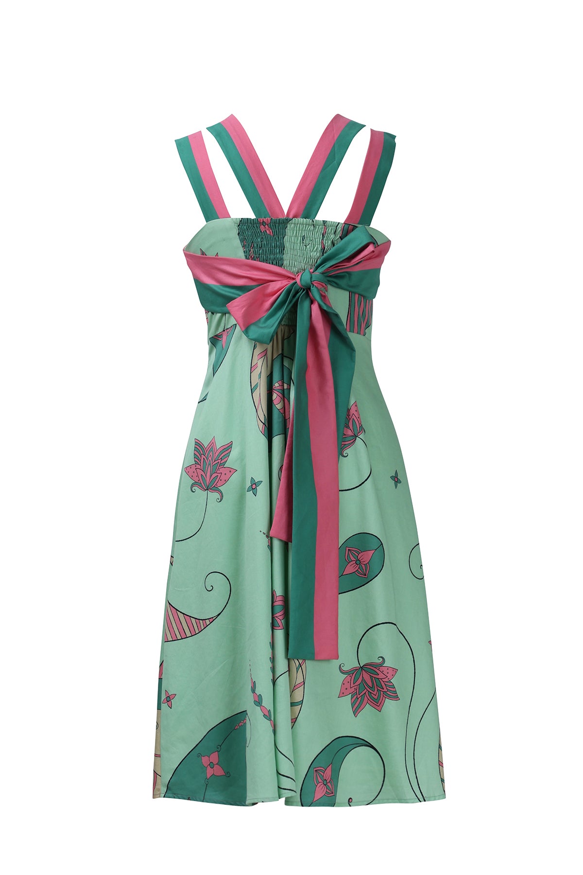 A fresh take on the sundress, this short mint cotton piece combines contemporary paisley with youthful pink-green striped straps. The open back with a tie-up bow adds playful charm, making it ideal for sunny destinations, poolside lounging, or resort evenings.