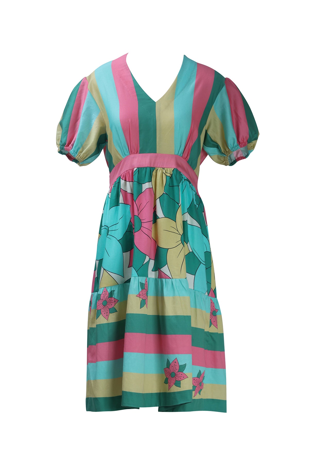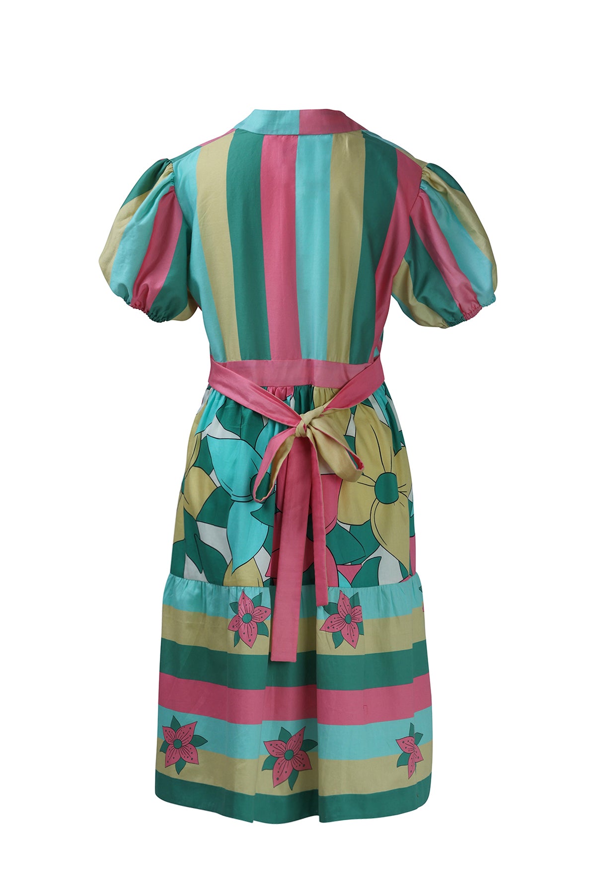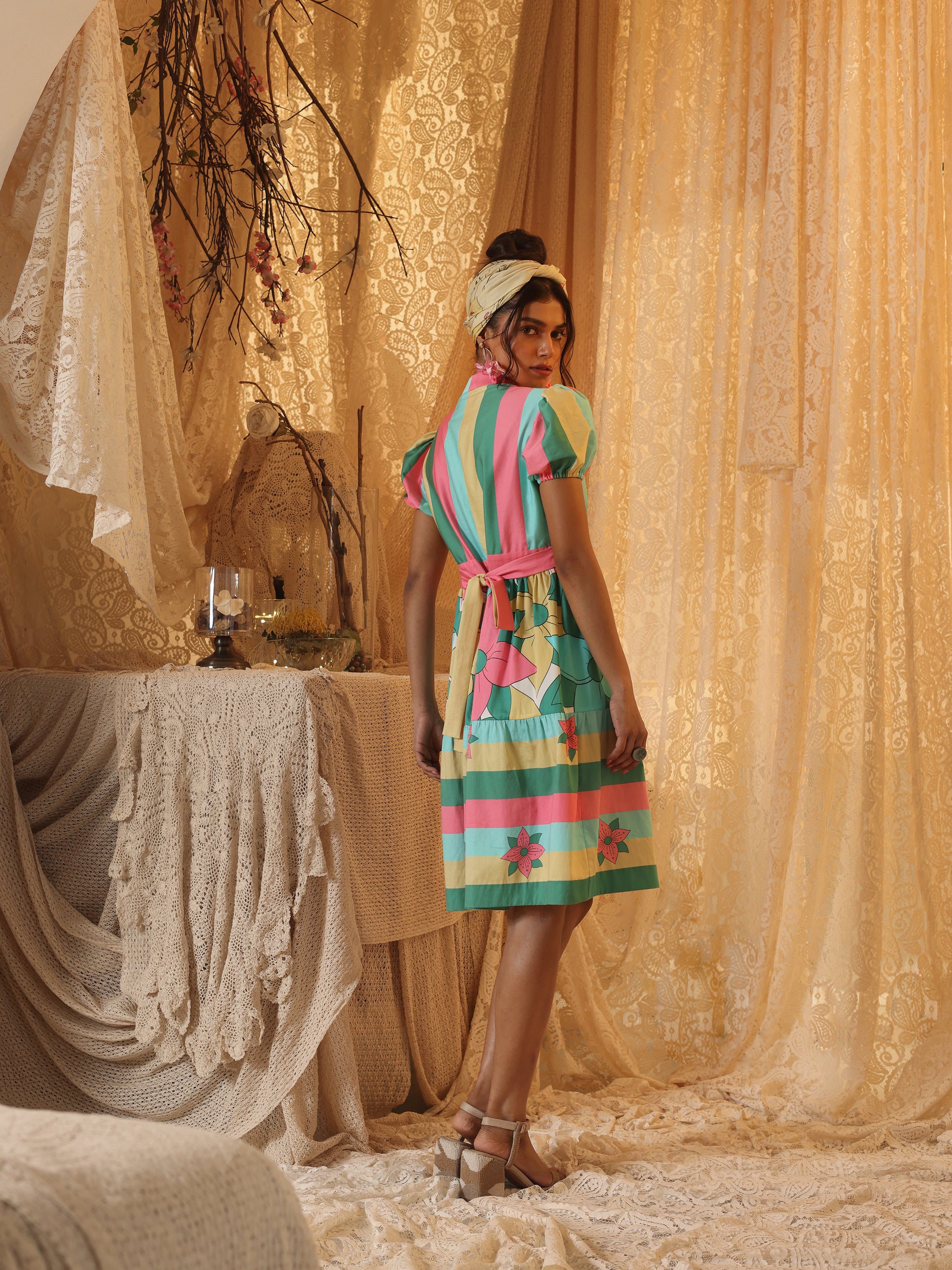 Feminine and flirty, this tiered short dress features playful multicolor stripes and oversized florals. The back tie-up adds a charming detail, while the breathable fabric and flattering silhouette make it a summer essential. Perfect for twirling at garden parties or sipping cocktails by the beach.
