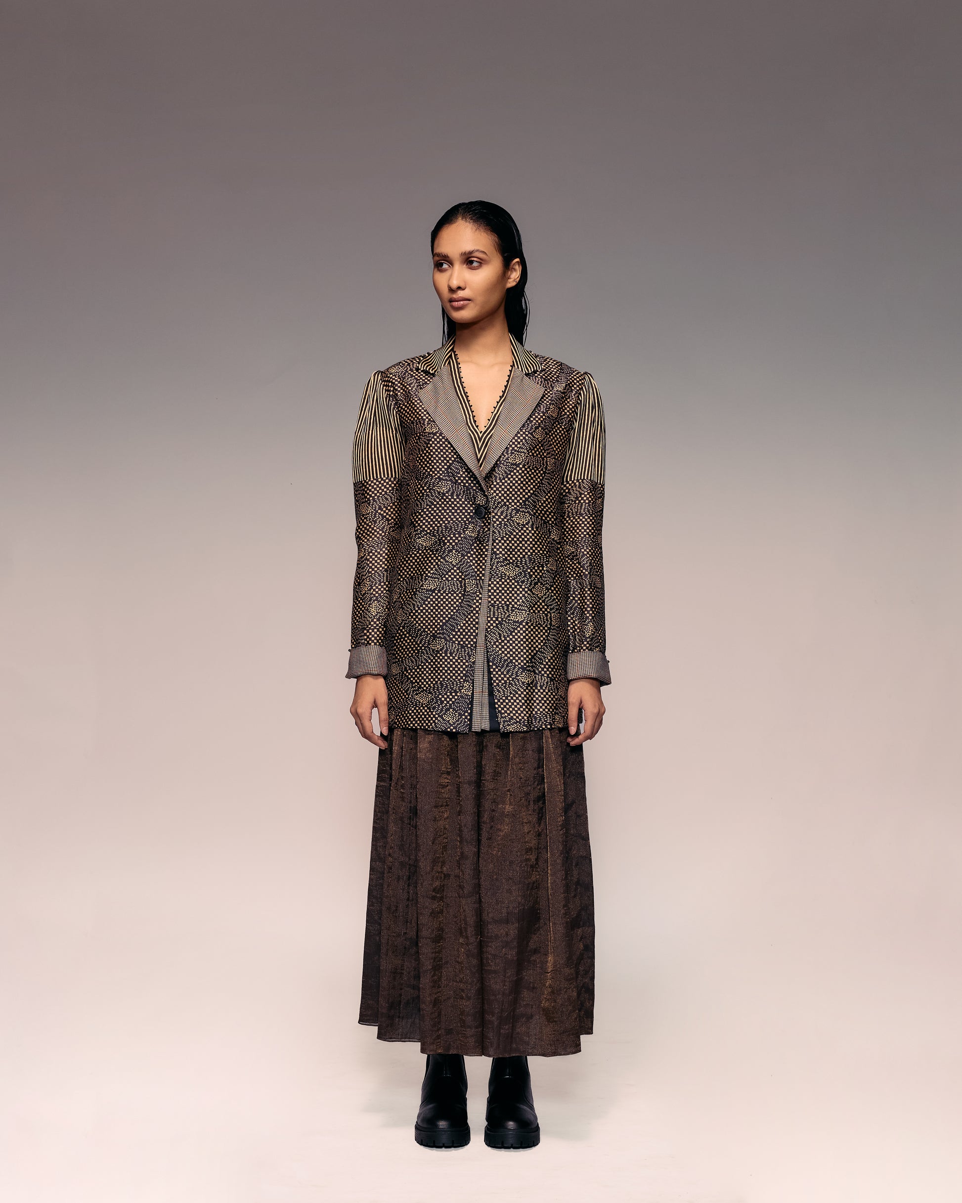 A statement of luxury craftsmanship, the Munga Silk Patch Blazer features panels of Ajrakh stripe, houndstooth, and checkered silk seamlessly joined with impeccable tailoring. The subtle sheen of munga silk adds richness, while fine stitching ensures structure and comfort. The patchwork artistry creates a bold yet elegant appeal. Pair with the matching dress or handloom skirt for a refined ensemble. Perfect for winter soirées, or art-inspired events.