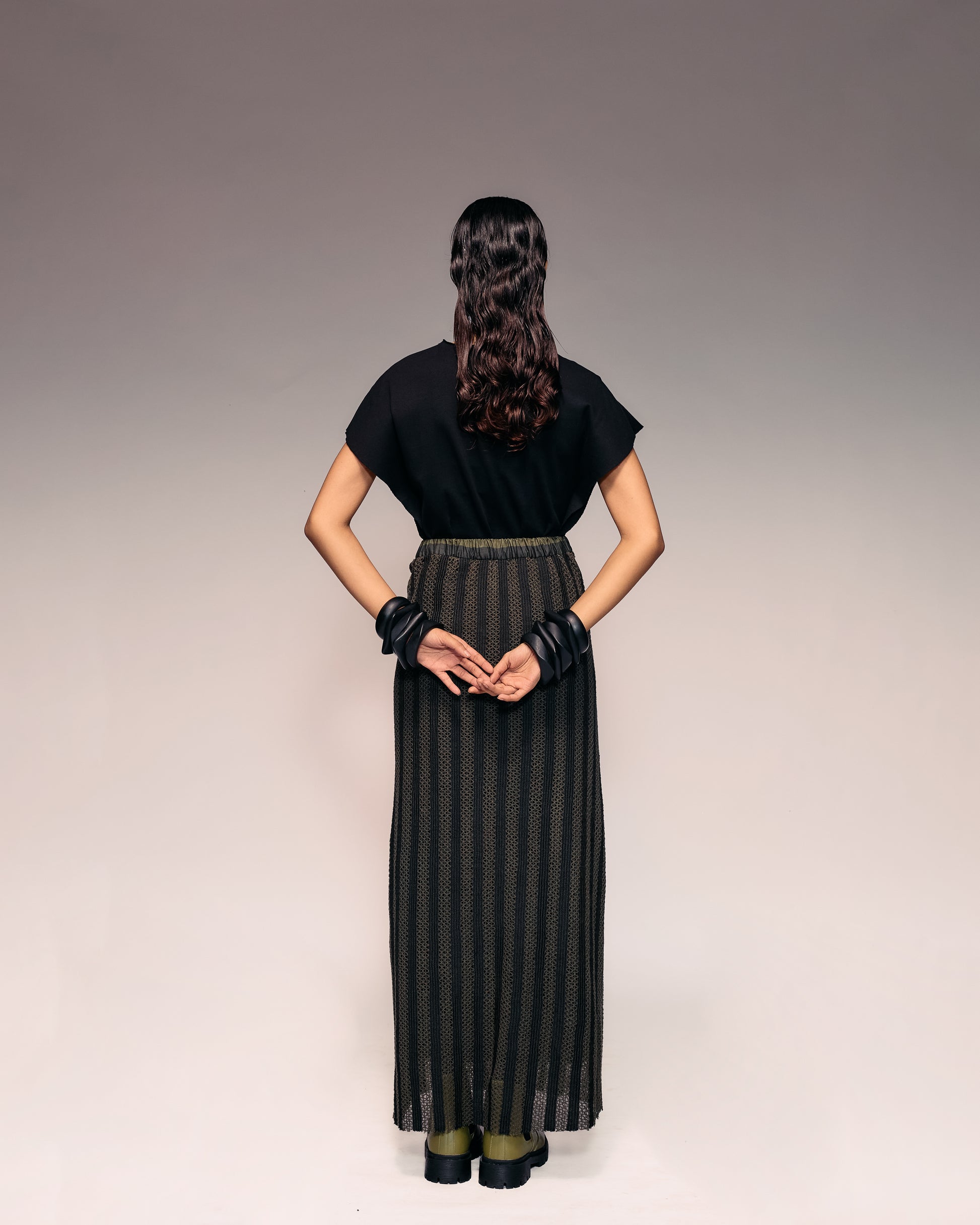 Crafted in breathable cotton-net fabric, the Olive Black Stripe Skirt combines a straight silhouette with fluid structure. The olive and black stripes create a refined earthy contrast, while expert stitching ensures a flawless fall. Lightweight yet premium, it transitions effortlessly from day to evening wear. Pair it with solid tops, bralettes, or layered capes for a modern artisanal look. Ideal for spring and summer outings, resort vacations, or trendy fashion gatherings with a relaxed luxury vibe.