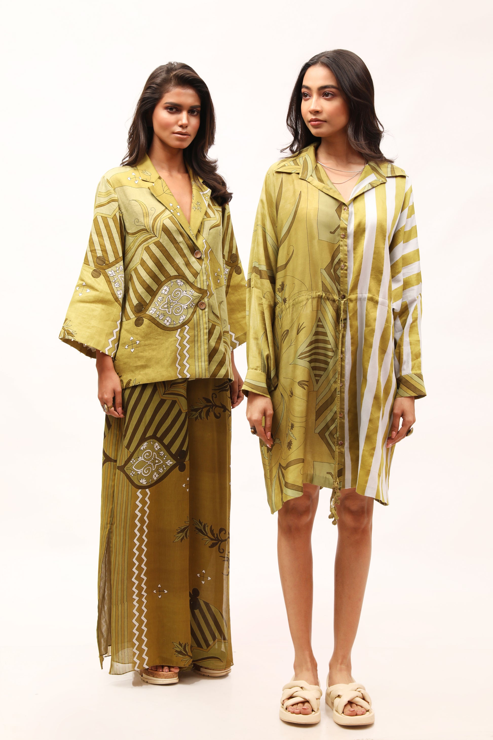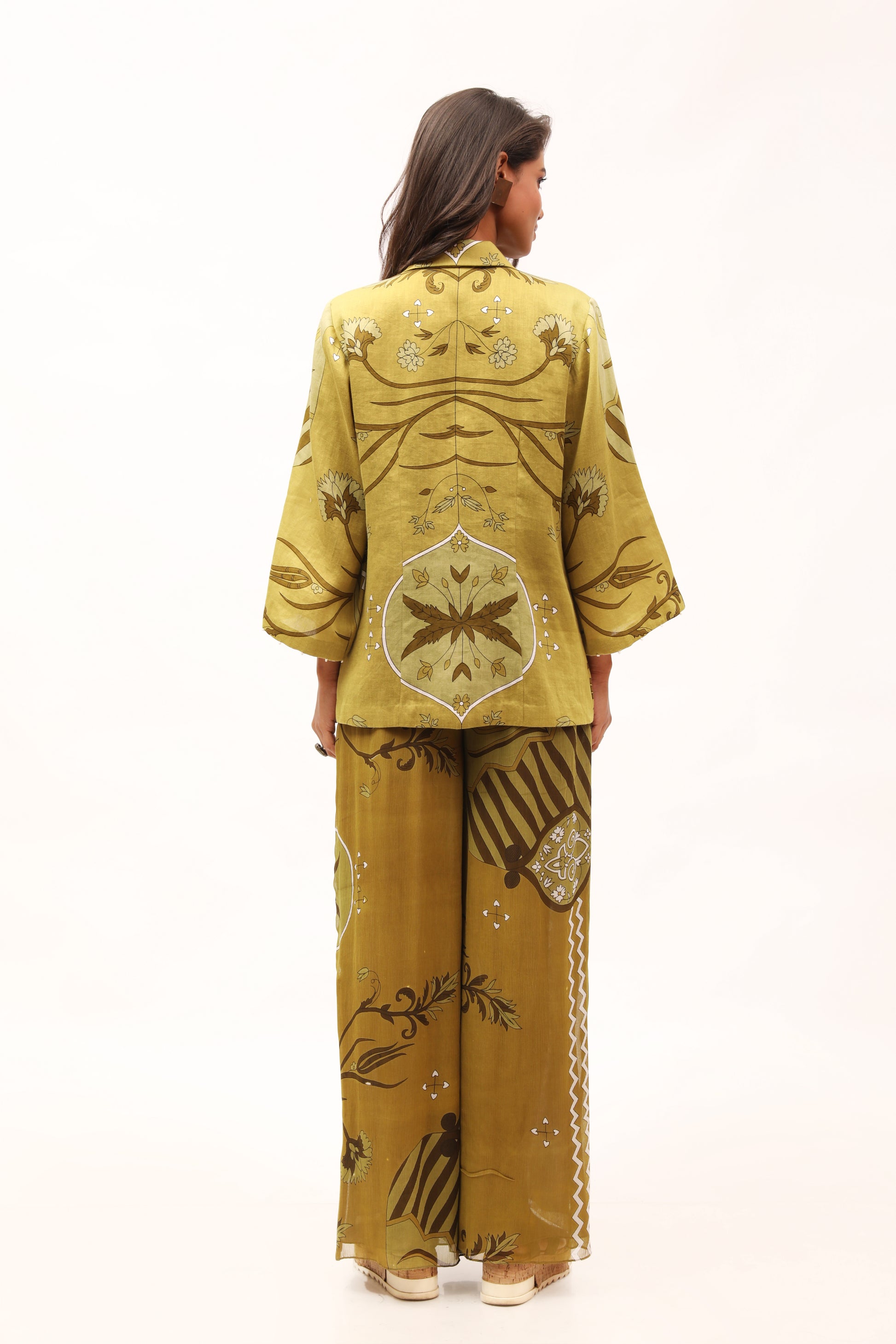 This single-breasted cotton jacket with paisley pattern prints feature a boxy cut with a notched lapel and embroidery knot details on the collar and sleeves. Team it up with the brand's chiffon wide pants with a side slit, in a matching hue.