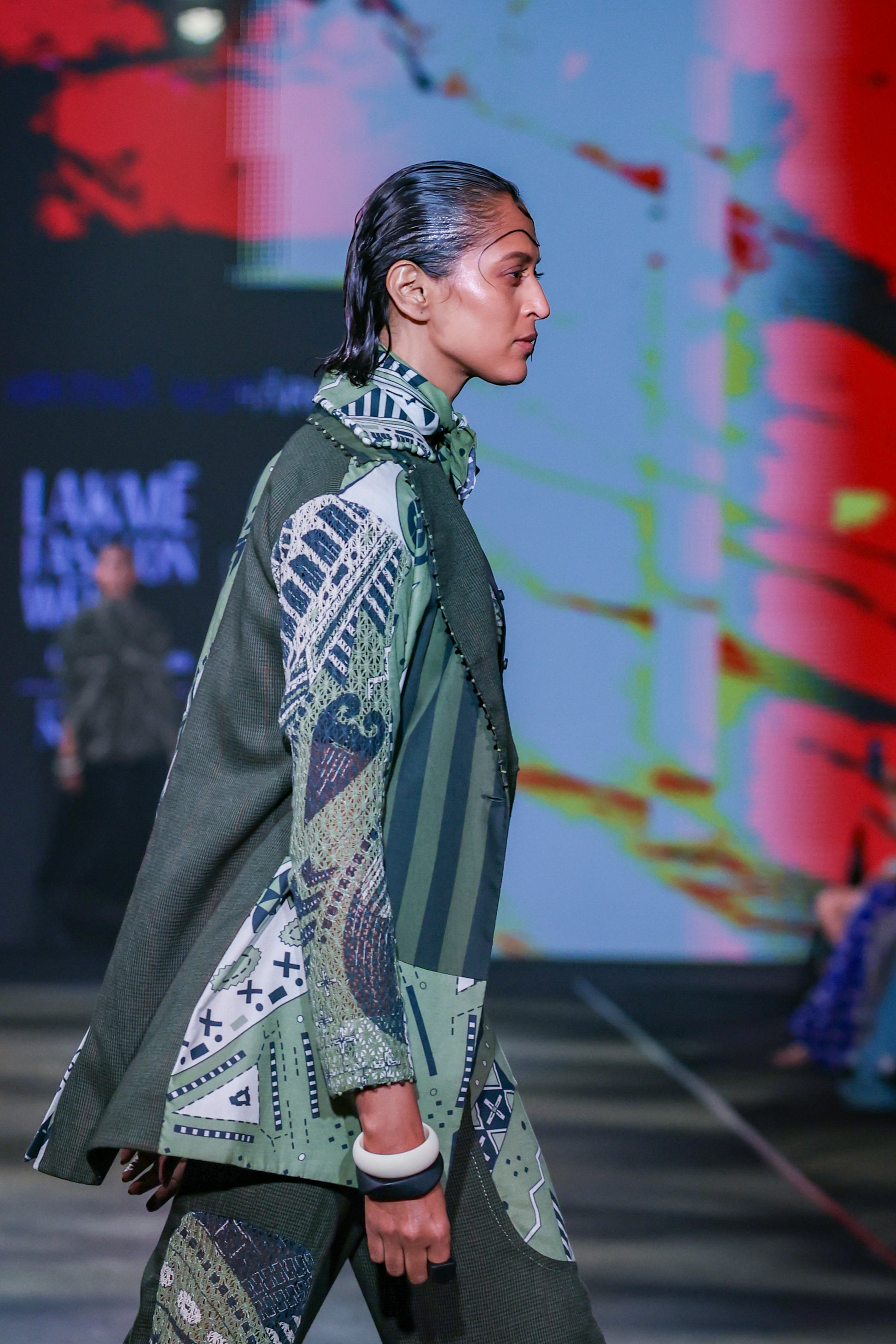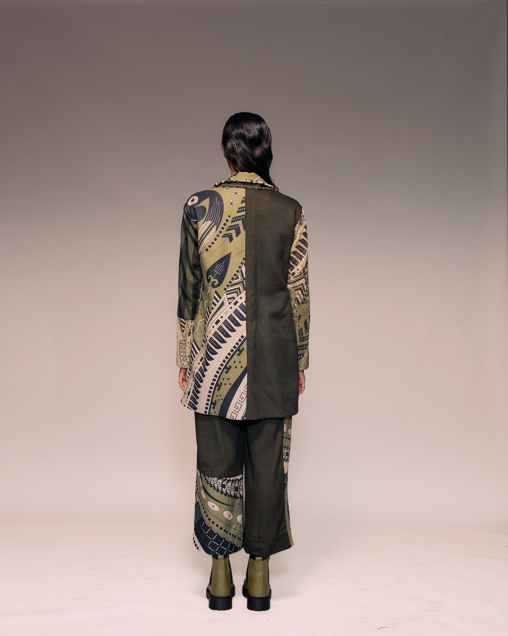 The Olive Patch Blazer is a stunning composition of mixed fabrics. The collar, edged with tactile round bead-like detailing, adds a couture touch. Expertly tailored with structured seams, the blazer reflects impeccable craftsmanship and textural harmony. Pair with matching trousers or a plain dress for an elevated, statement ensemble. Ideal for stylish evenings, art showcases, or high-end wear.