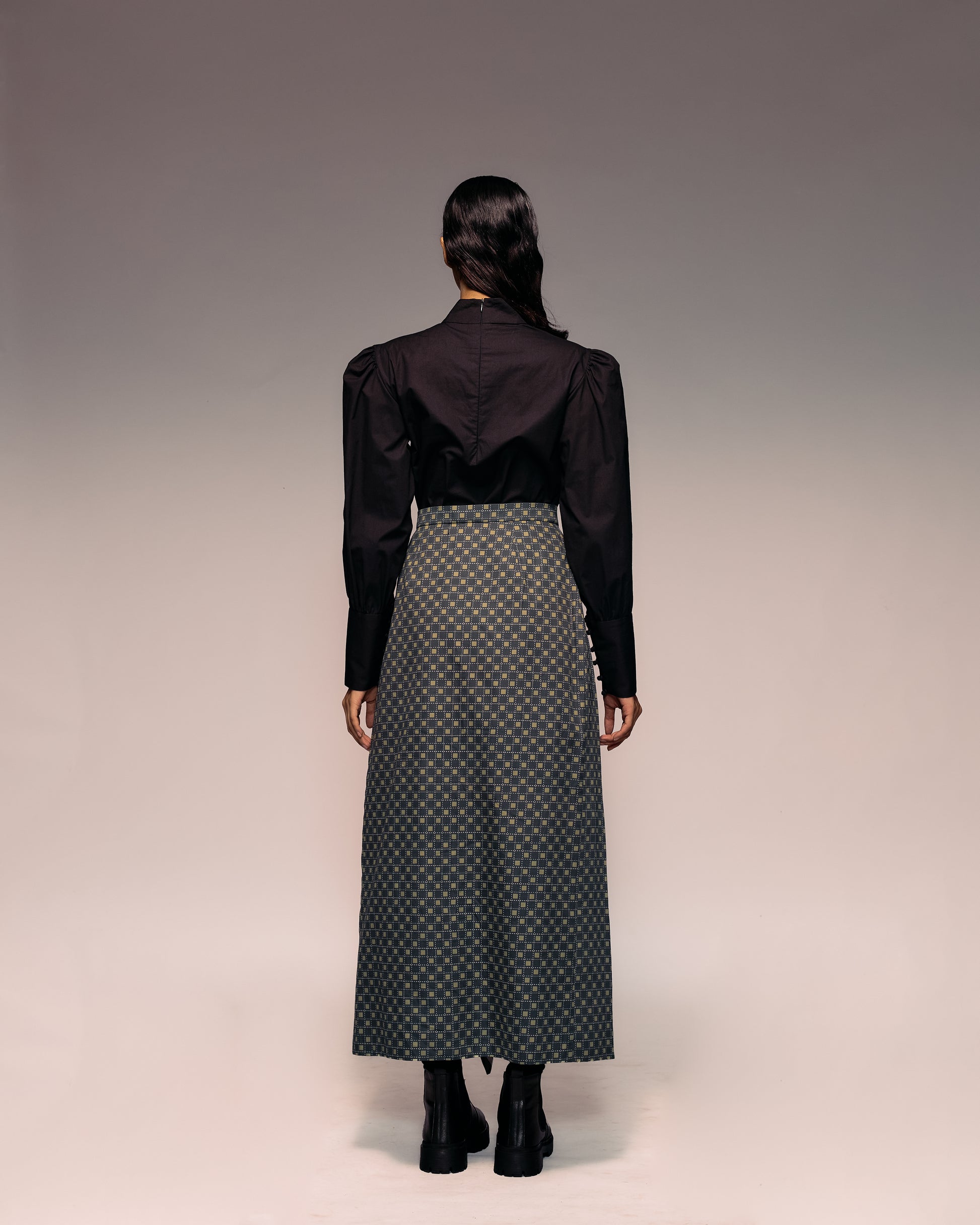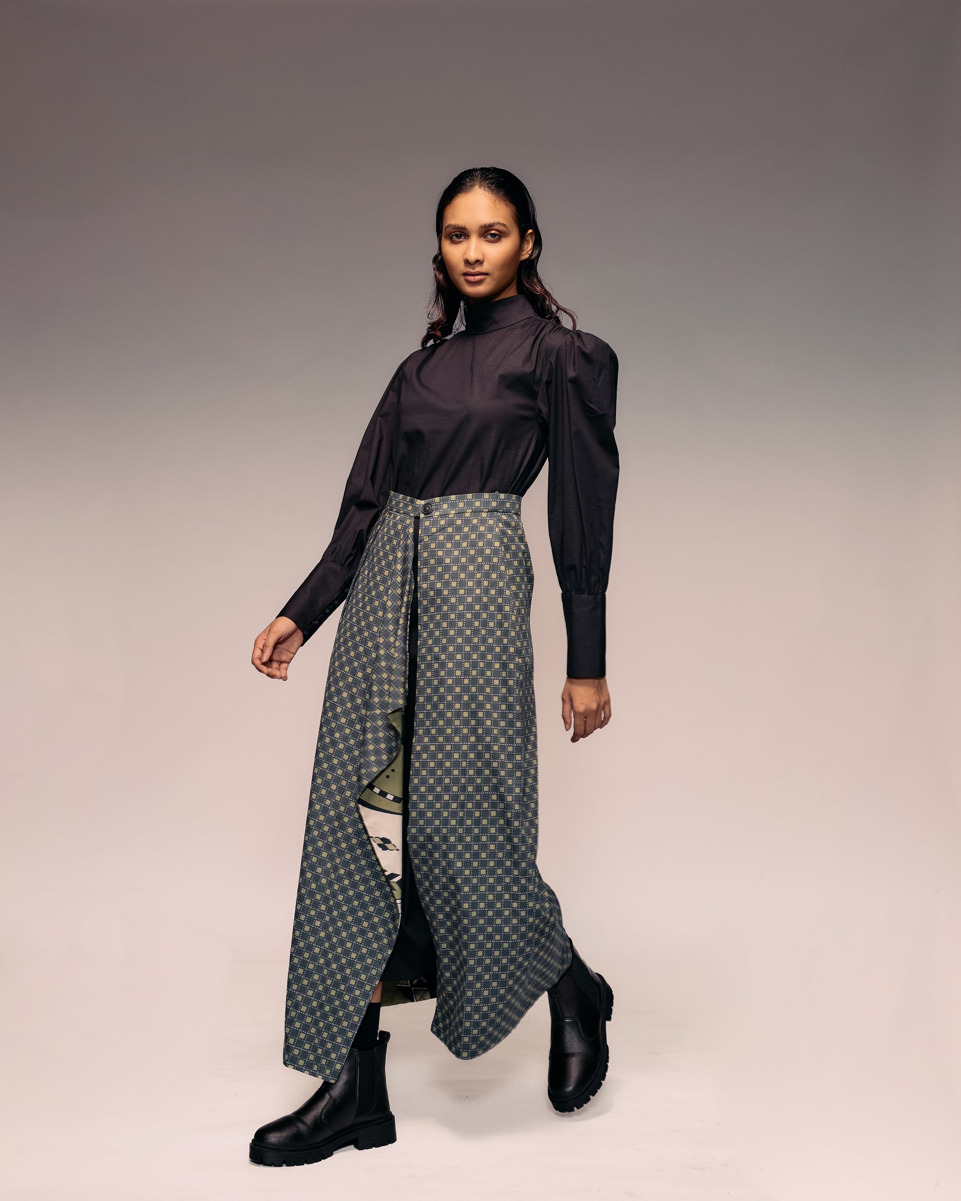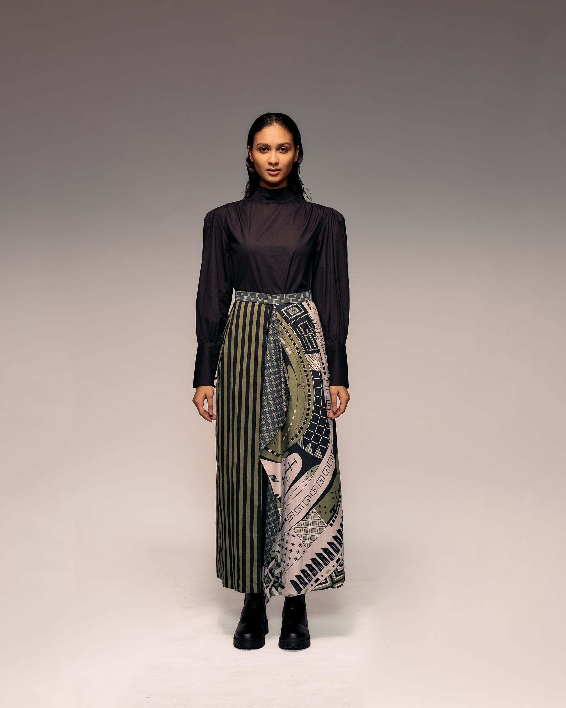An artistic fusion of prints and textures, this reversible overlap skirt combines olive pottery prints, bold stripes, and black-rust checks in seamless harmony. Crafted from breathable cotton-satin, it offers soft structure and a fluid drape. The high-quality tailoring ensures perfect alignment of patterns and a polished finish. Pair it with a solid blouse or the matching striped top for a coordinated statement look. Ideal for contemporary wear, art events, or stylish evenings through warm to mild seasons.